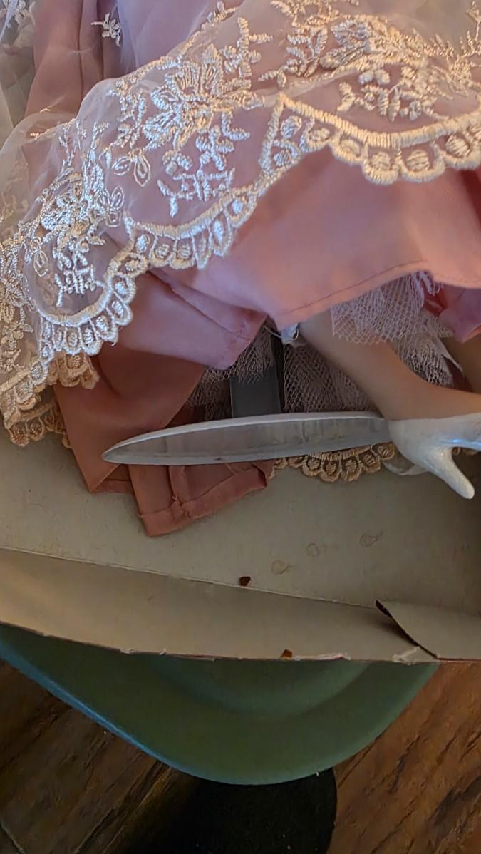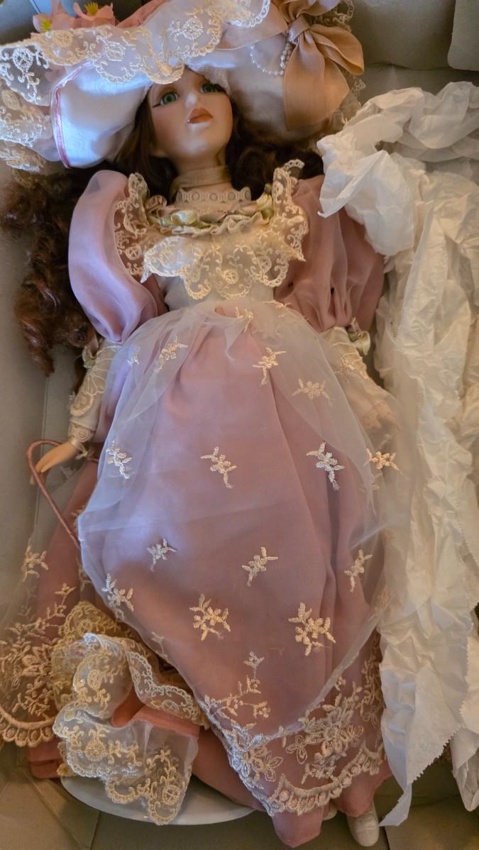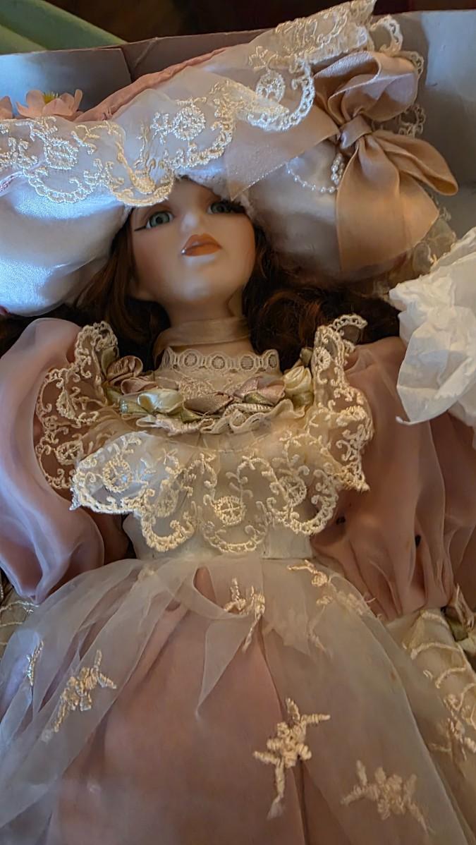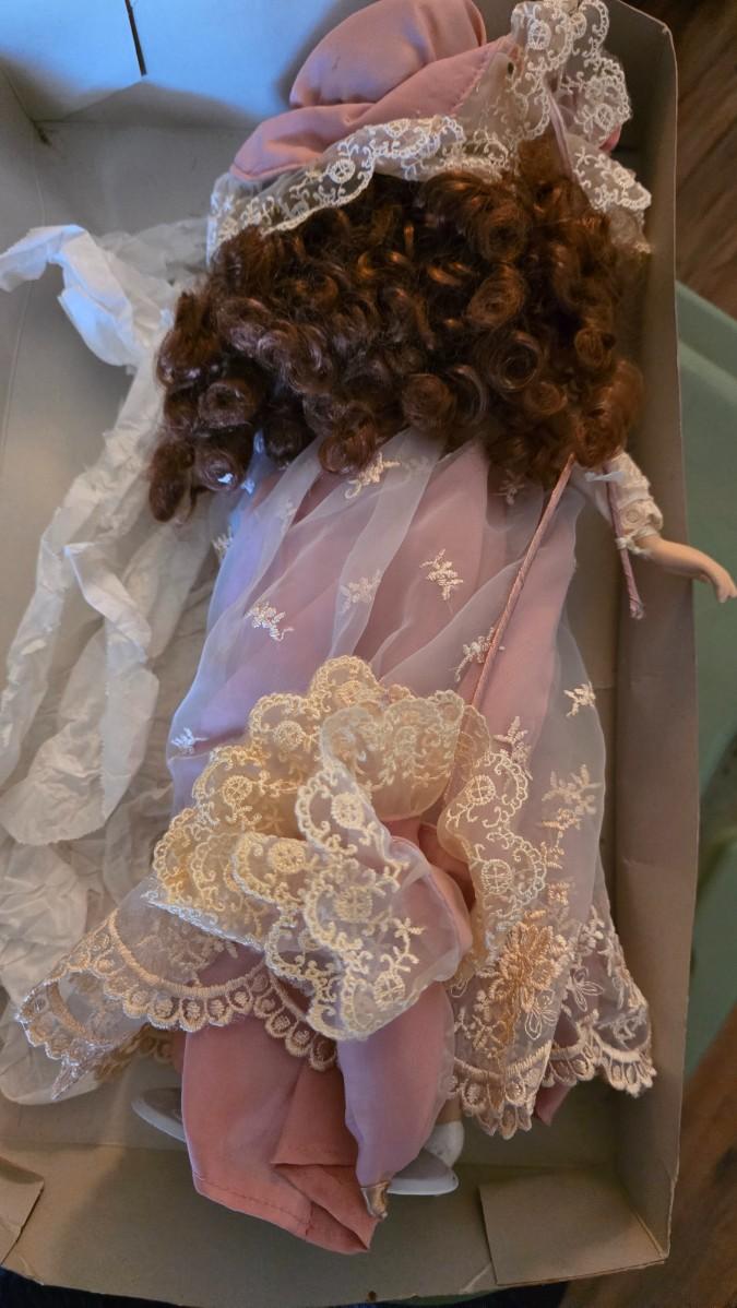 She arrives as a vision from another time, resting gracefully in her presentation box with layers of soft pink fabric and flowing lace. A wide-brimmed bonnet frames her porcelain face, giving the impression of a lady prepared for a quiet afternoon in a grand Victorian garden. Her curled hair, delicate features, and composed posture create a timeless decorative presence meant to be admired.