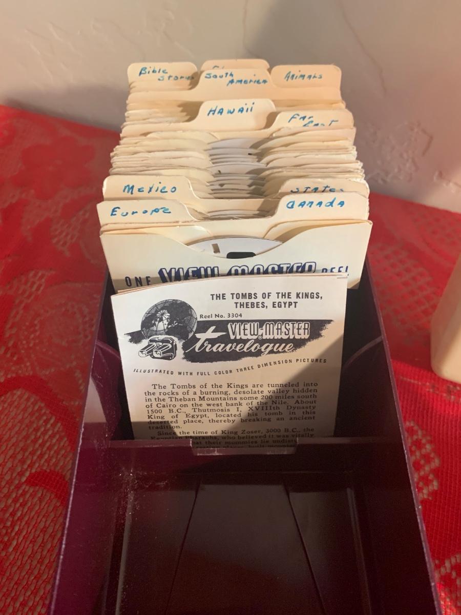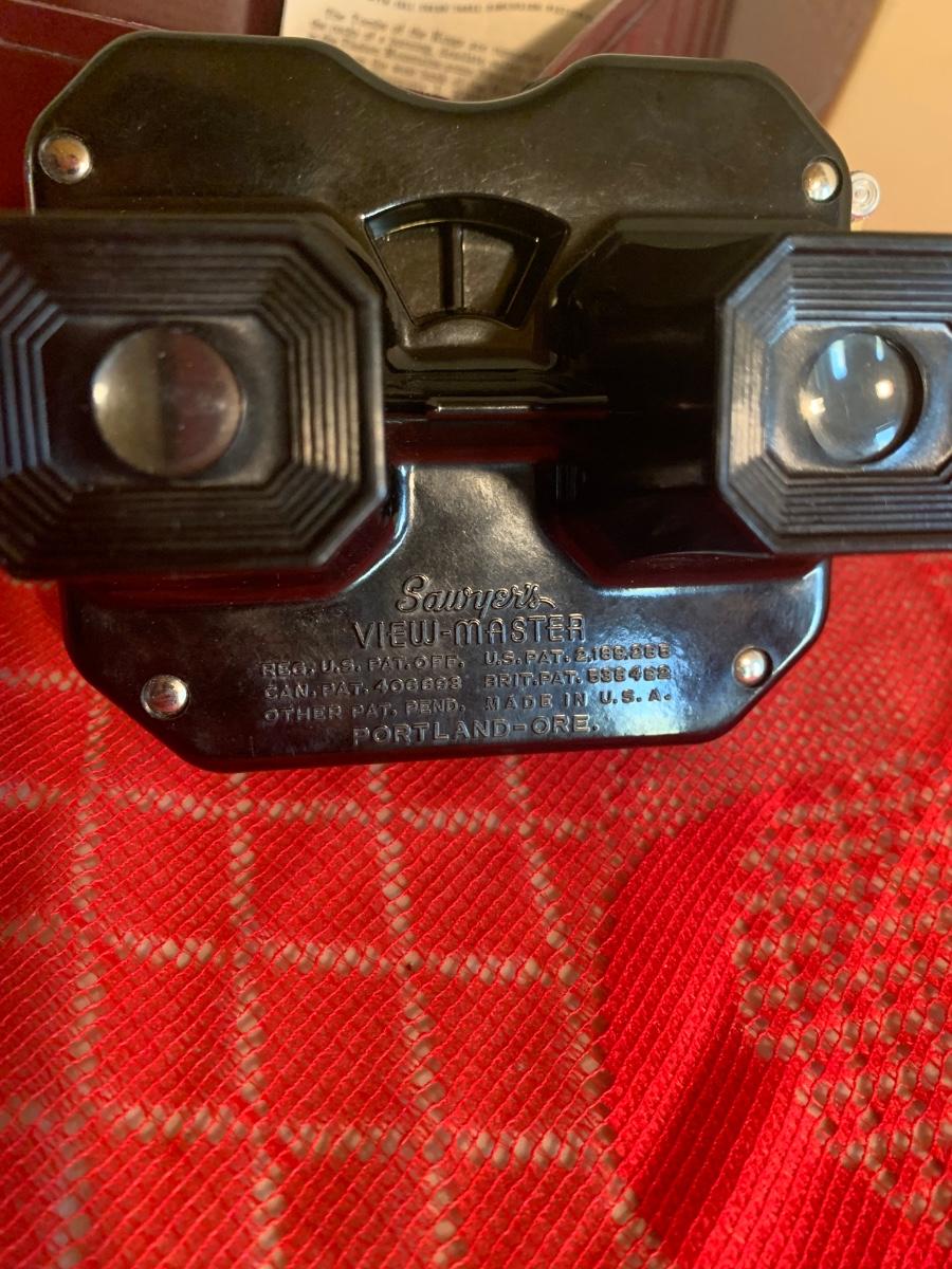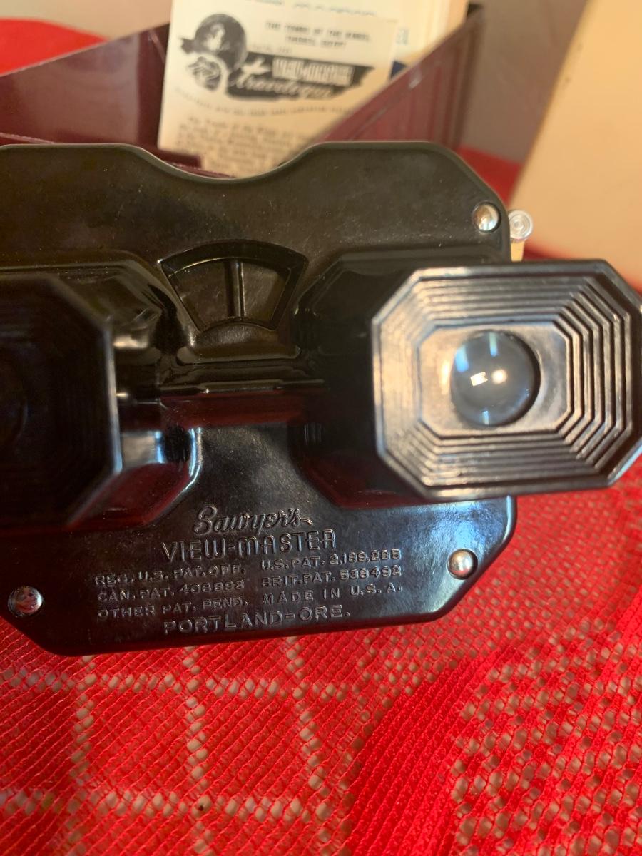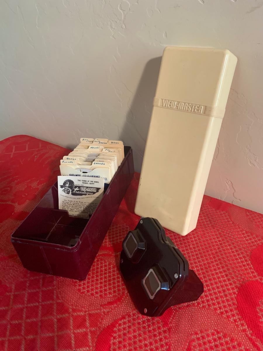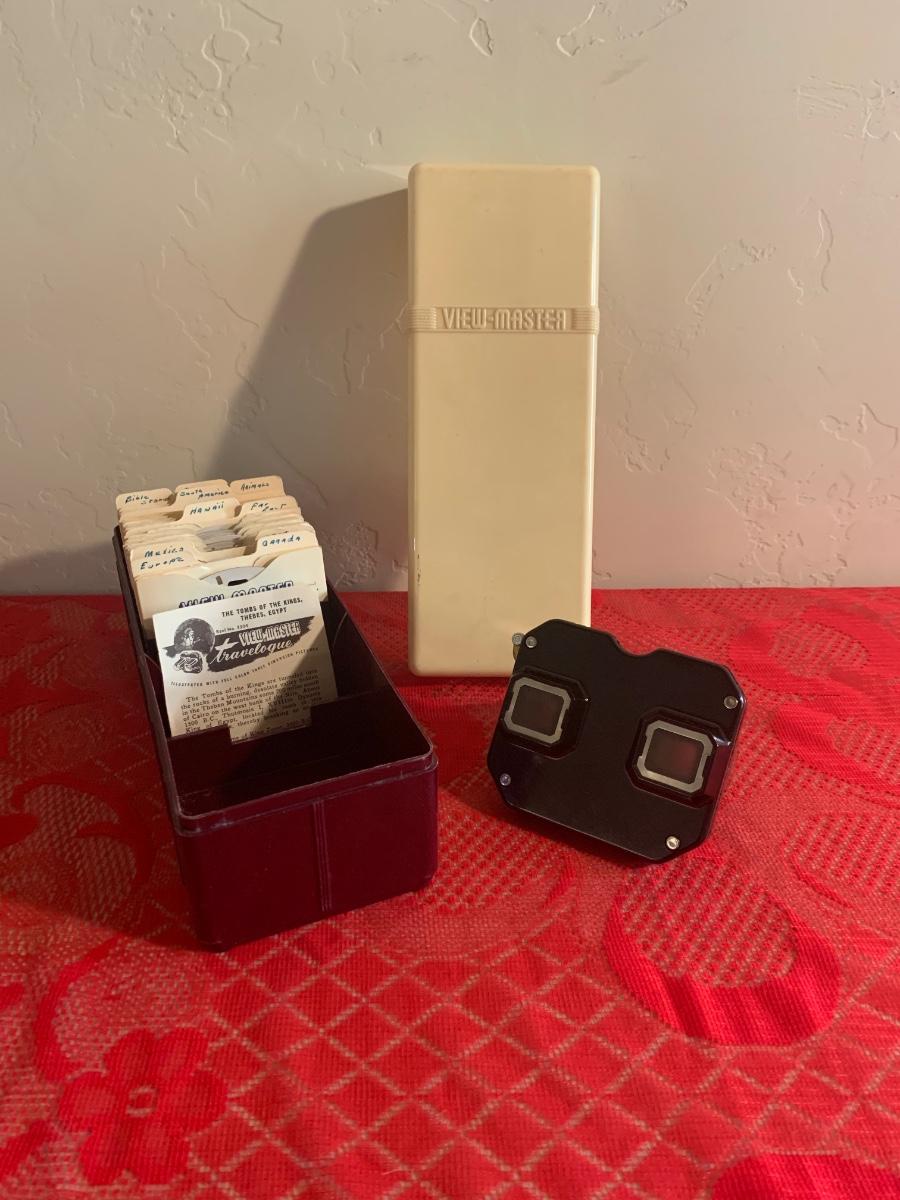 Lot includes a vintage Viewmaster, black, with slides in a Viewmaster branded box.