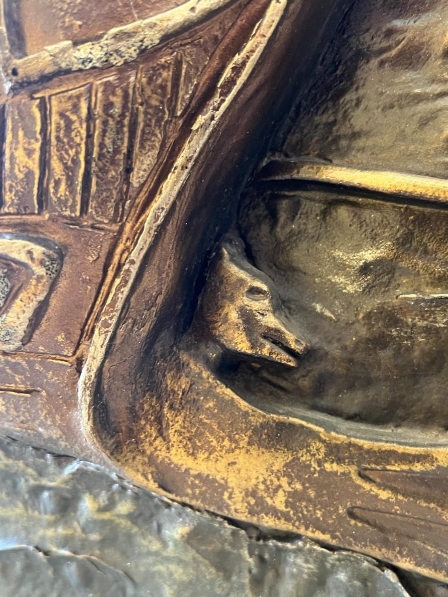 There is some light vintage wear, but there is no significant damage and is in overall good collectible or displayable condition. Roughly 26"x48" size. Seems to be made of a hard plastic material similar to Syroco wall art. Check pictures for more details and for sizing.