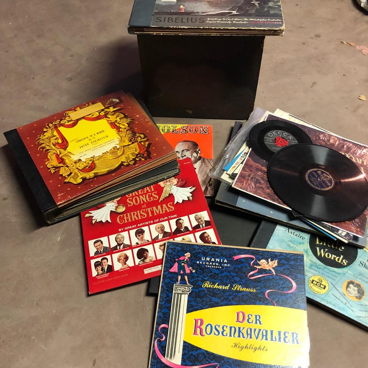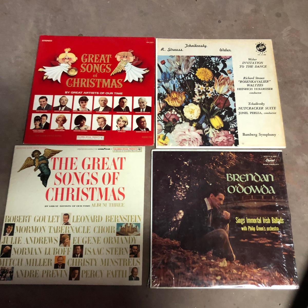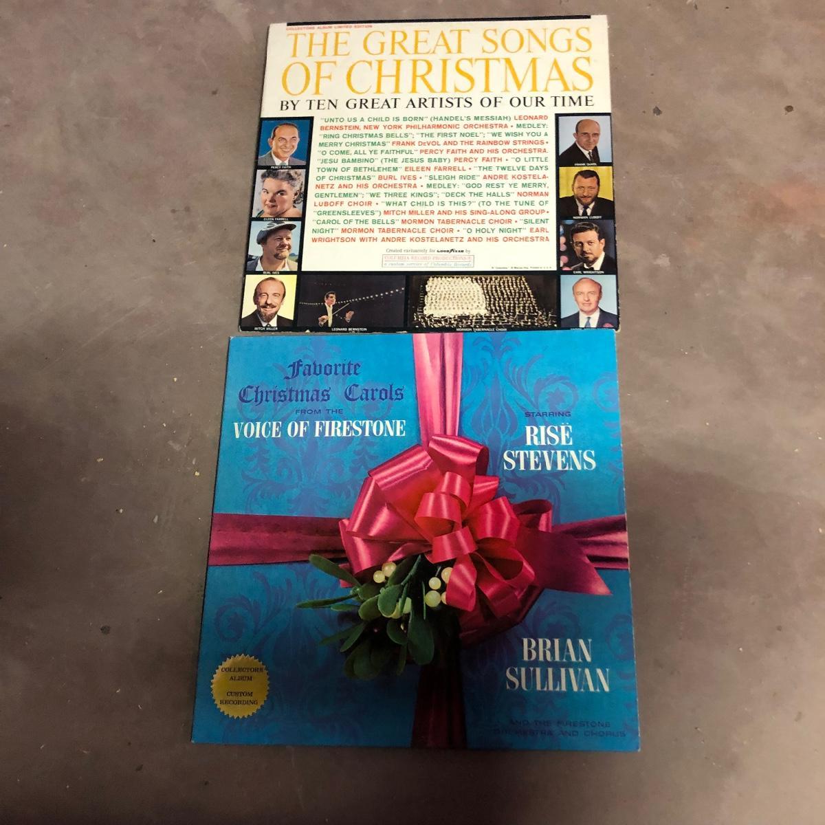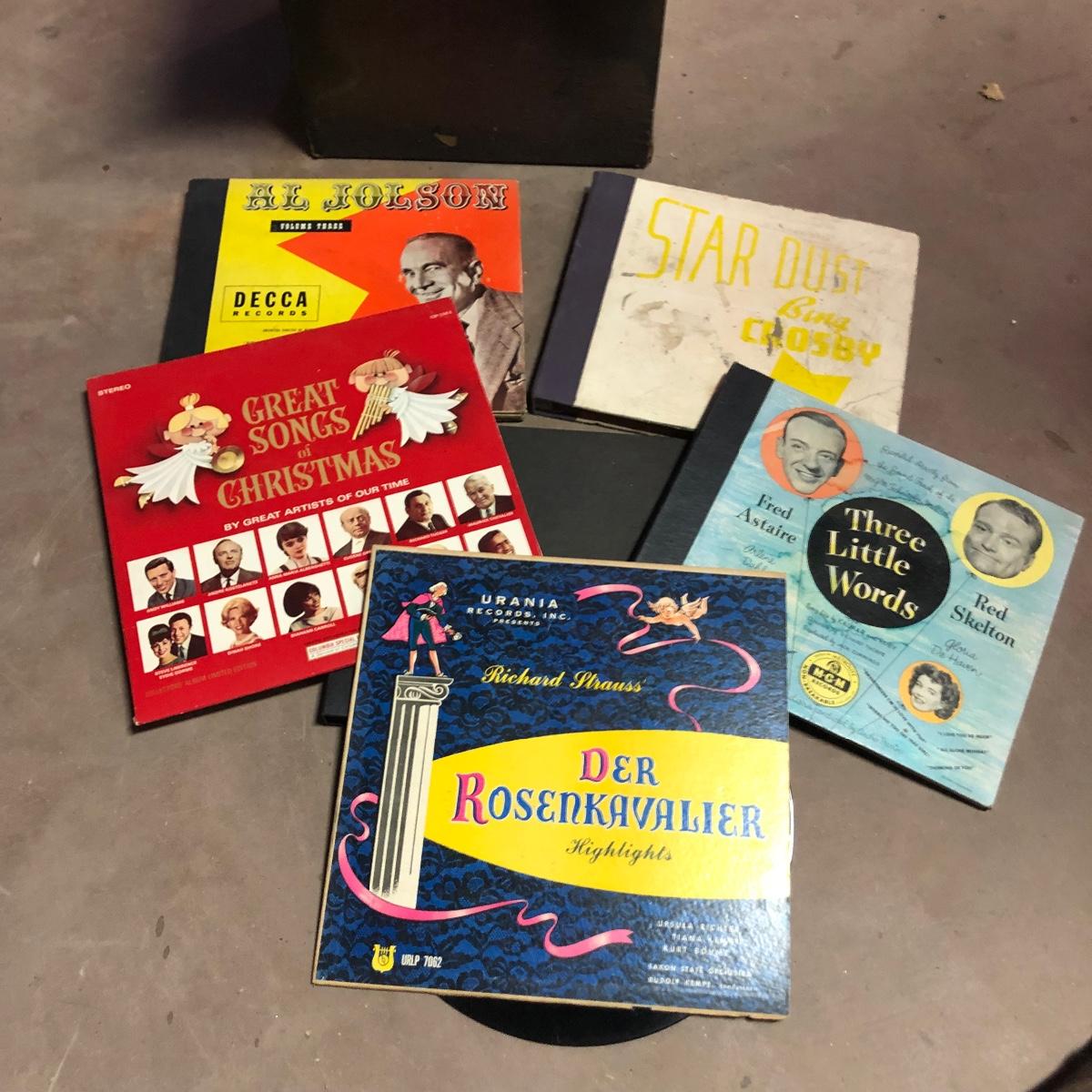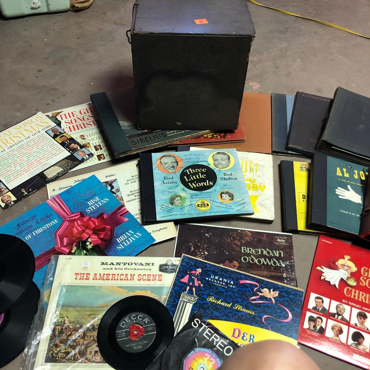 Lot contains a collection of vintage vinyl including Mantovani, Al Jolson, Fred Astaire, Percy Faith and more. Also includes a vintage record box.