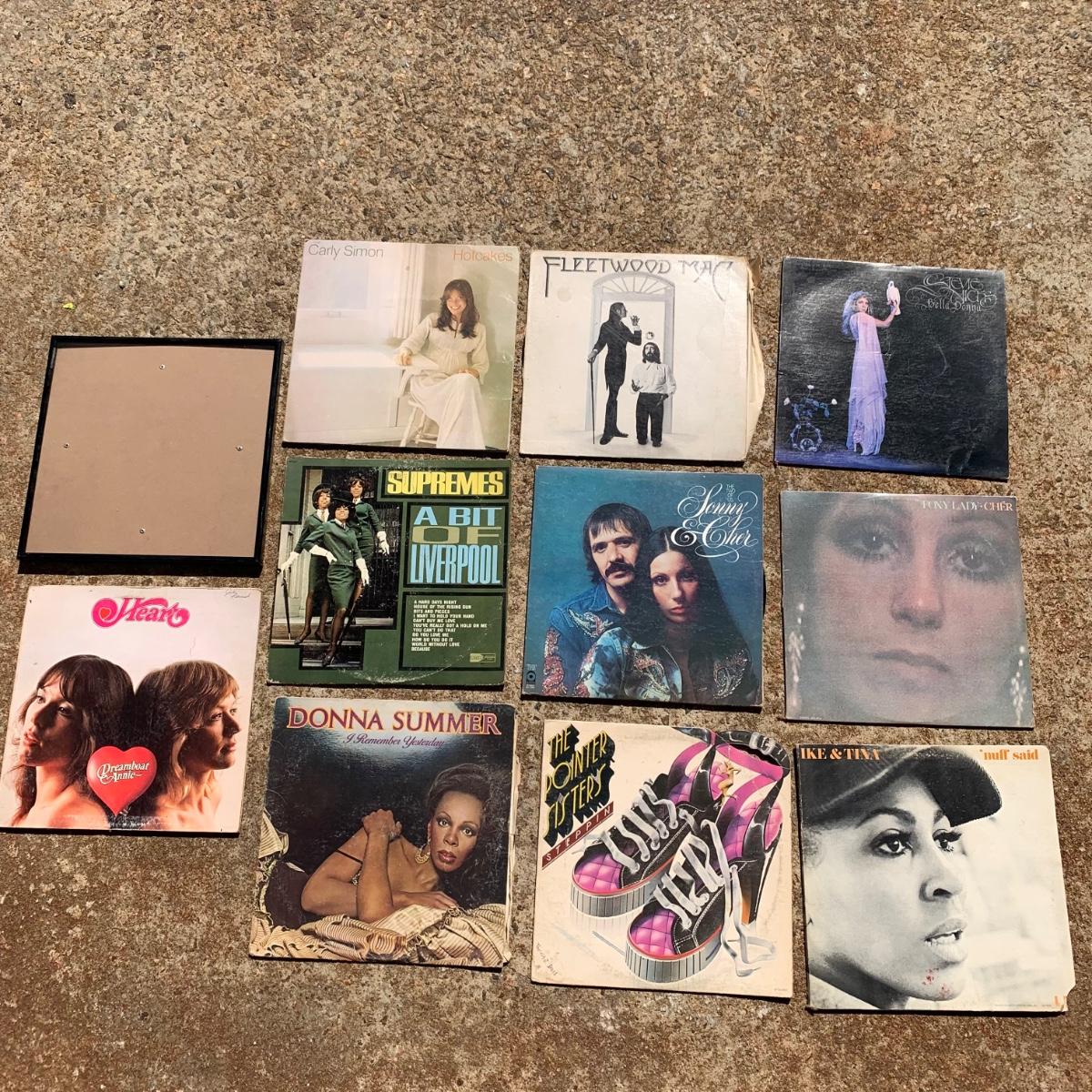 This lot contains 10 LP record albums, all featuring fabulous female musicians. You’ll find music here from Fleetwood Mac, Stevie Nicks, Sonny & Cher, Ike & Tina, Carly Simon, The Pointer Sisters, The Supremes, Donna Summer, & Heart. These are all used albums with worn covers. A black plastic album cover frame with a glass front is included for you to fill with your favorite album cover. Shipping available.