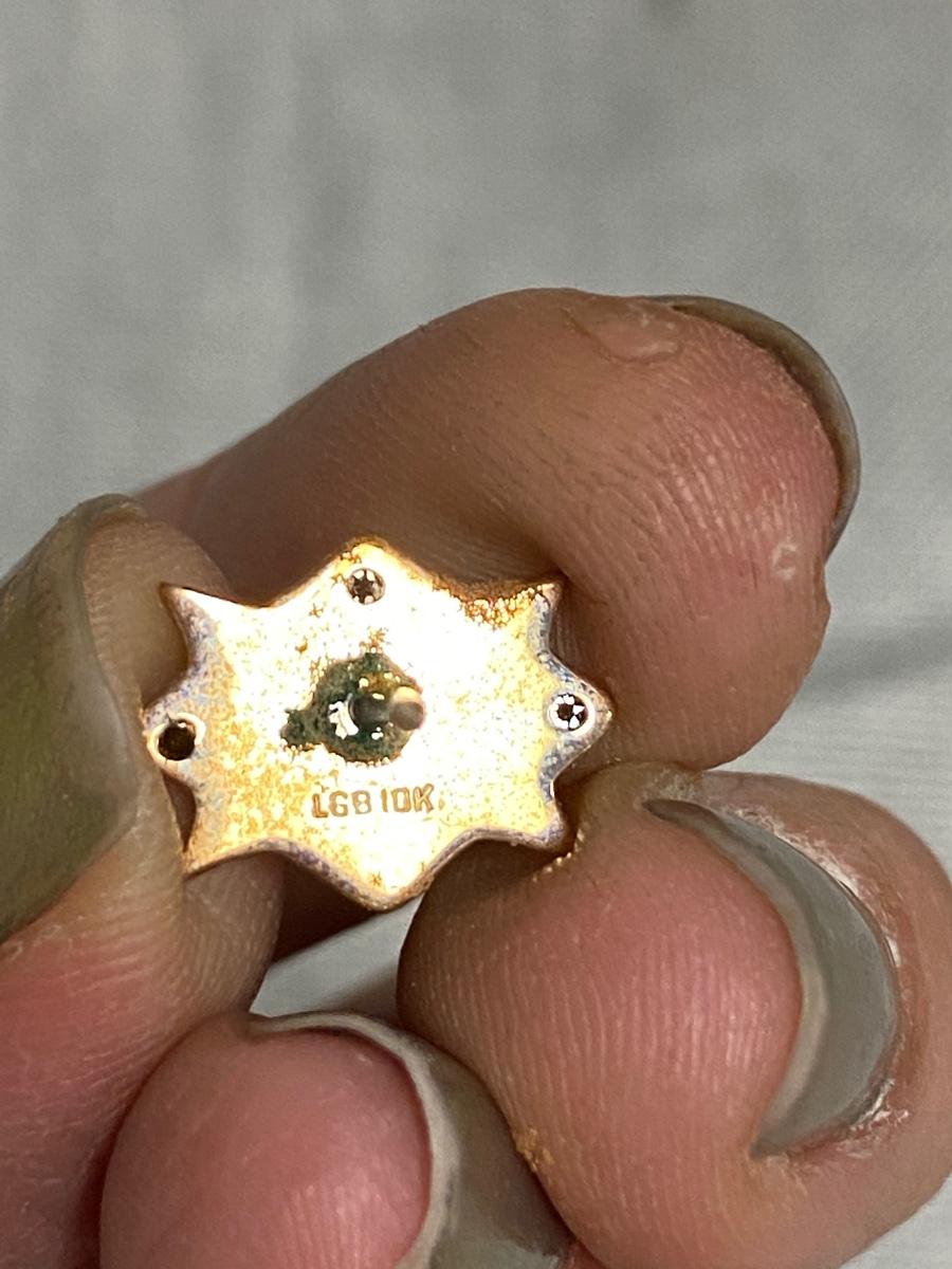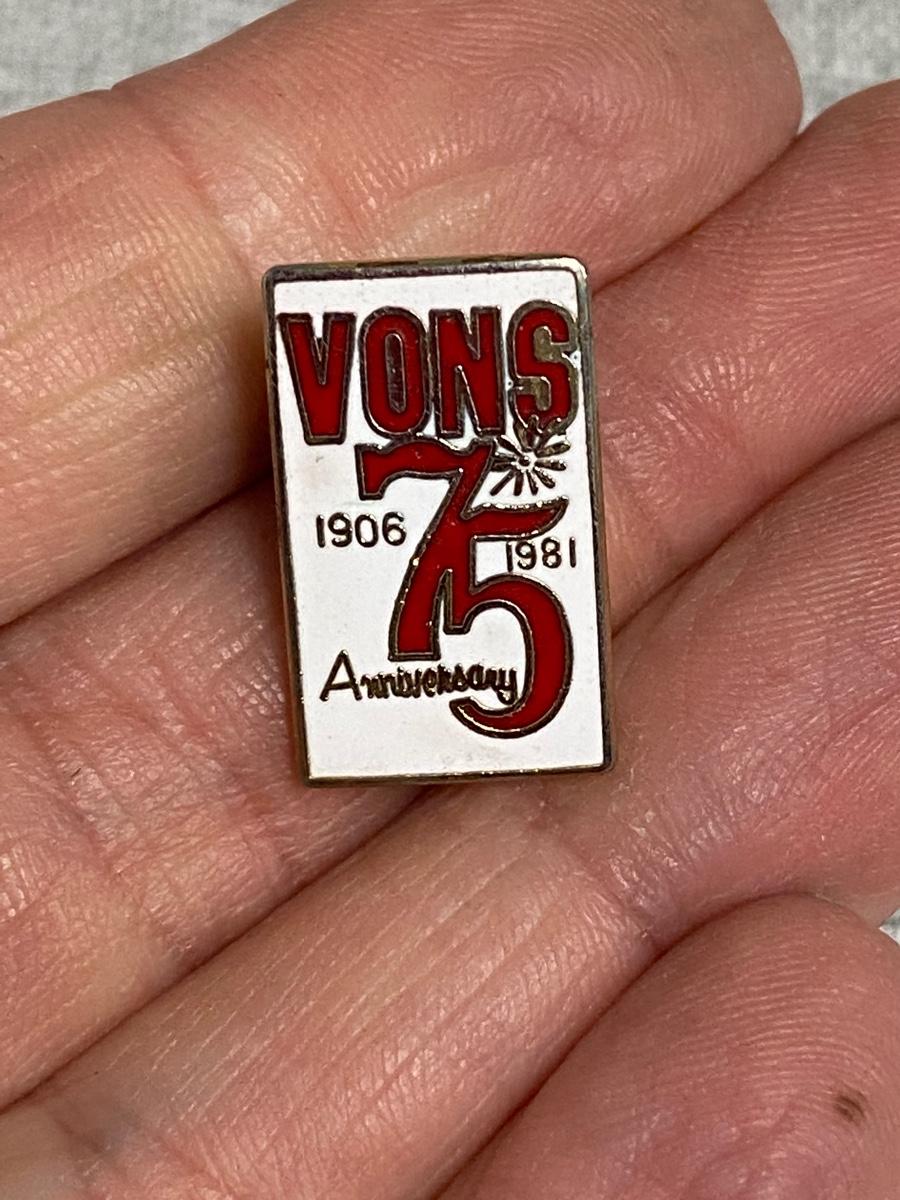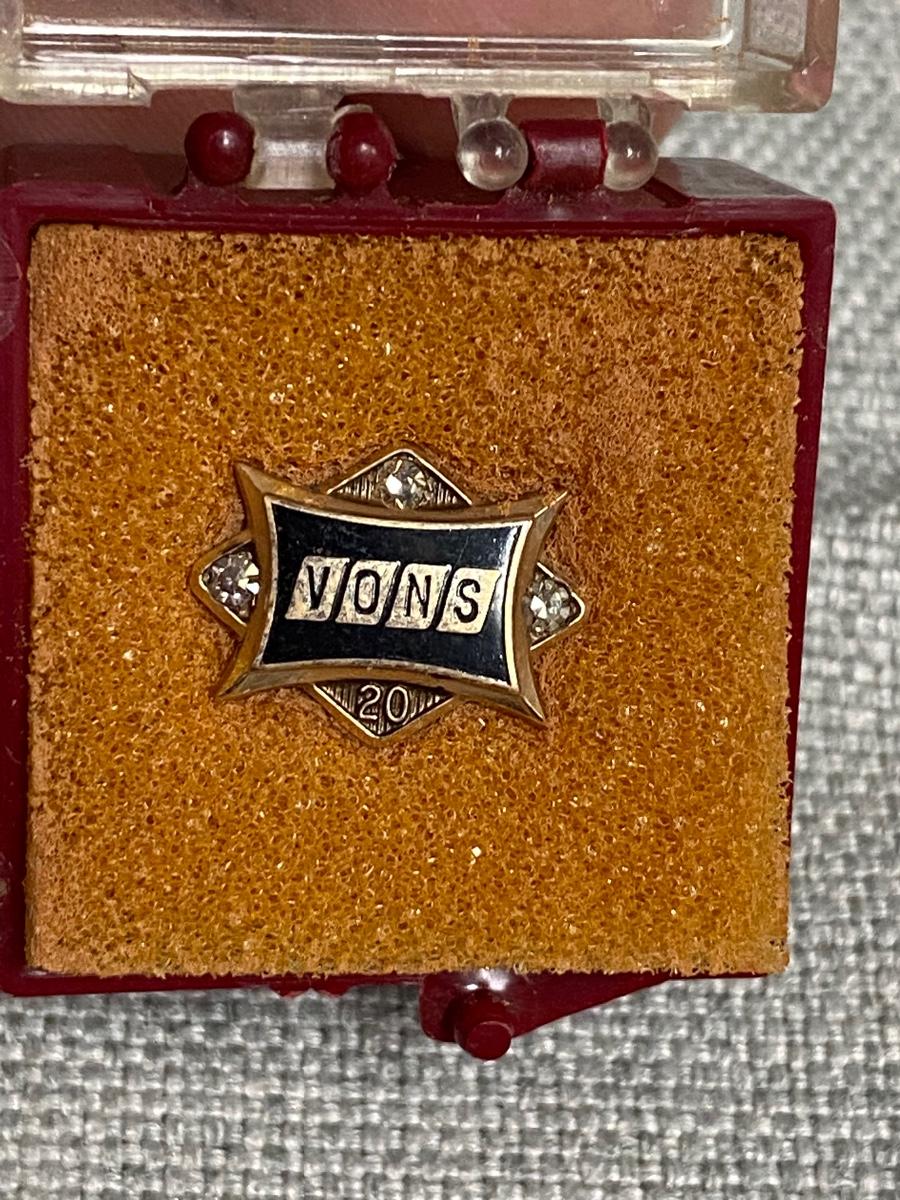 Vintage Vons grocery pins. 4 various enameled lapel pins and a service pin. Service pin is 10k gold 20 year service pin. It does have 3 small stones set in the sides. Comes in a small plastic box.