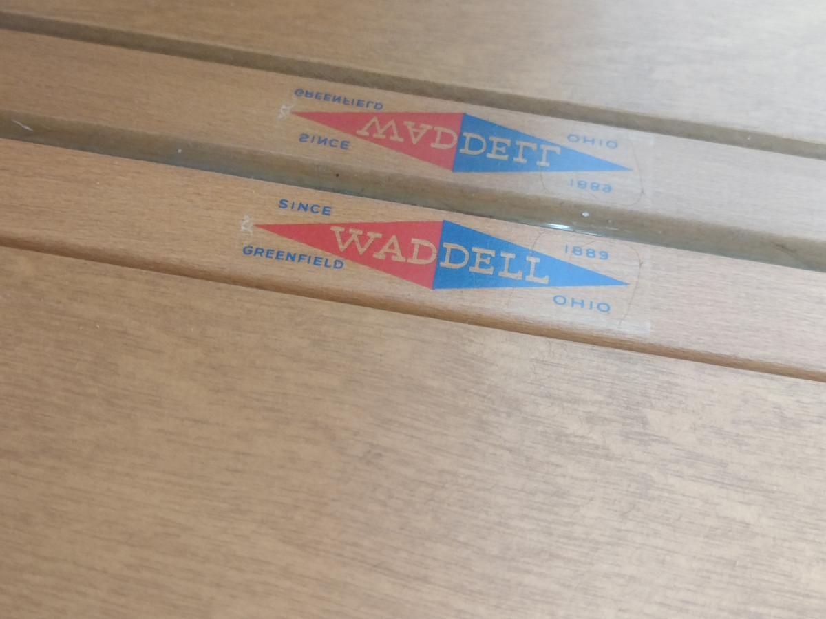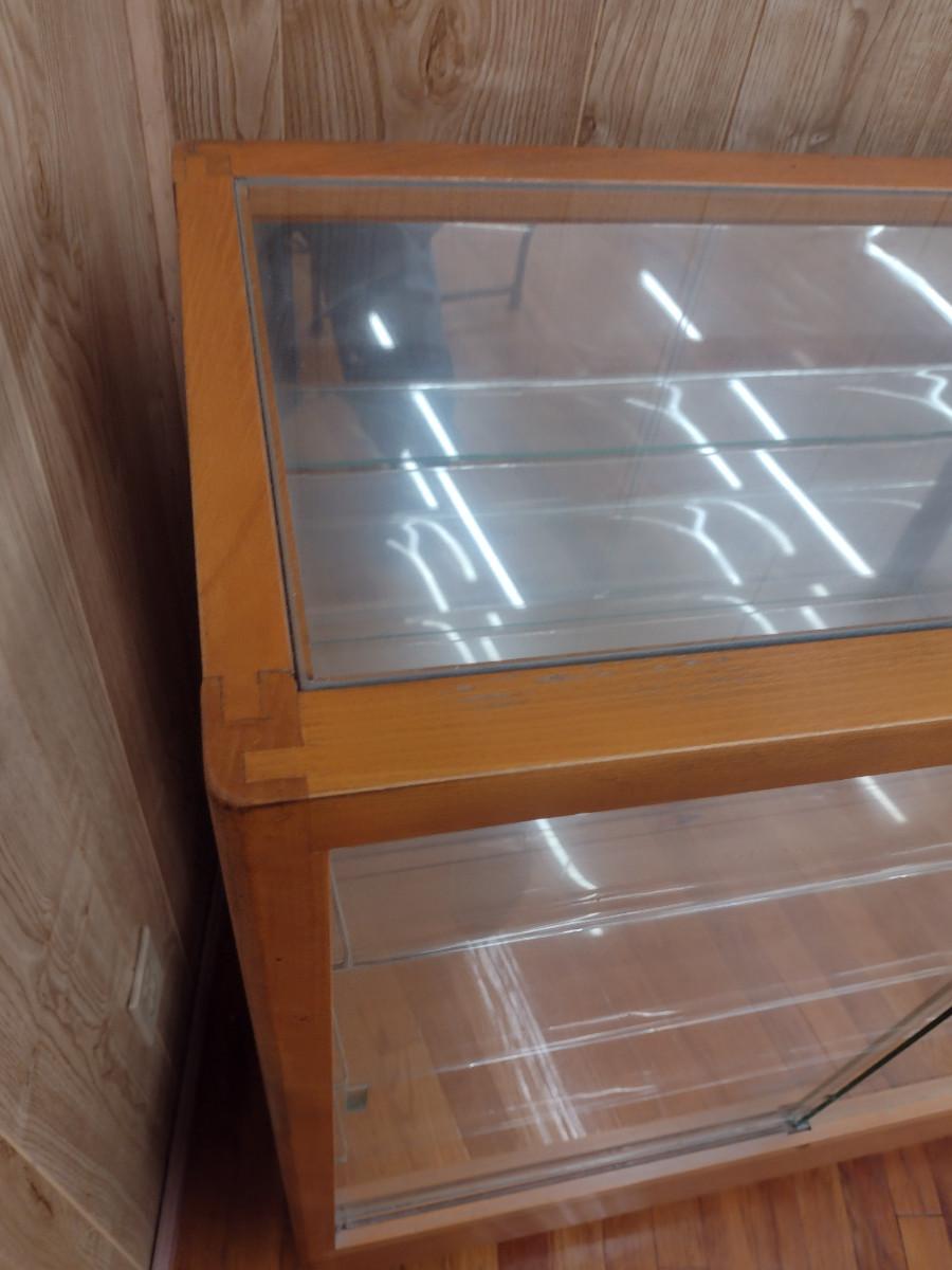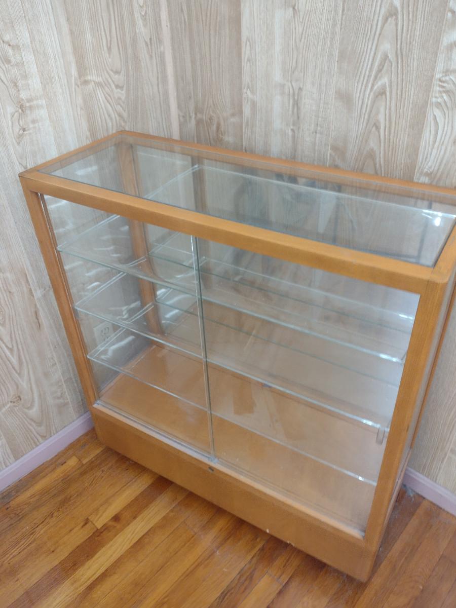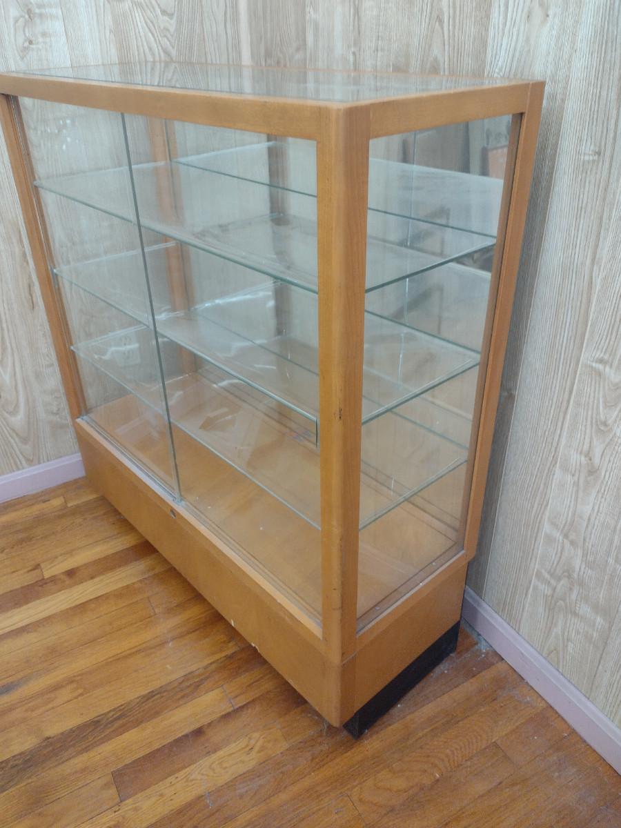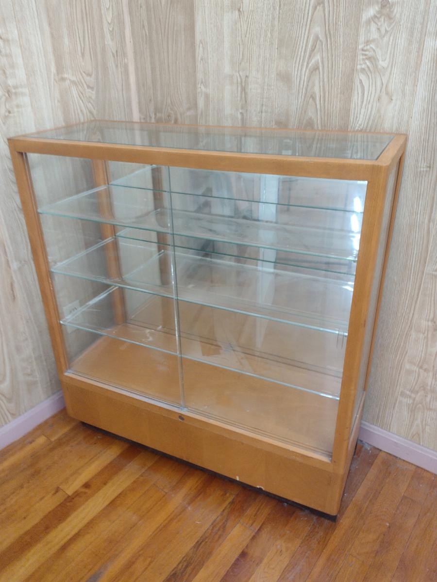 Vintage Waddell Wood and Glass Display Case. Measures approx 36" long, 14" deep, 40" tall.