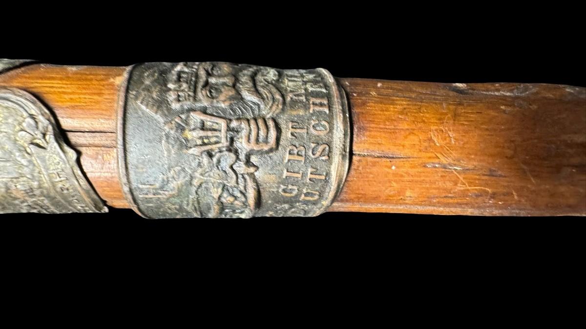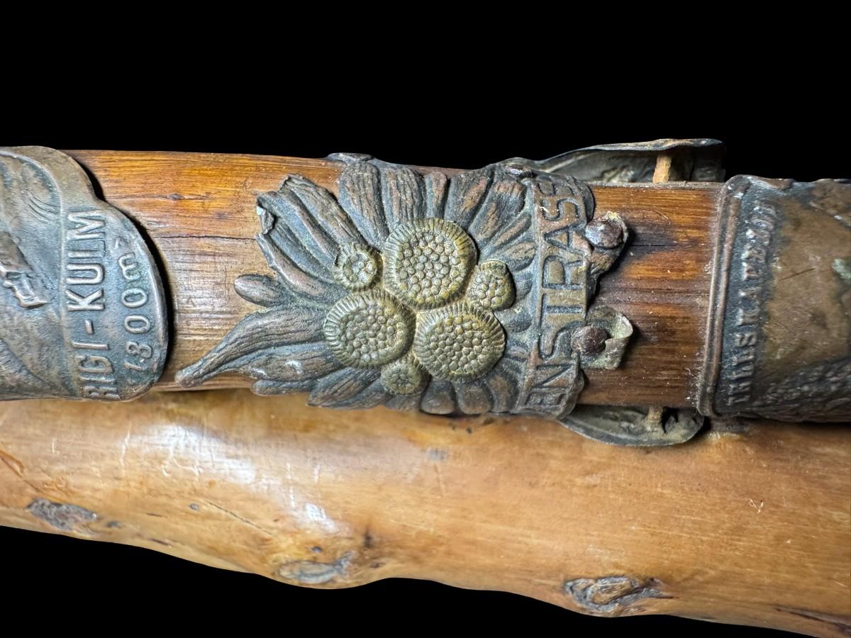 Includes two canes. One is a European piece with destination badges throughout. The other is believed to be hand carved. Some badges are loose on the European cane. Measurement of longest: 36.5”L. [PT]