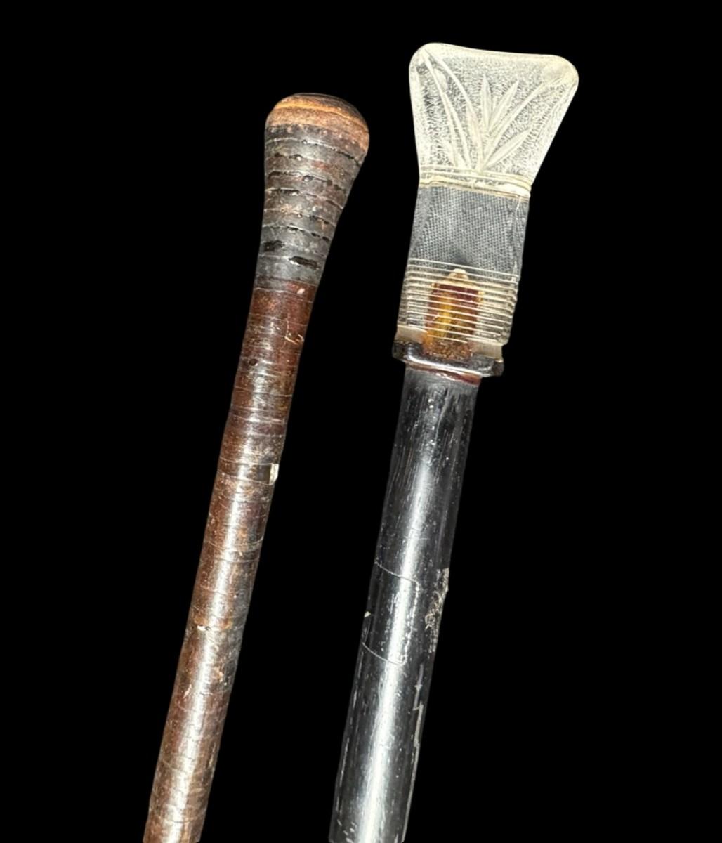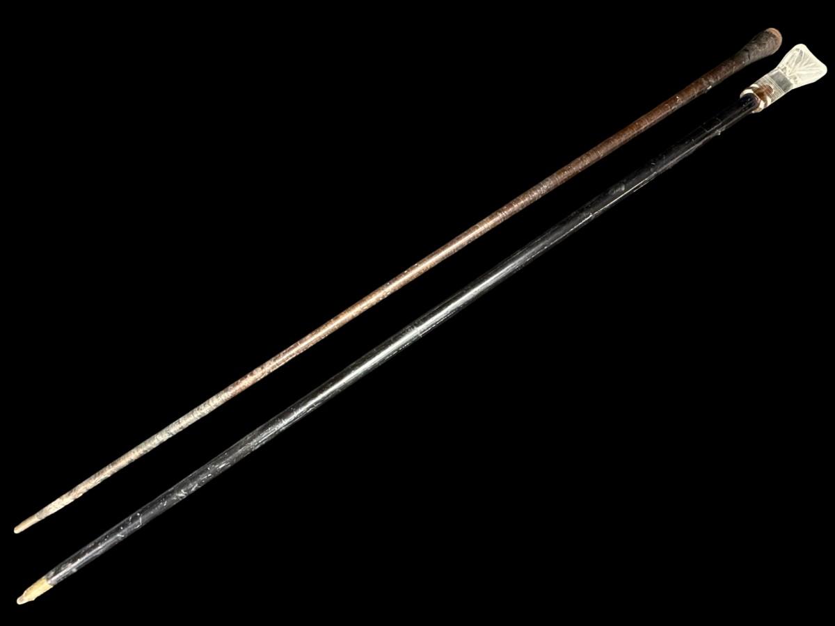 Includes a leather wrapped walking stick with brass tip, and a believed to be mid-century cane with a lucite pommel. Age related wear. Measurement of longest: 37.5”L. [PT]