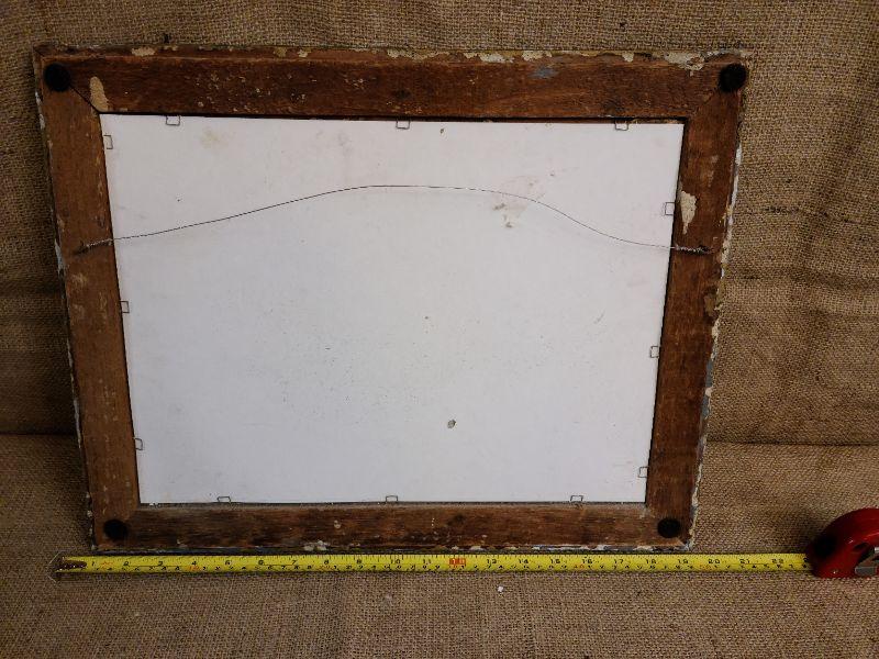 19"x15" vintage framed art with hidden compartment in drop down door on chains. see photos for condition.