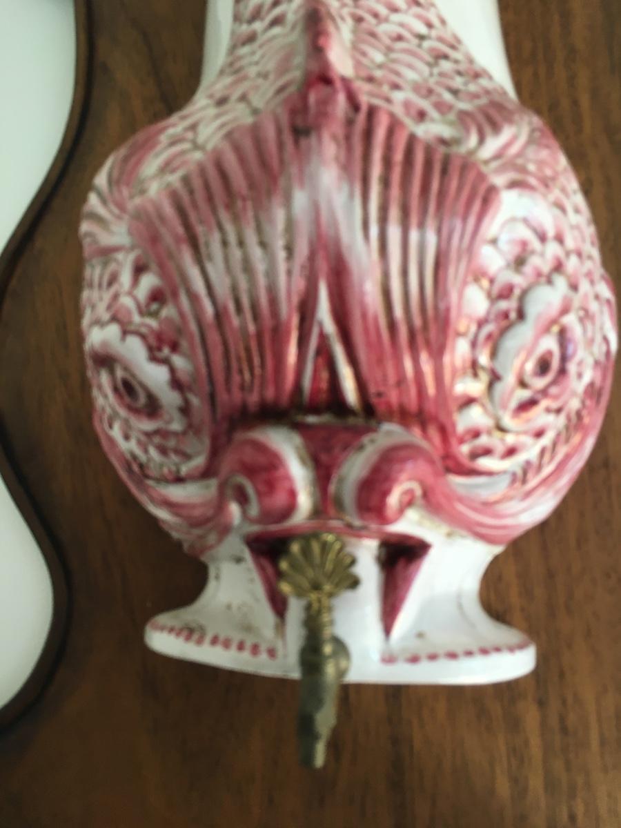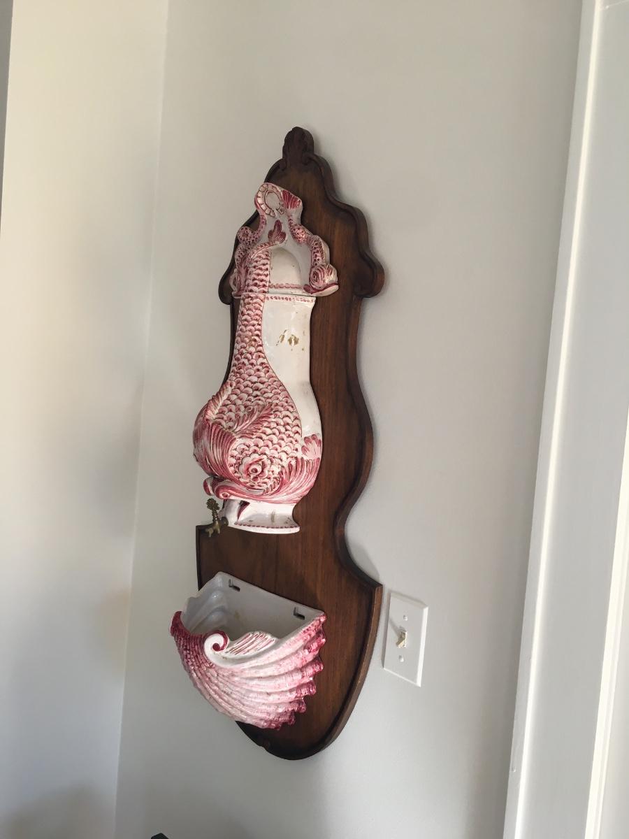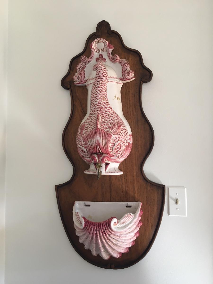 Carved wood wall mounted ceramic fish bowl sculpture.Fish with brass tap in it's mouth. Lovely wall decoration for indoor or covered outdoor area.
