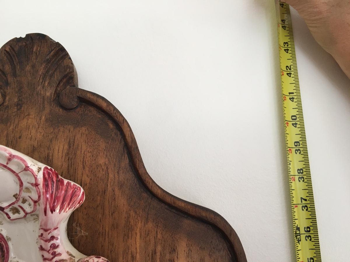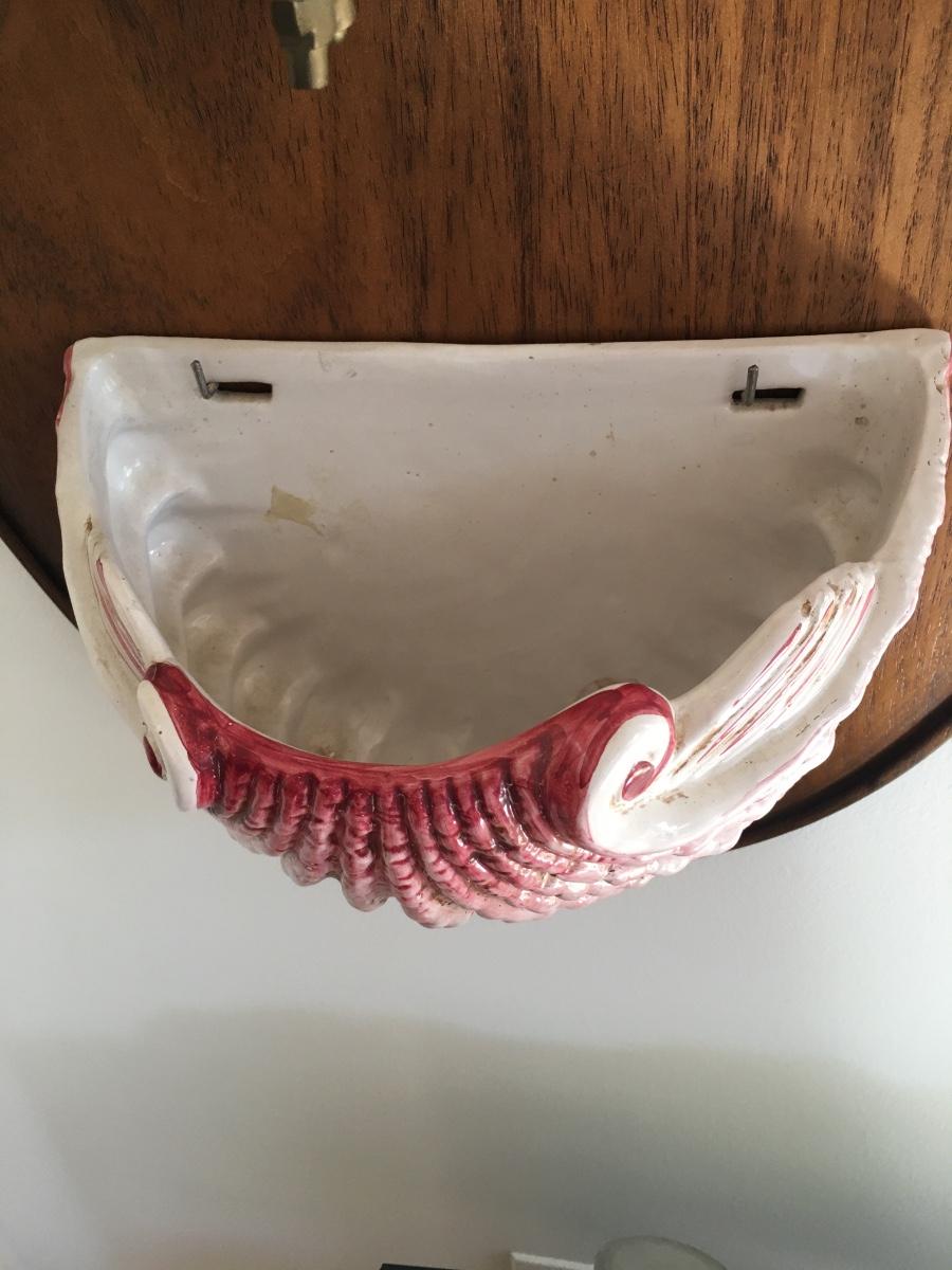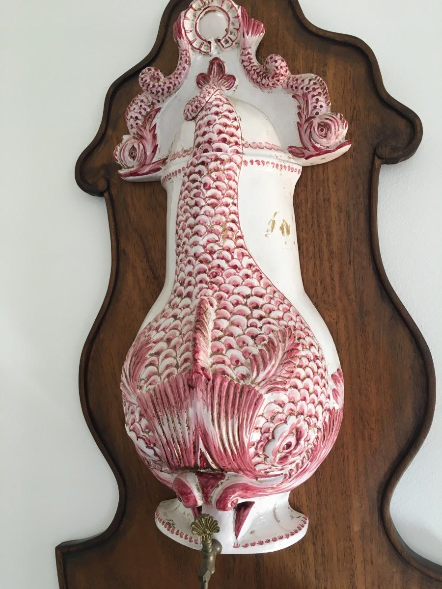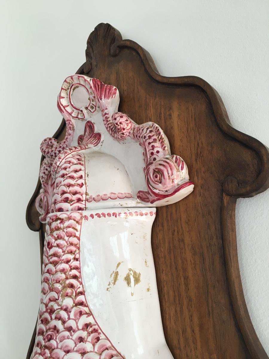 Carved wood wall mounted ceramic fish bowl sculpture.Fish with brass tap in it's mouth. Lovely wall decoration for indoor or covered outdoor area.