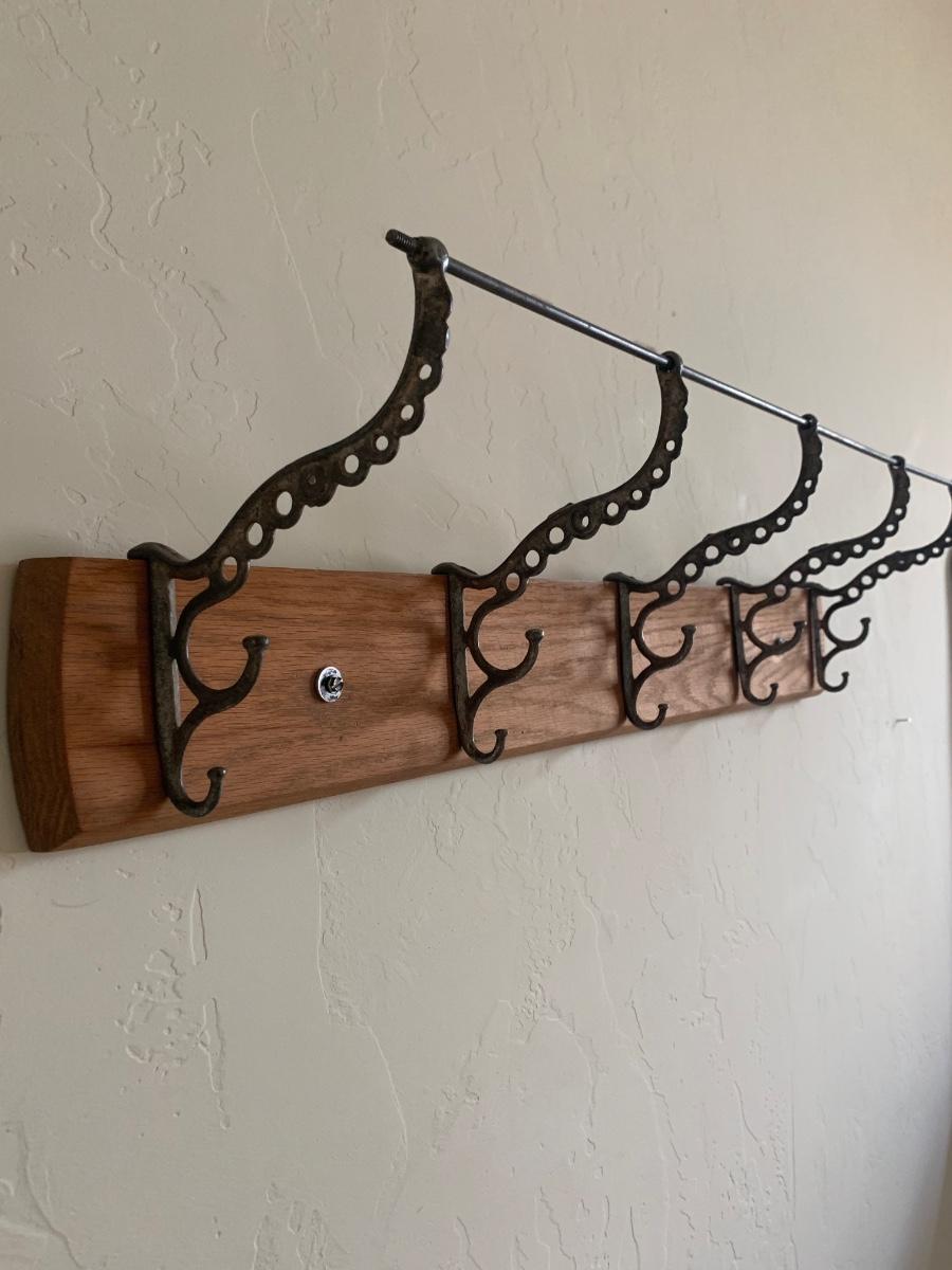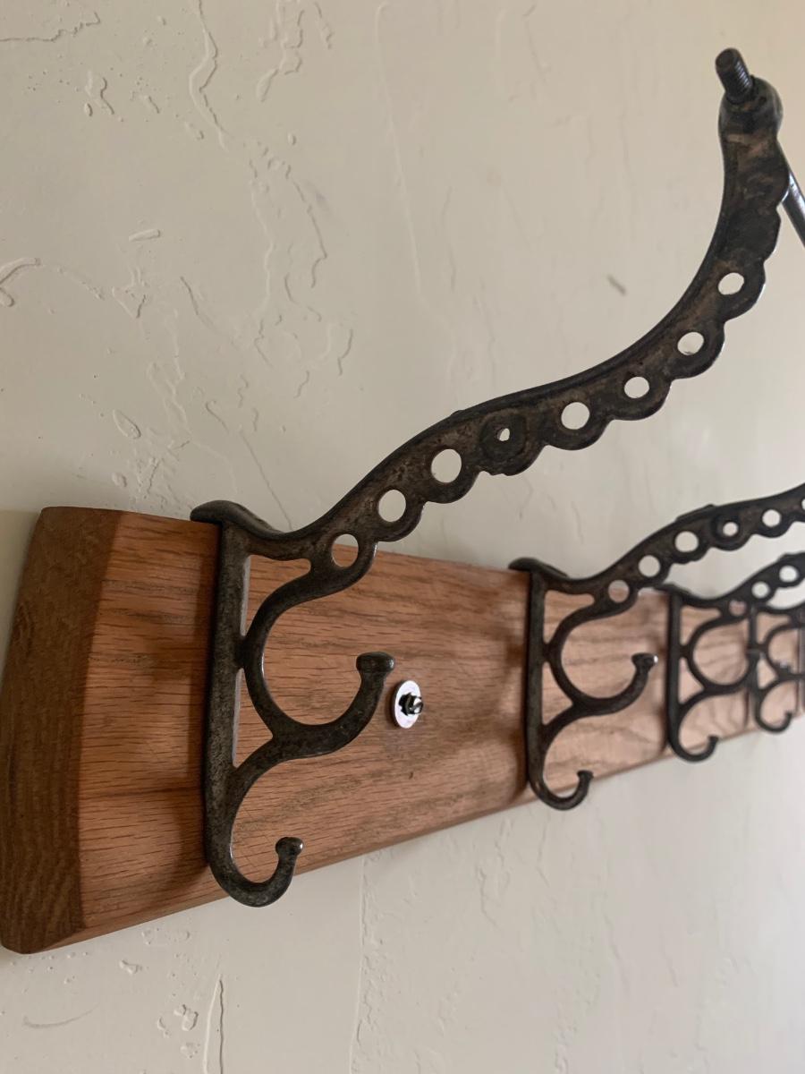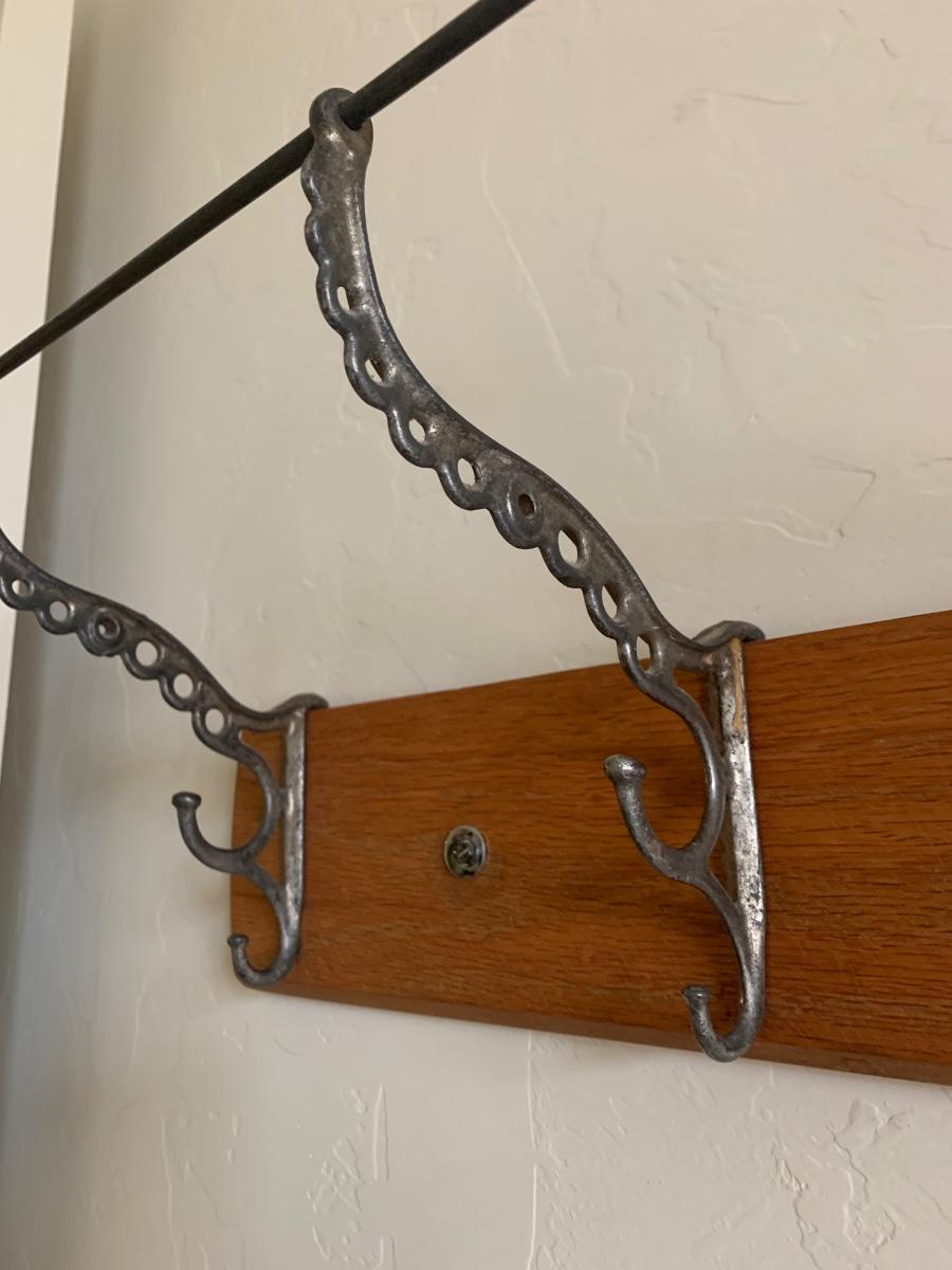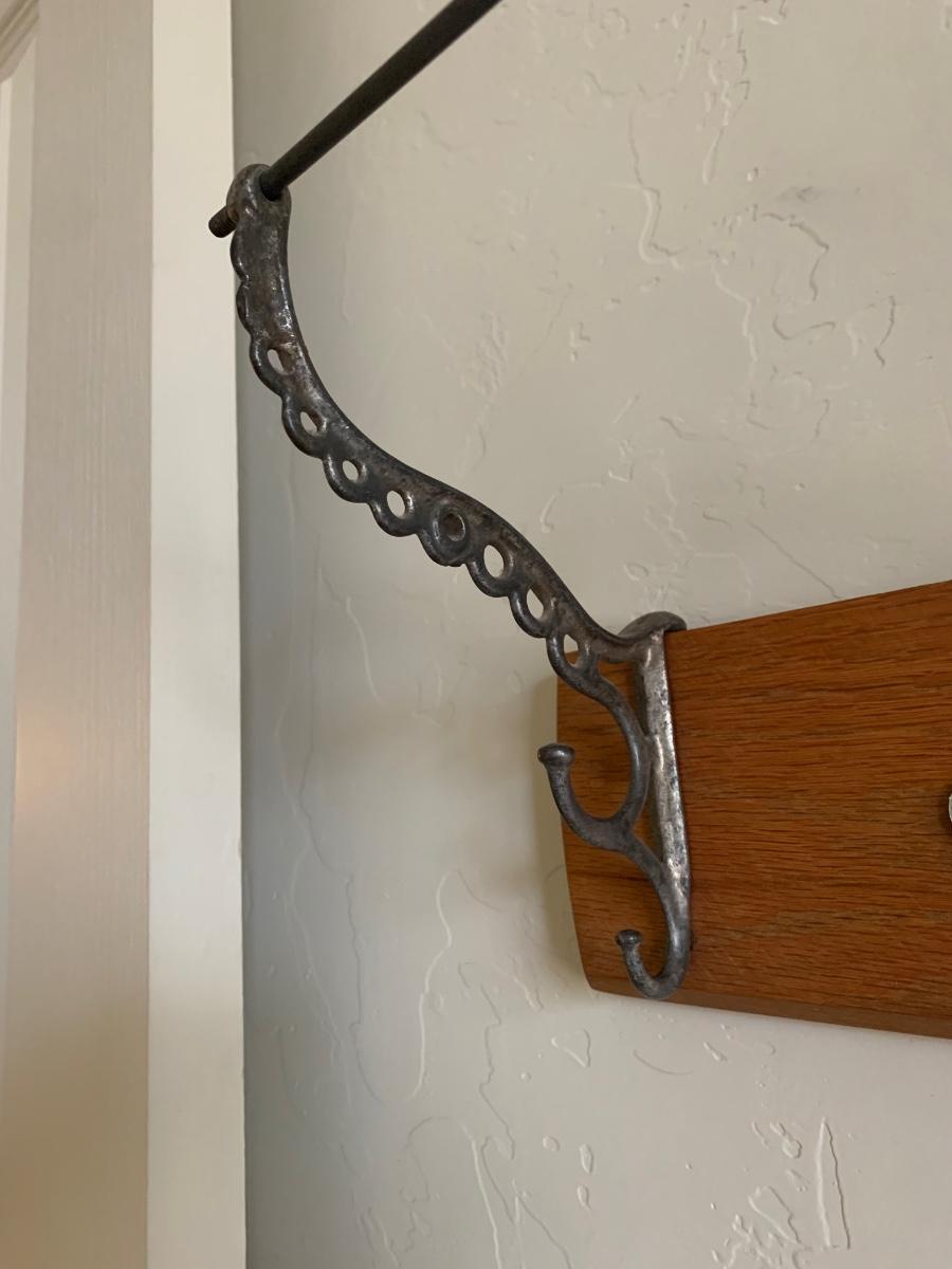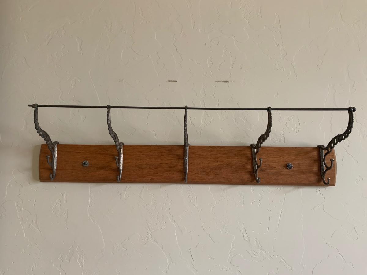 Wood panel with 5 ornate cast iron coat hooks. Good condition, hangs with two screws. Measures 31” long.