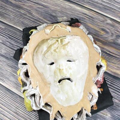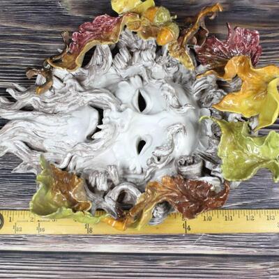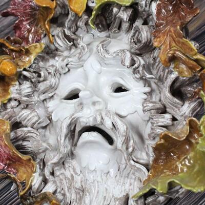 Vintage Wall Mask Made in Italy Fall Wreath with Mythological Face, there's no significant chips or cracks to the piece and is in good condition. A Mythological bearded face adorned with fall leaves, hand made in Perseo Italy and painted. Check pictures for more details and for sizing.