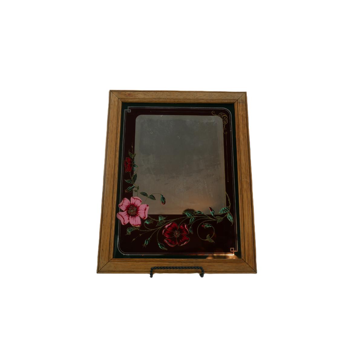 Vintage 1970s framed wall mirror with beautiful flower design. Good condition, mirror itself has visible wear. Measures approximately L 14" x H 11" x D 1", weighs 1 lb 10 oz. Stand not included. (D69)
