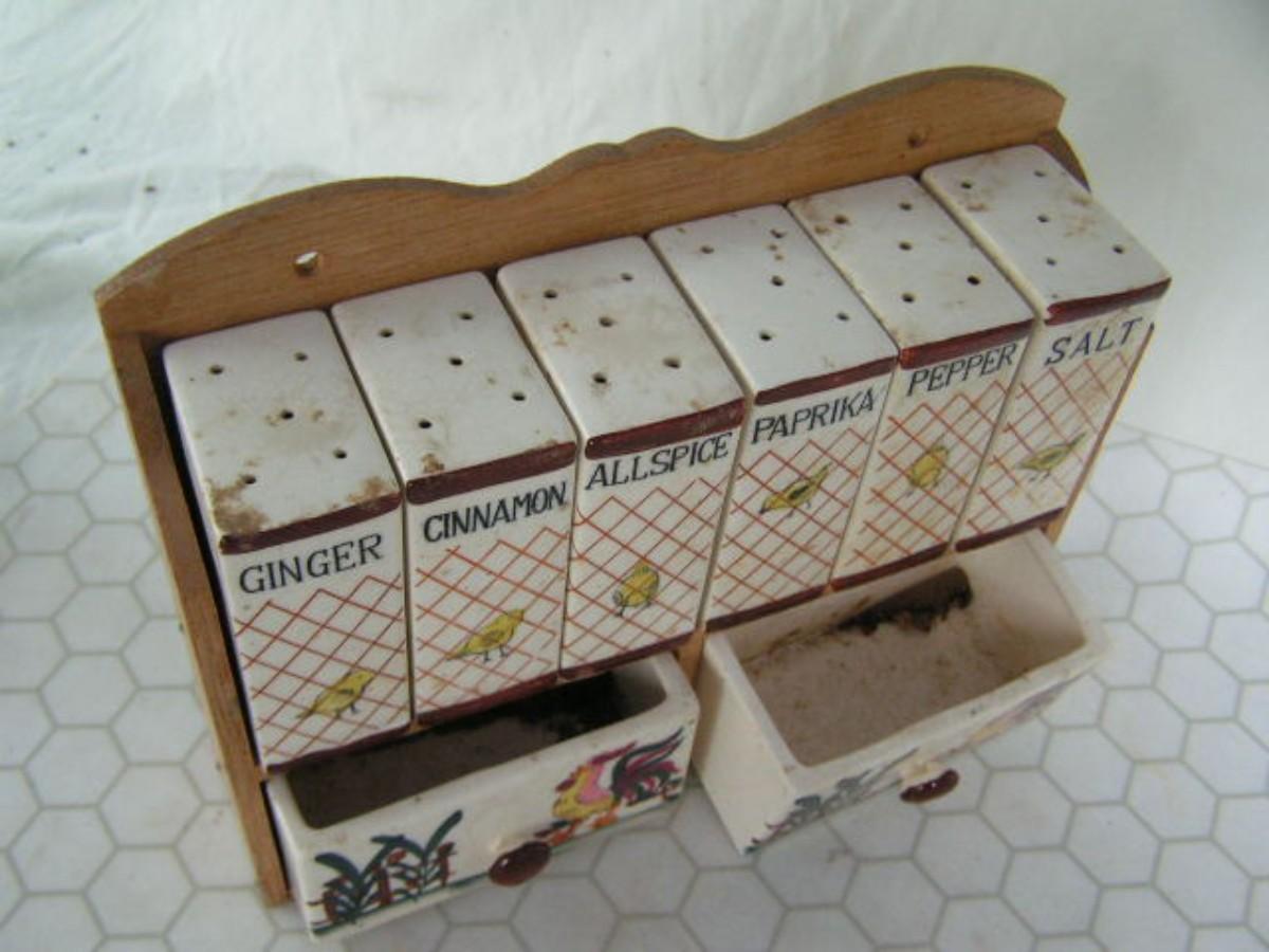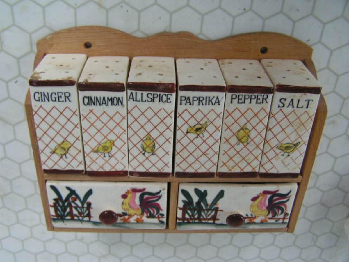 Vintage wall mounted spice rack, ceramic containers & drawers, wood frame