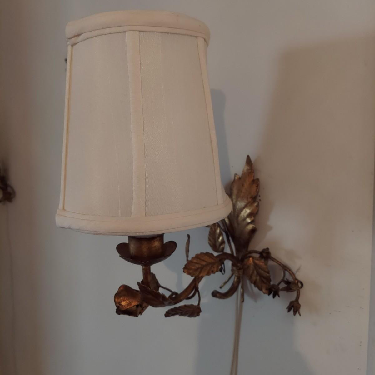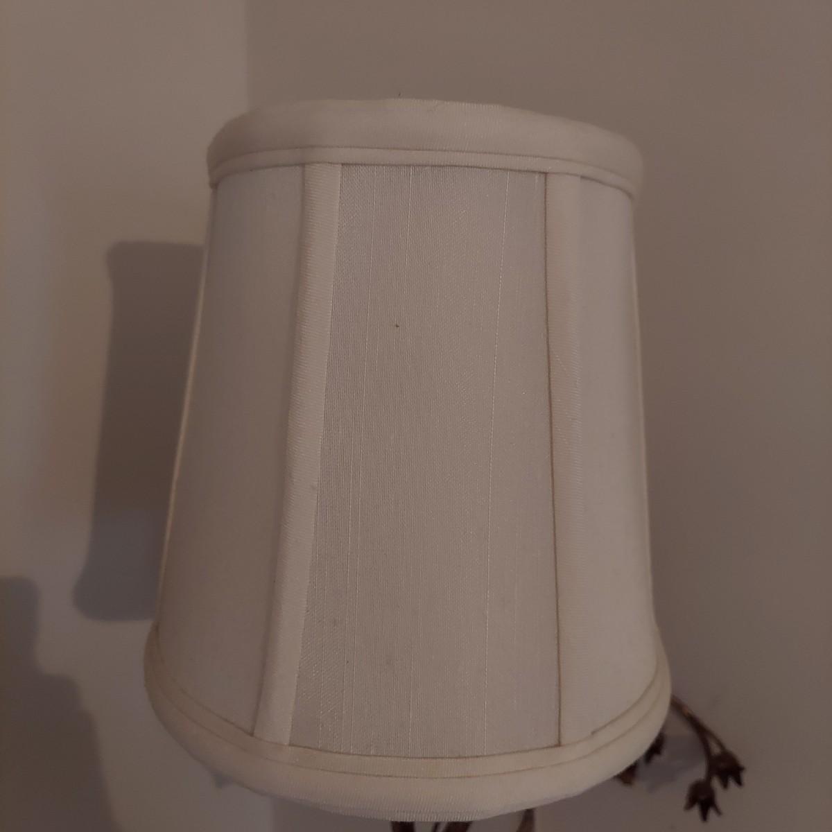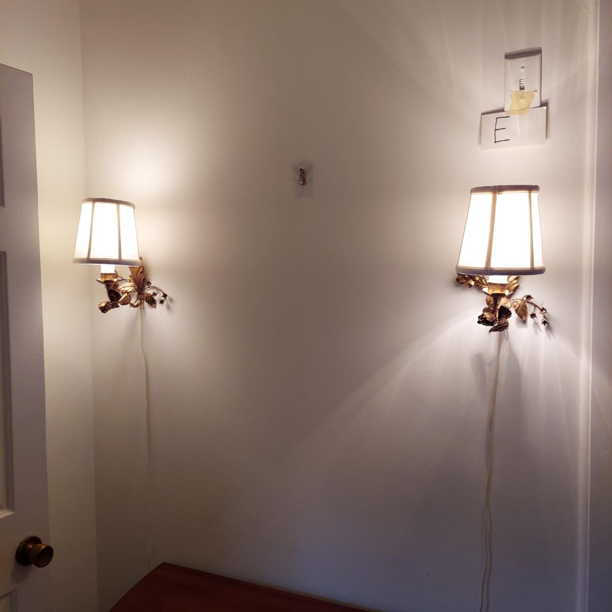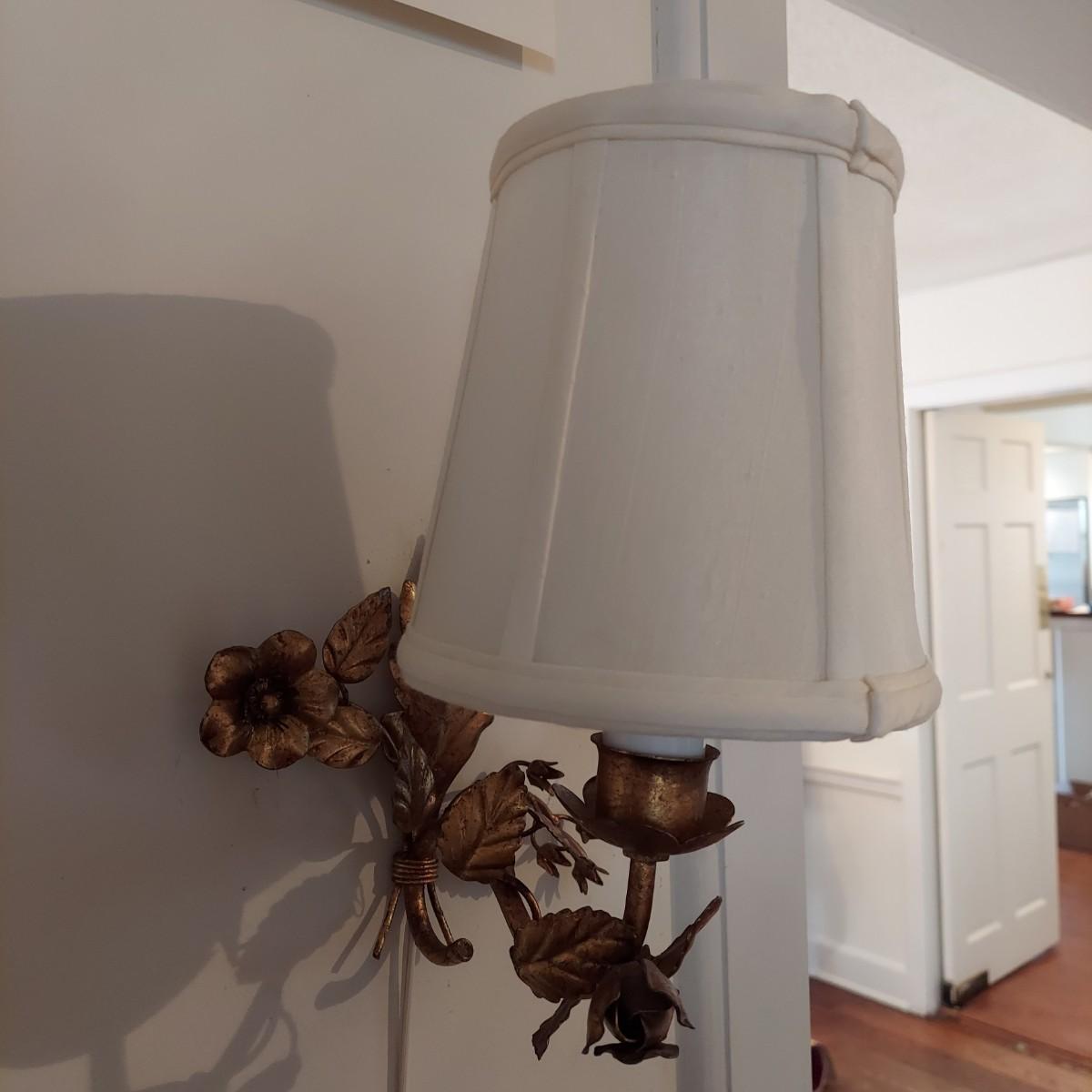 Two vintage wall sconces. Lightweight brass colored metal with cloth shades. Each measures approximately 8" x 9" x 12"H. Lights were plugged in and powered on. Local Pickup Only