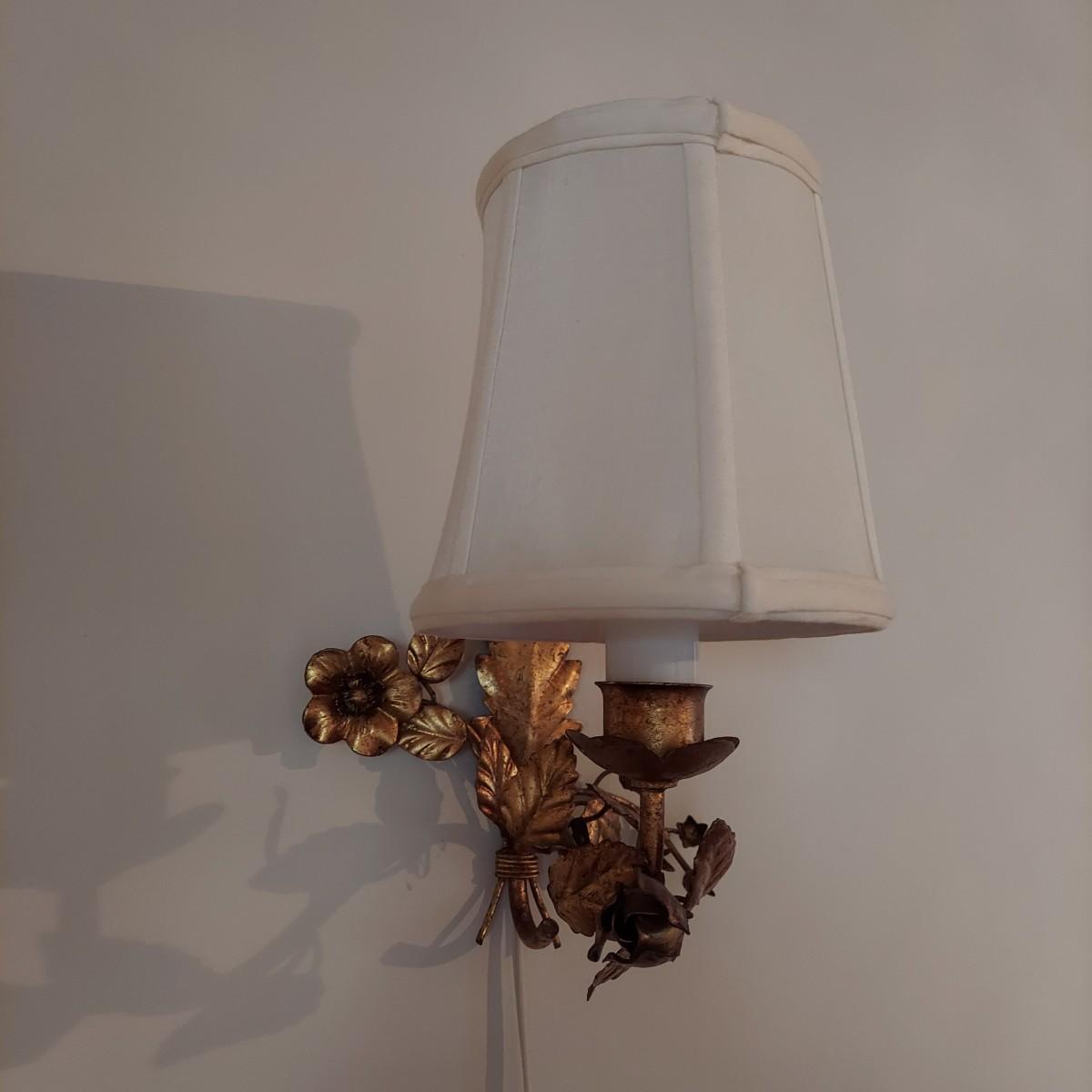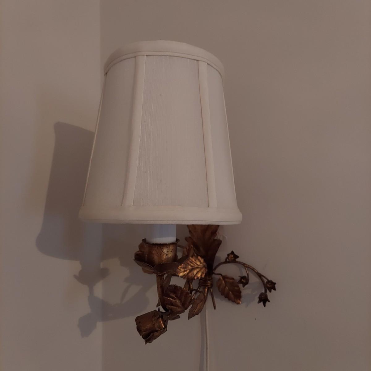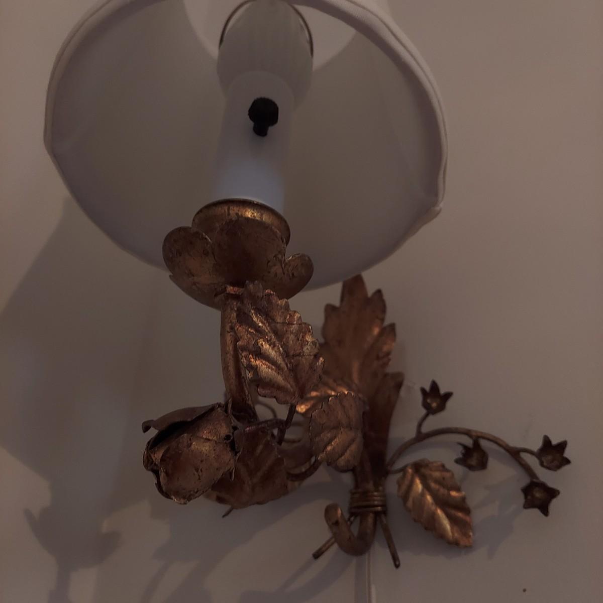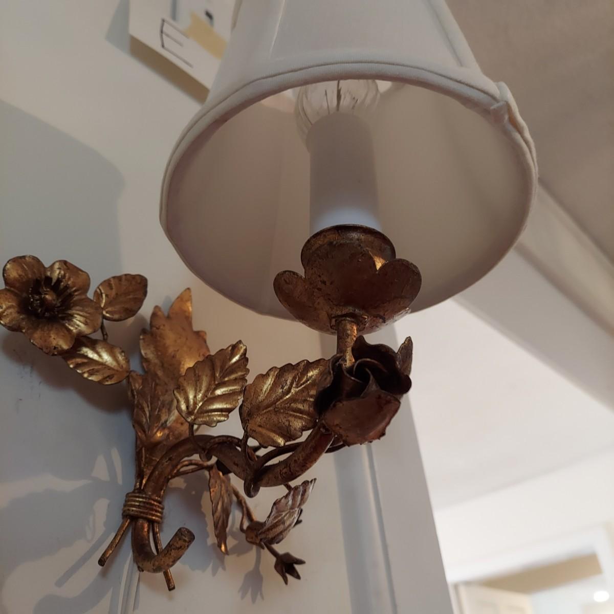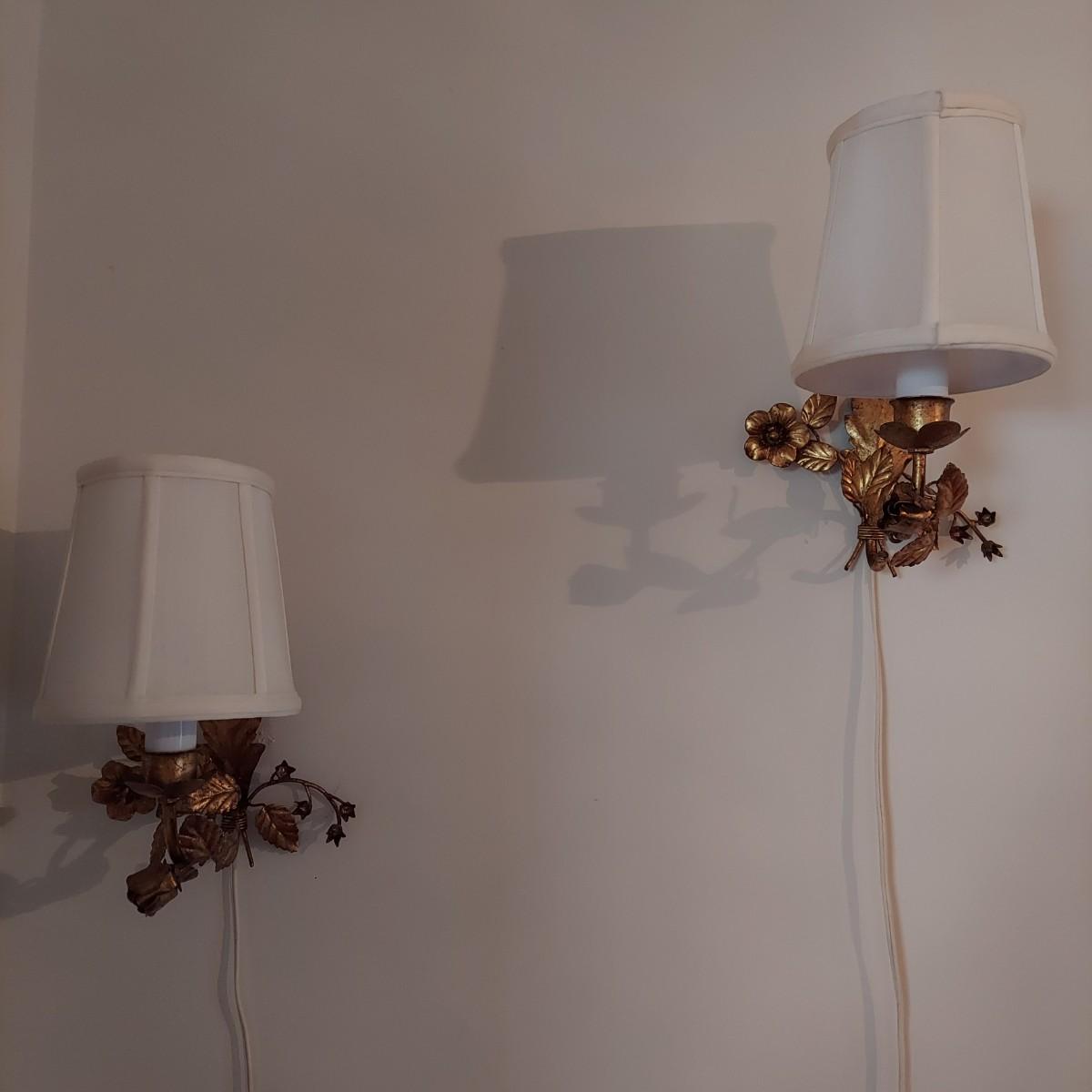 Two vintage wall sconces. Lightweight brass colored metal with cloth shades. Each measures approximately 8" x 9" x 12"H. Lights were plugged in and powered on. Local Pickup Only