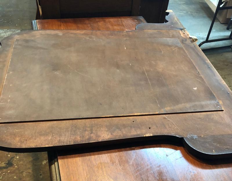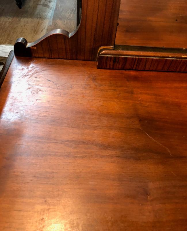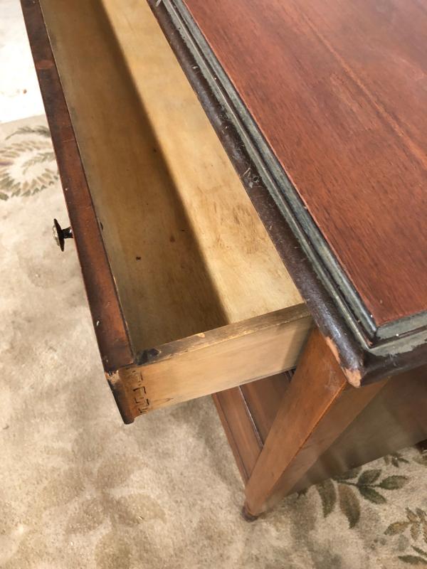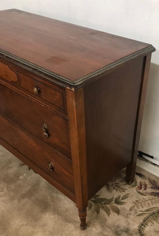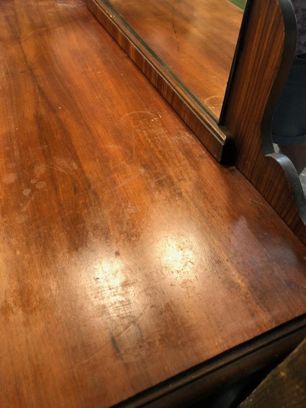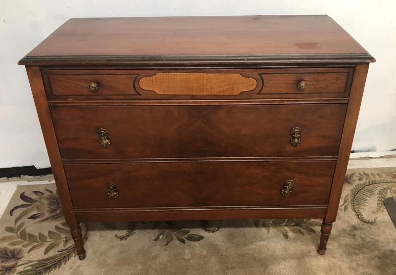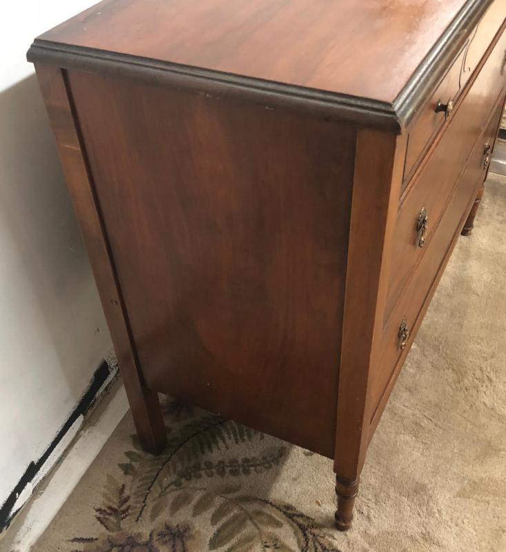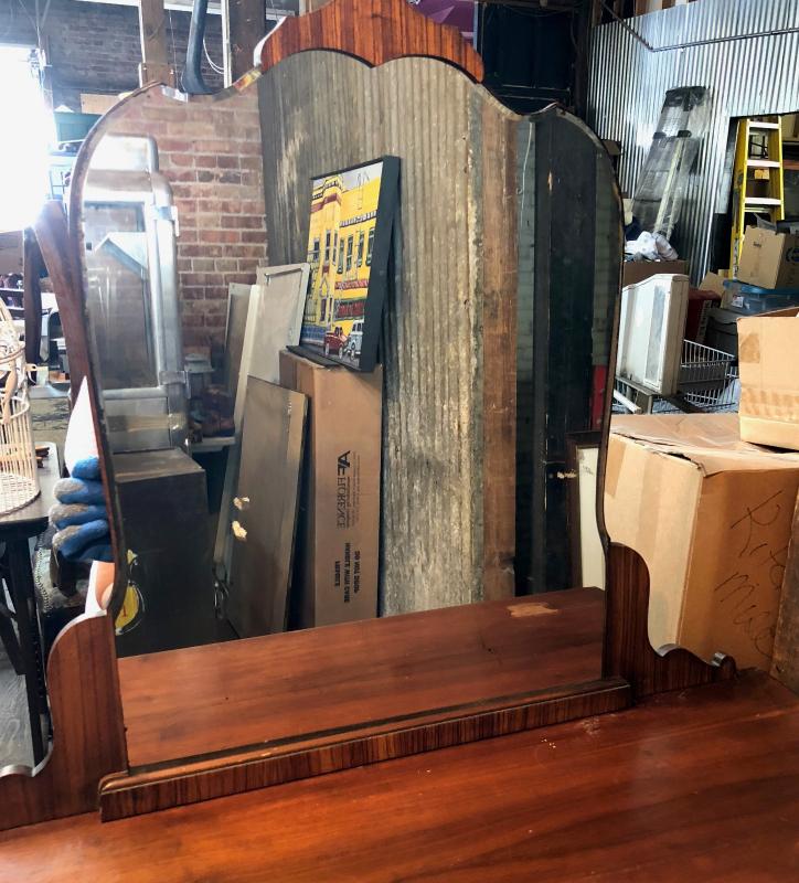 Used condition on this 1930's Walnut Waterfall Dresser with mirror...3 drawers...42 x 19 x 35in...some wear commensurate with age and use on the finish...