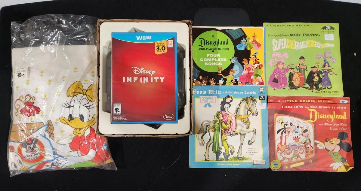 Vintage Walt Disney World Records & Disney Infiniti Wii Game plus Rare Mickey Mouse & Donald Duck pillow cases