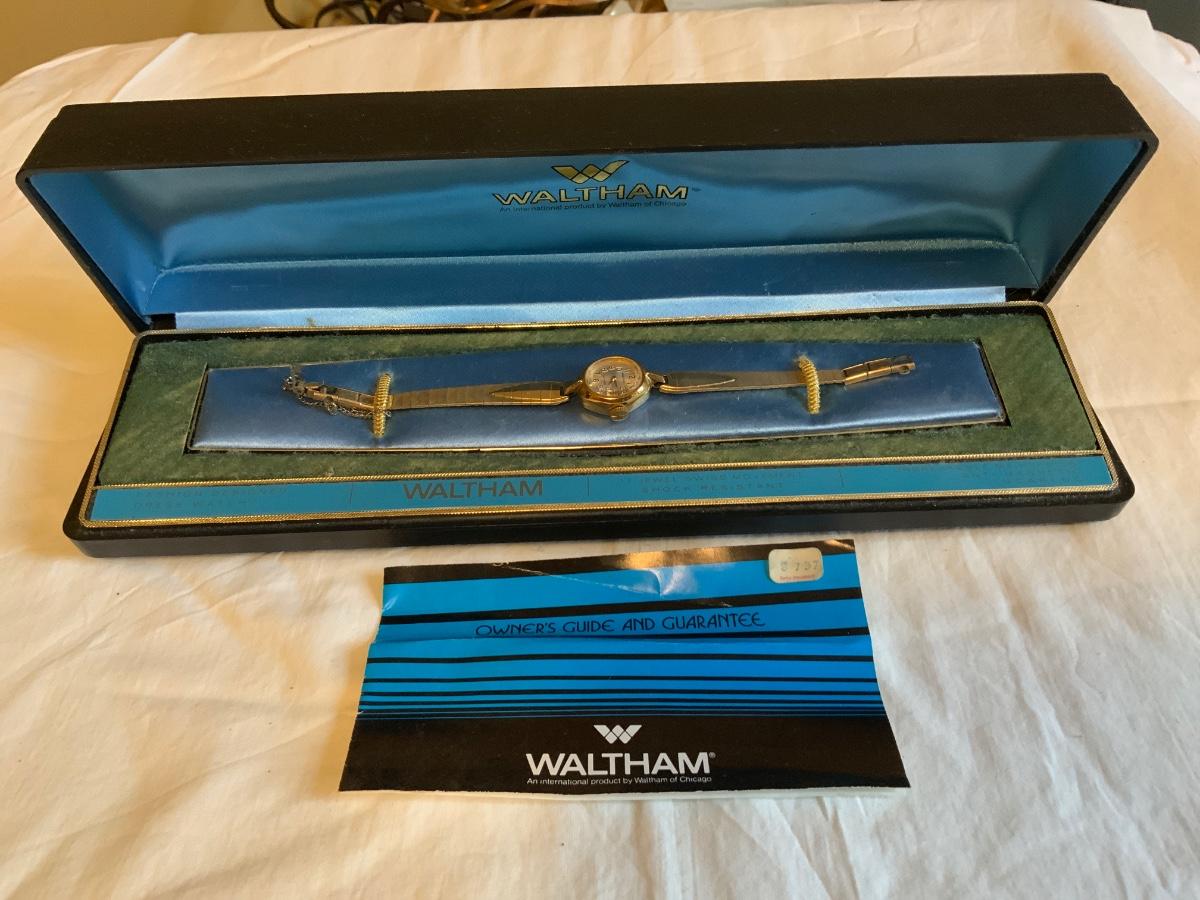 Vintage Waltham Watch with original box and owners guide. Waltham, Swiss, Incabloc 17 written on face.