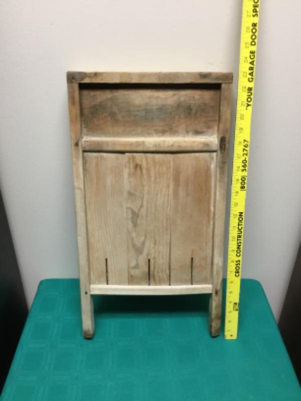 One vintage wooden washboard being sold as is. There’s writing on the back, but much of it is illegible. See pictures.