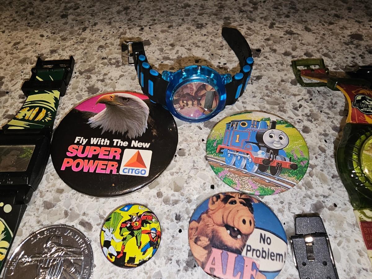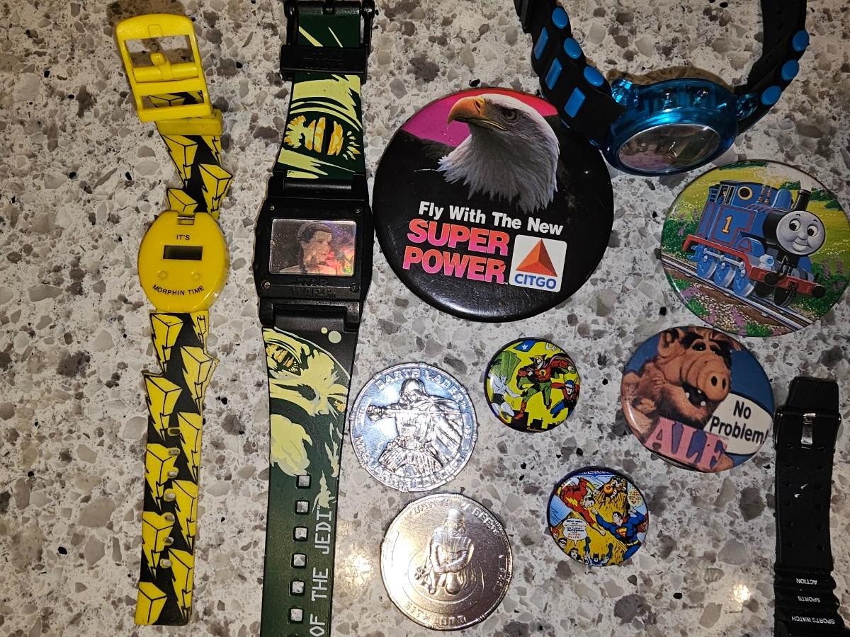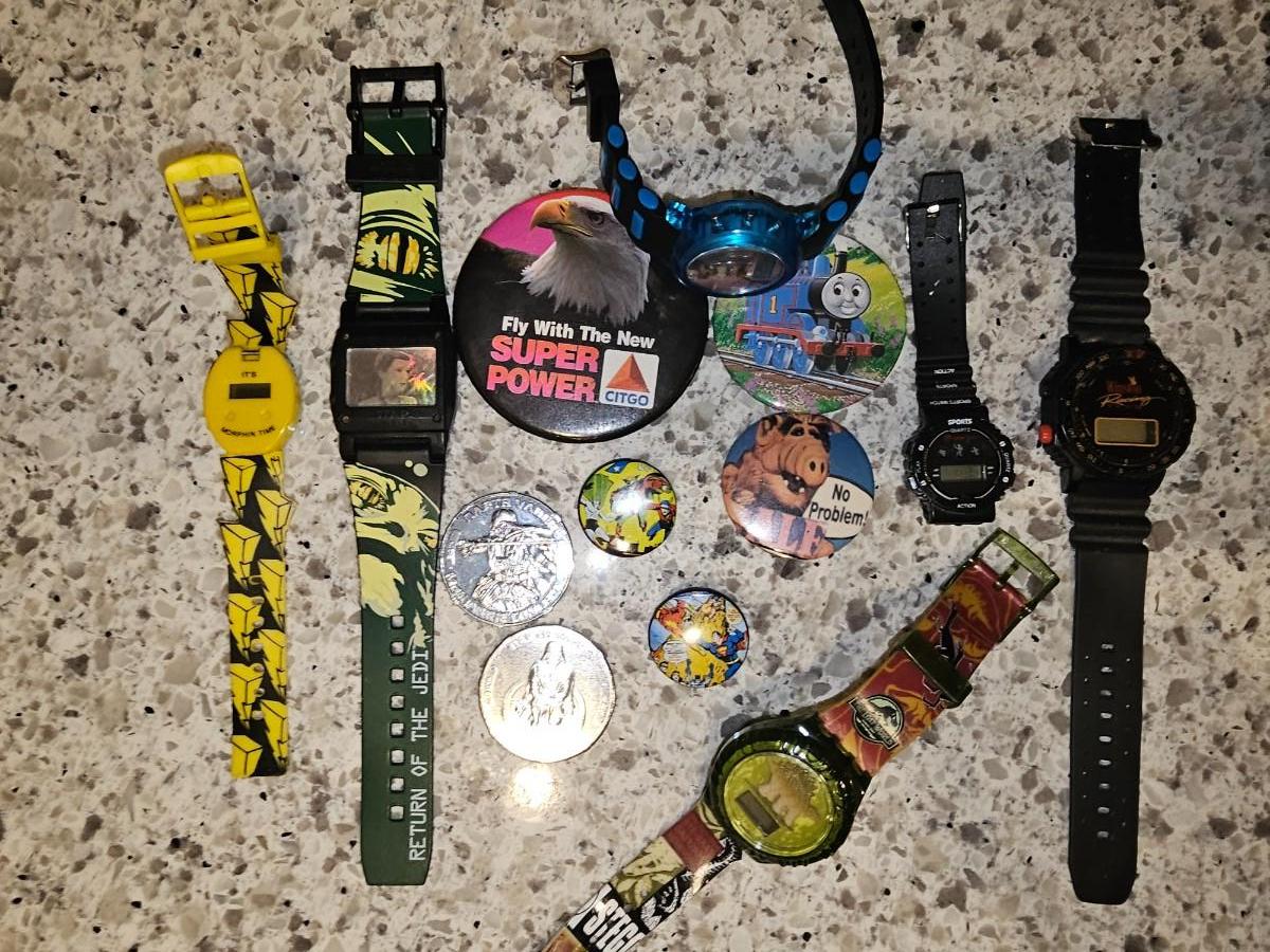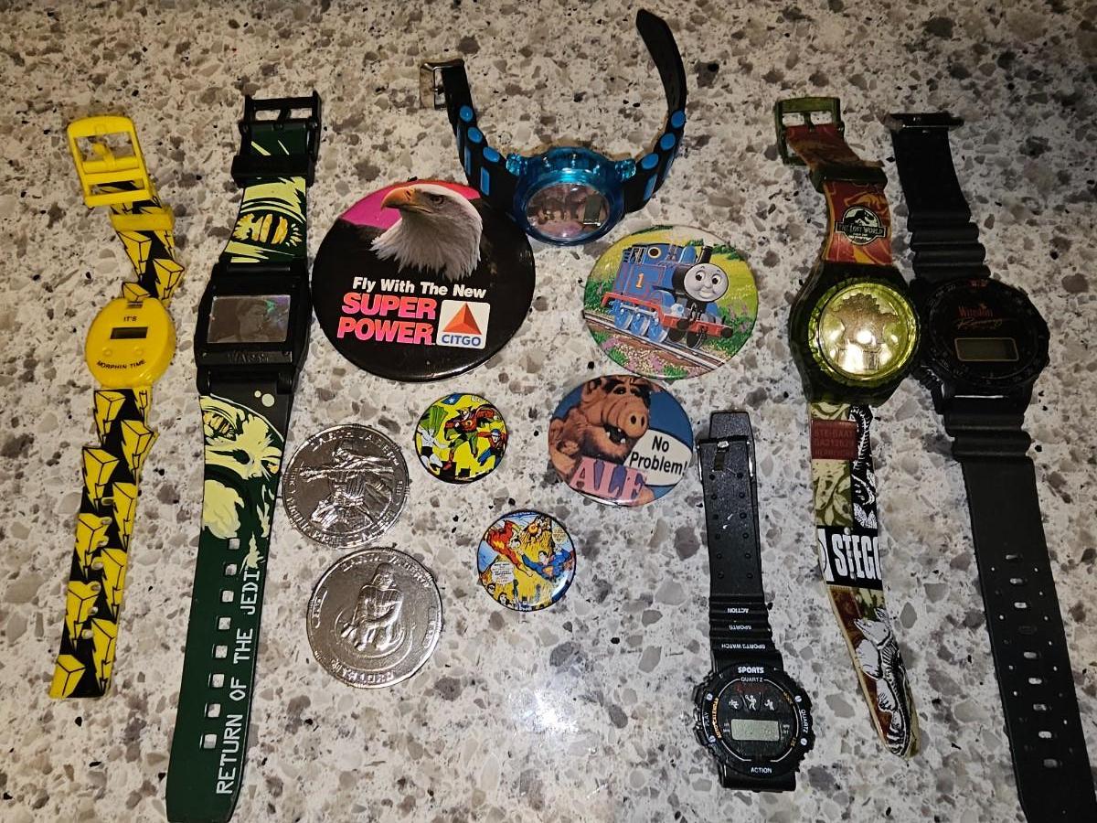 Vintage Watch, Coin, Pin Lot | Star Wars, Powr Rangers Winston Racing, Jurassic Park, Marvel. Some watches will need batteries.