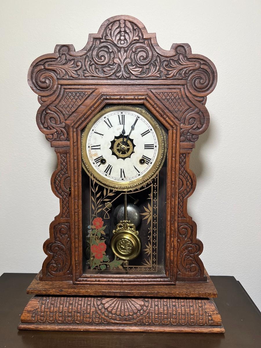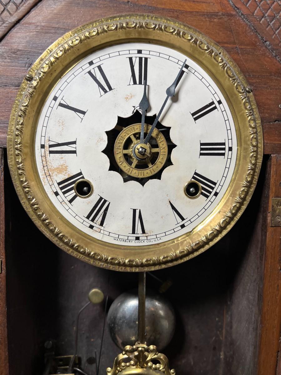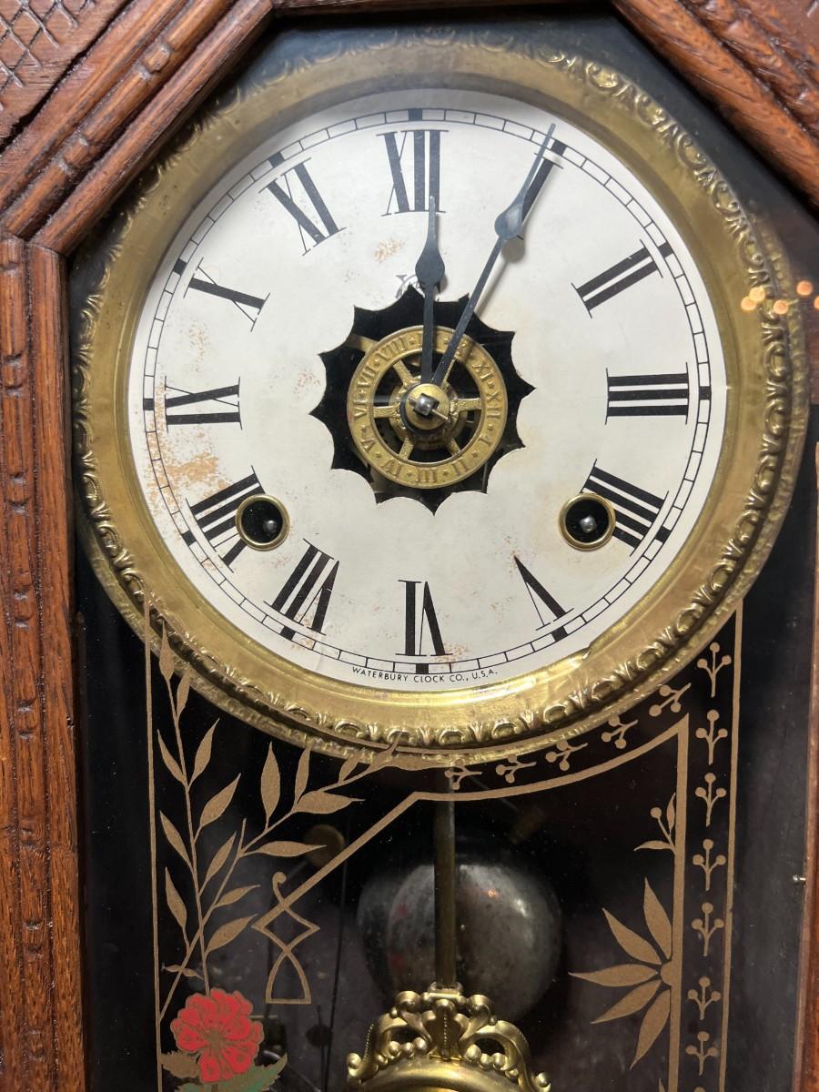 Vintage Waterbury Clock Co. Gothic Wooden Brass Glass  Mechanical Clock