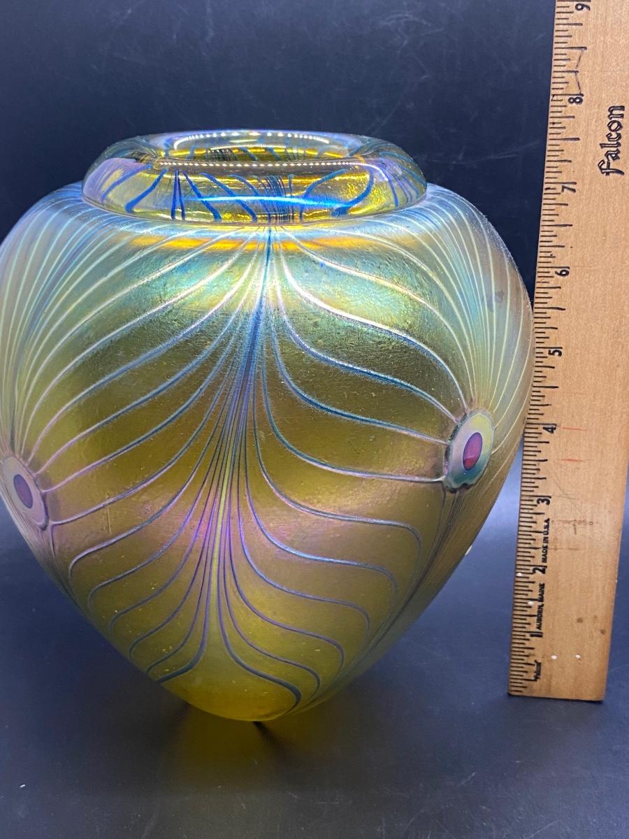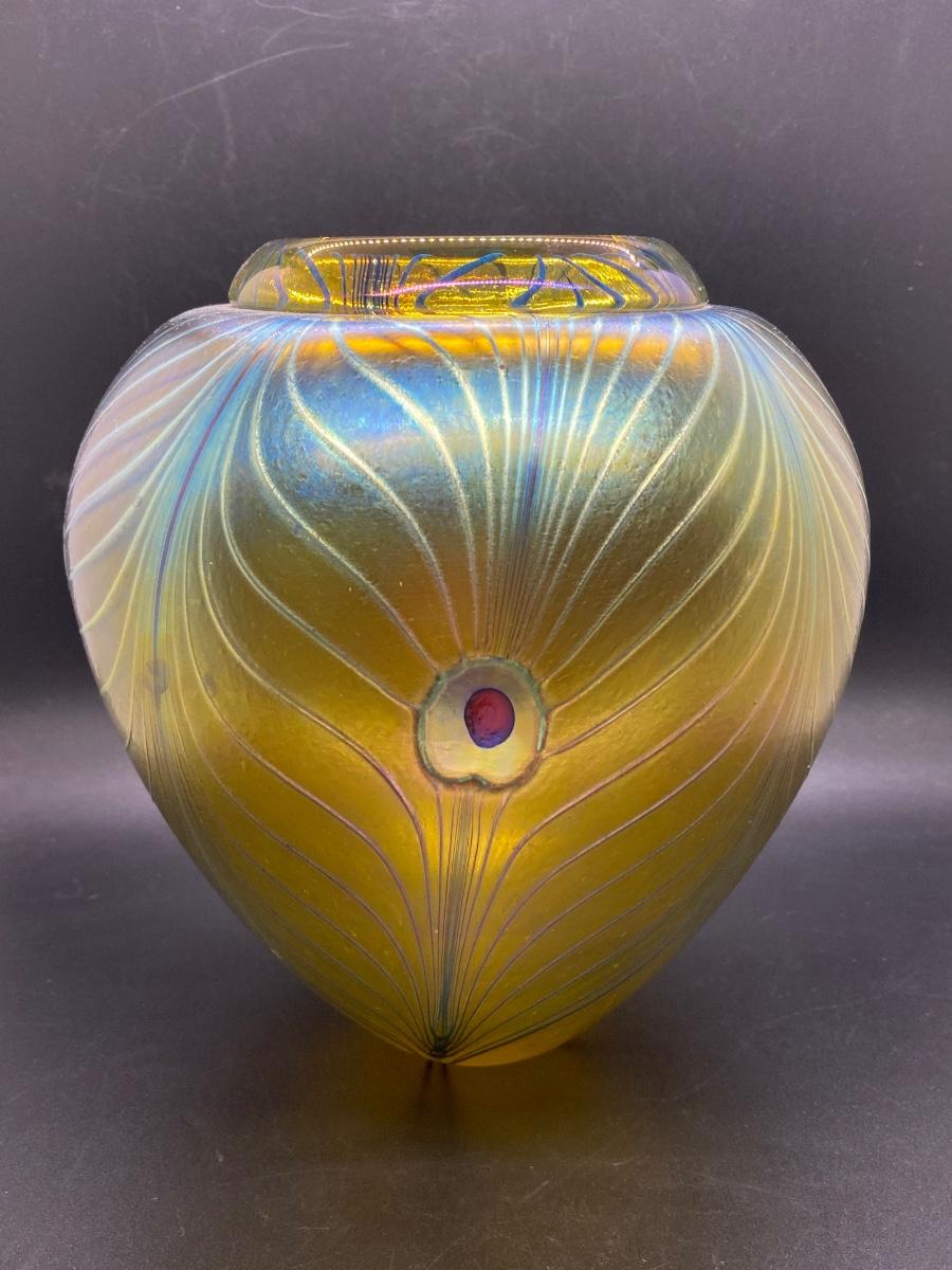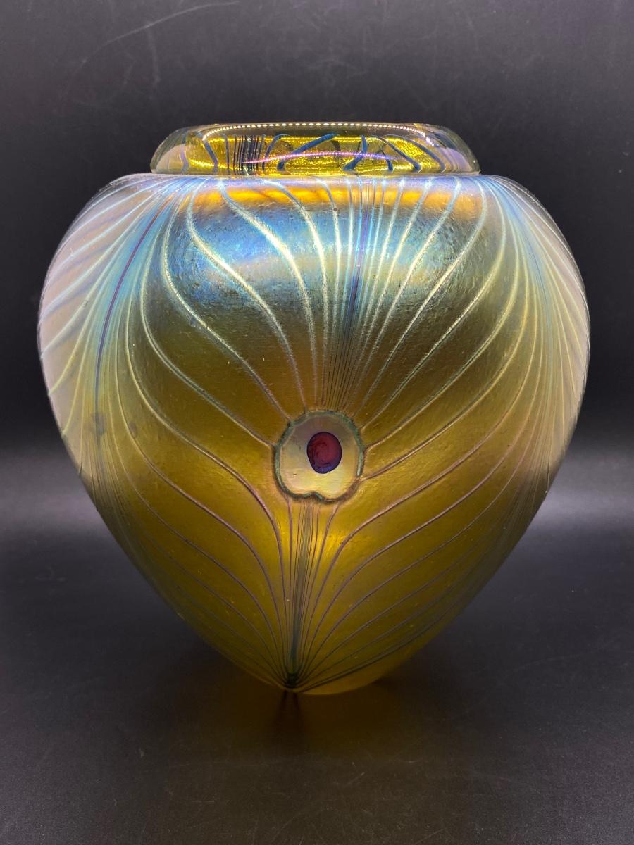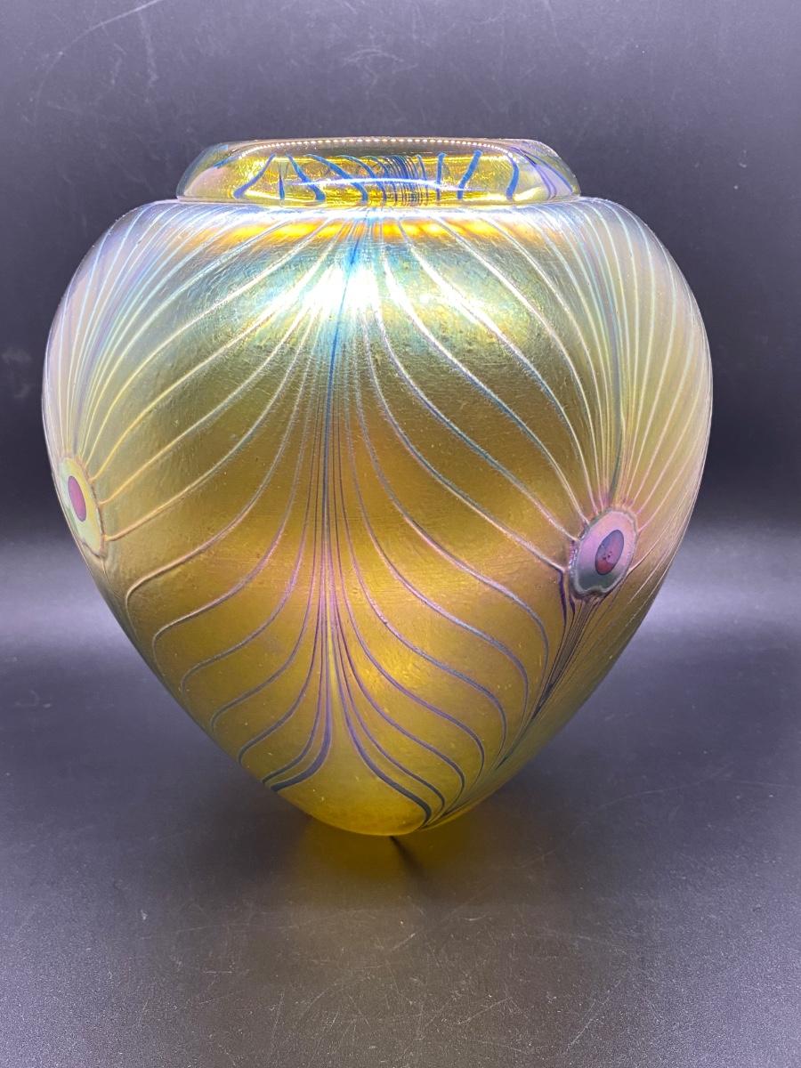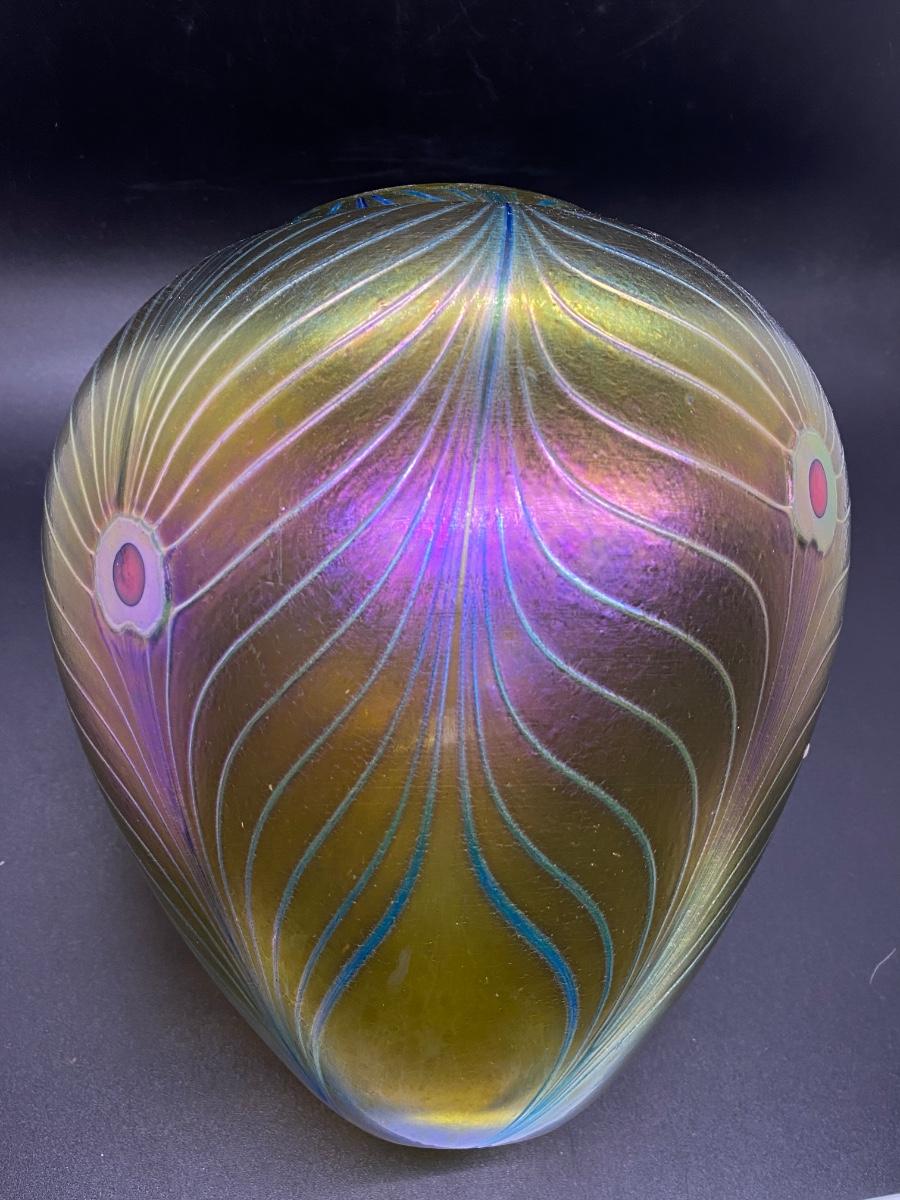 Vintage Waterford Evolution Collection Artist Robert Held Signed Iridescent Peacock Feather Blown Art Glass Vase