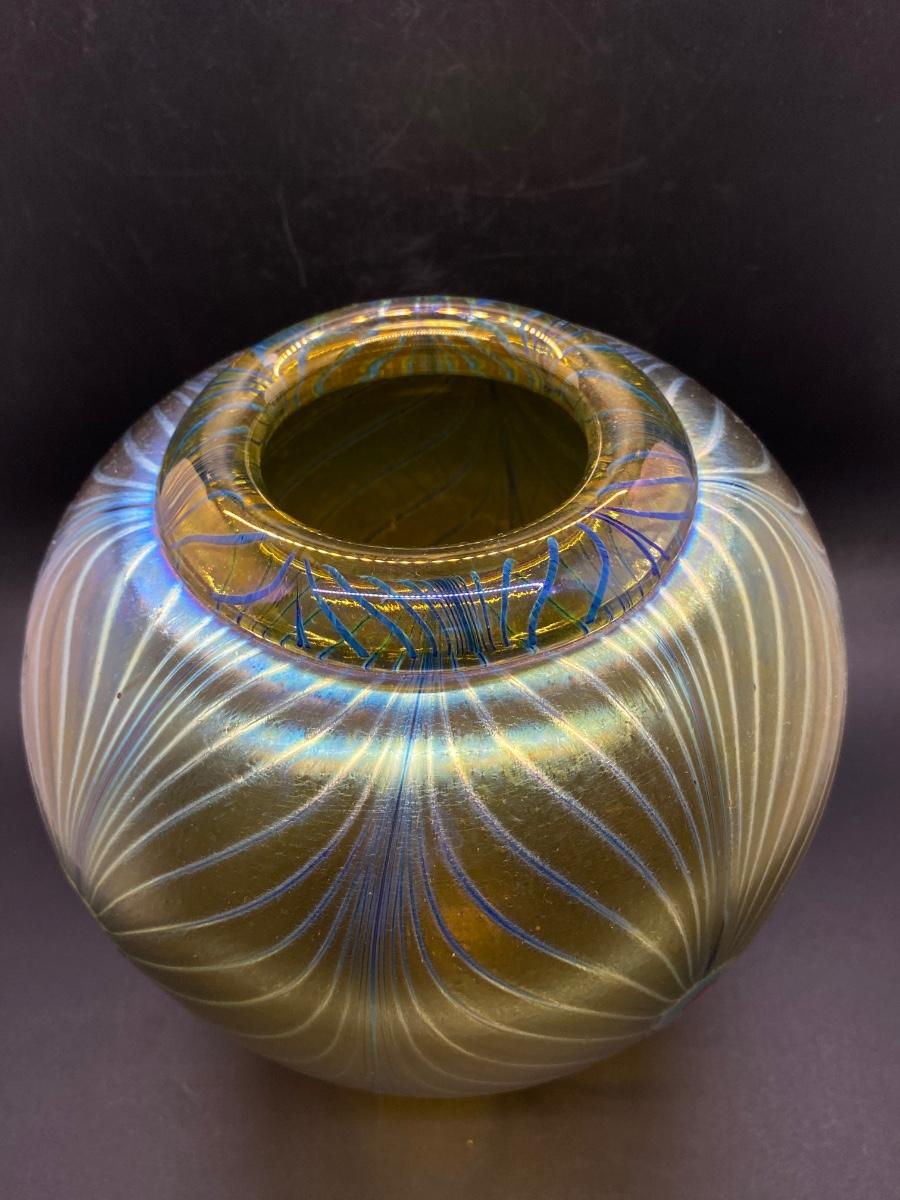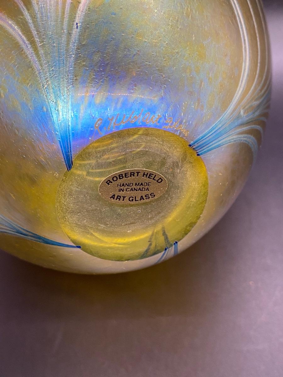 Vintage Robert Held art glass vase. Gold color with a peacock feather design. In good condition, signed at the bottom and original sticker attached. About 7.5" size.