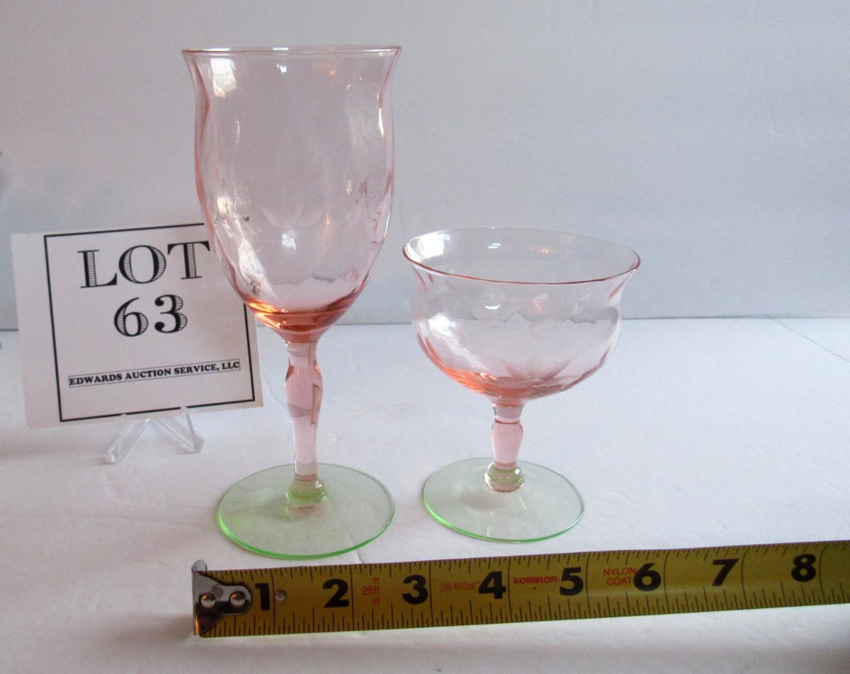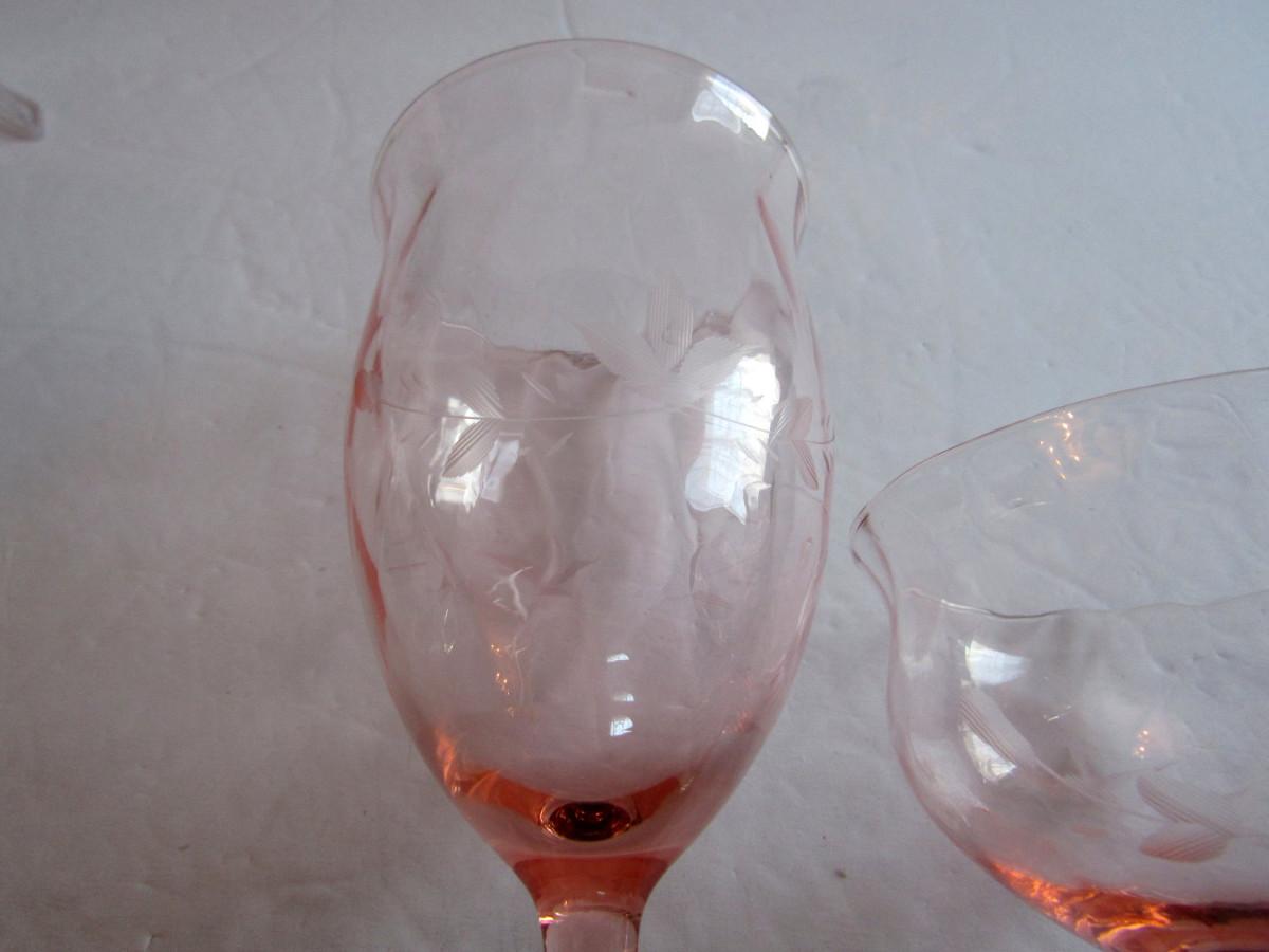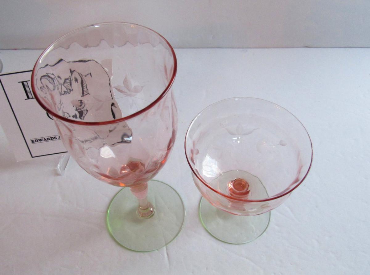 Nice shape. Nice little etching in the pink glass. Shipping is available at shipping cost plus $5 per box handling fee. See our terms for details.