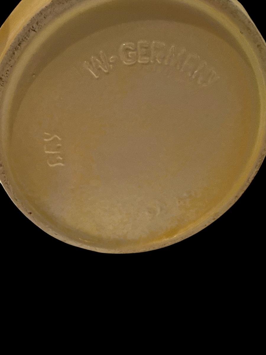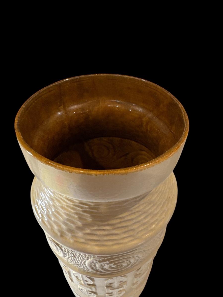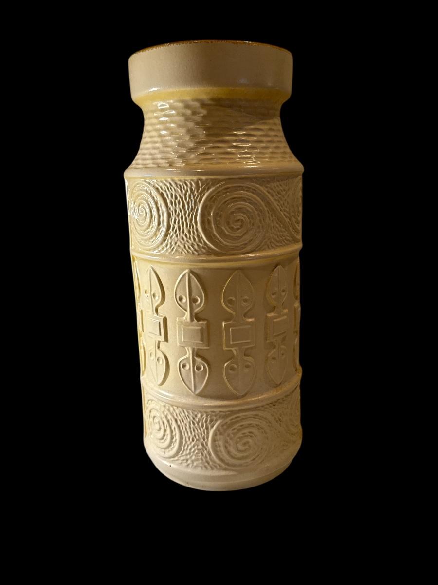 Textured ceramic vase marked “W. Germany 517-15.” Warm beige glaze with bold raised designs and glossy brown interior. A collectible mid-century piece with classic West German styling.