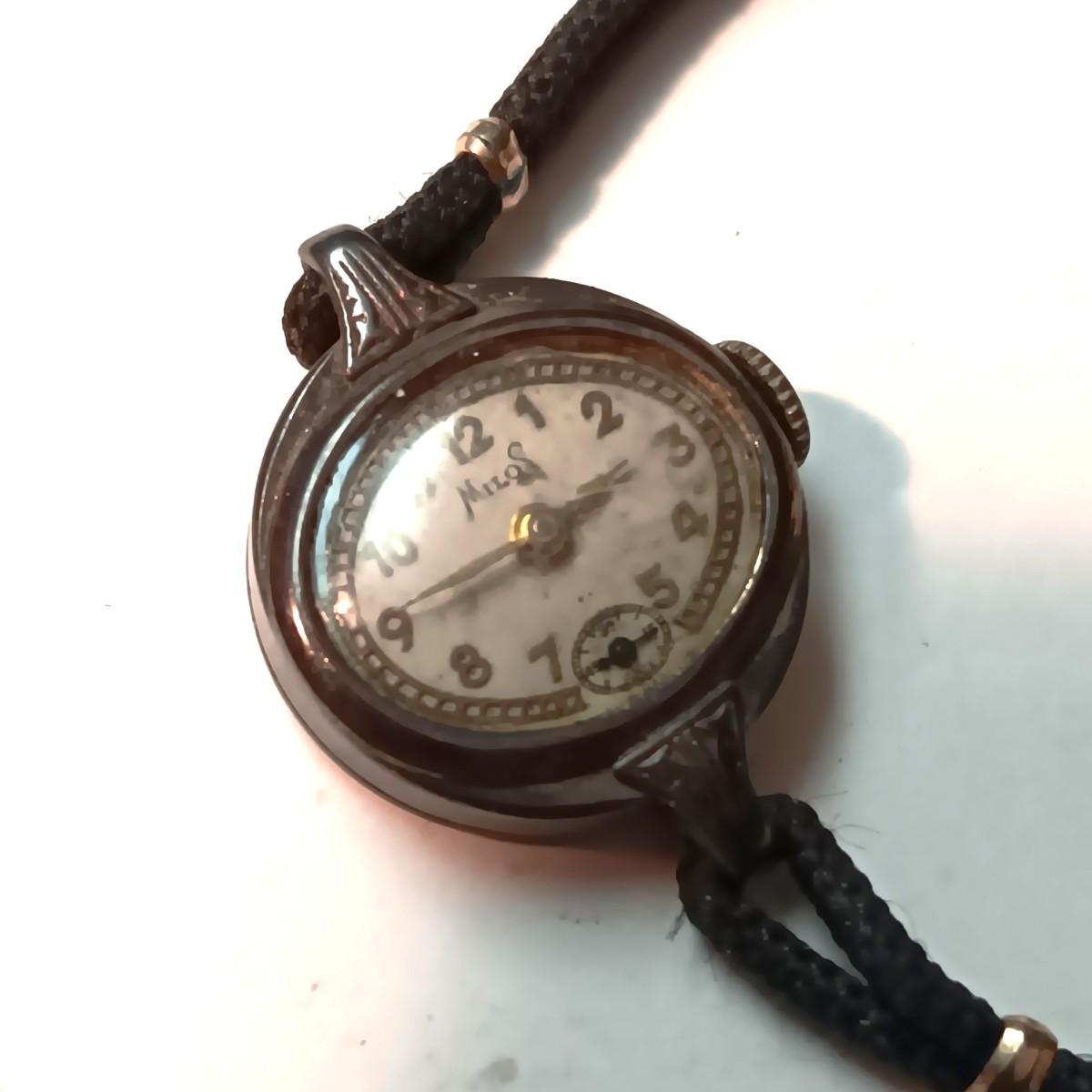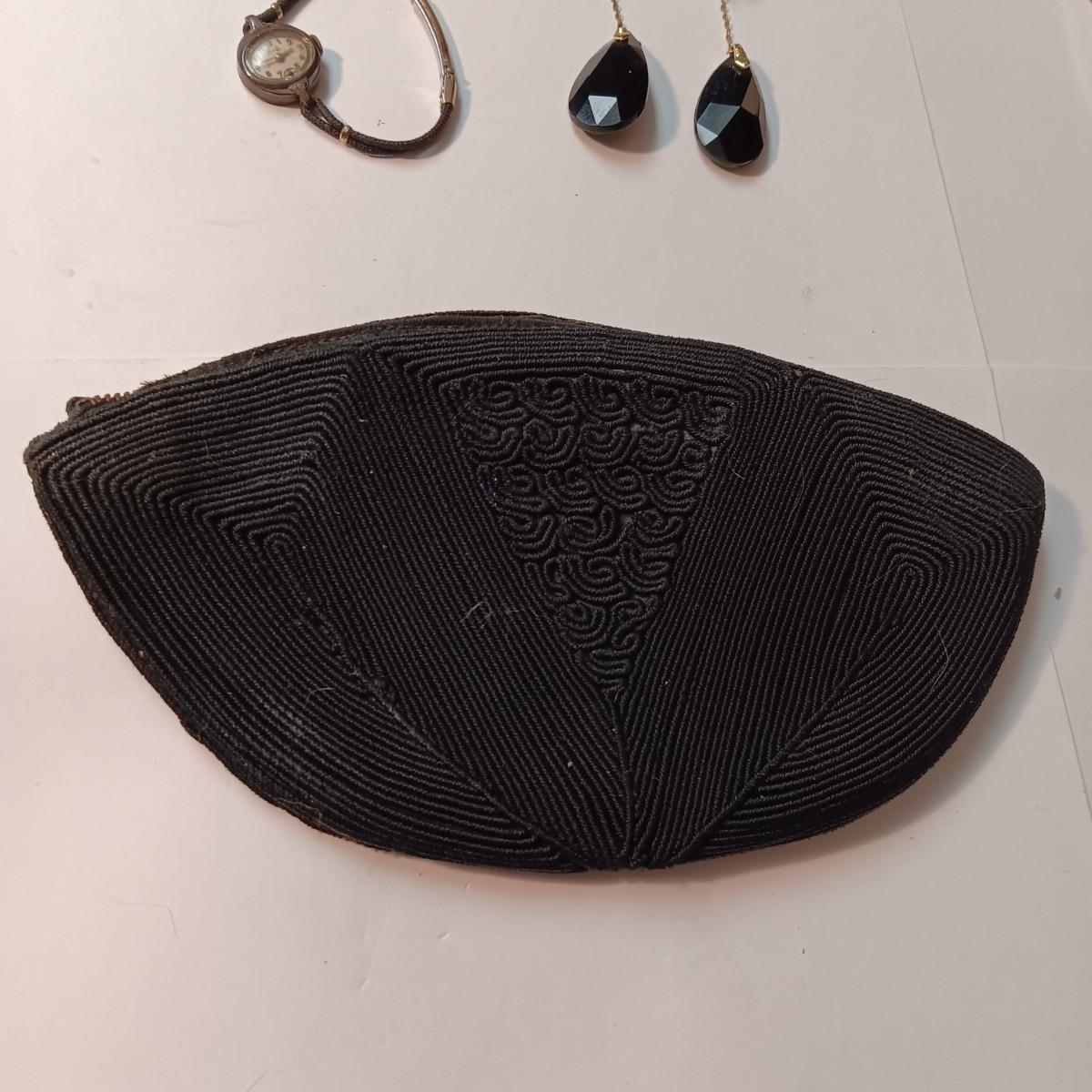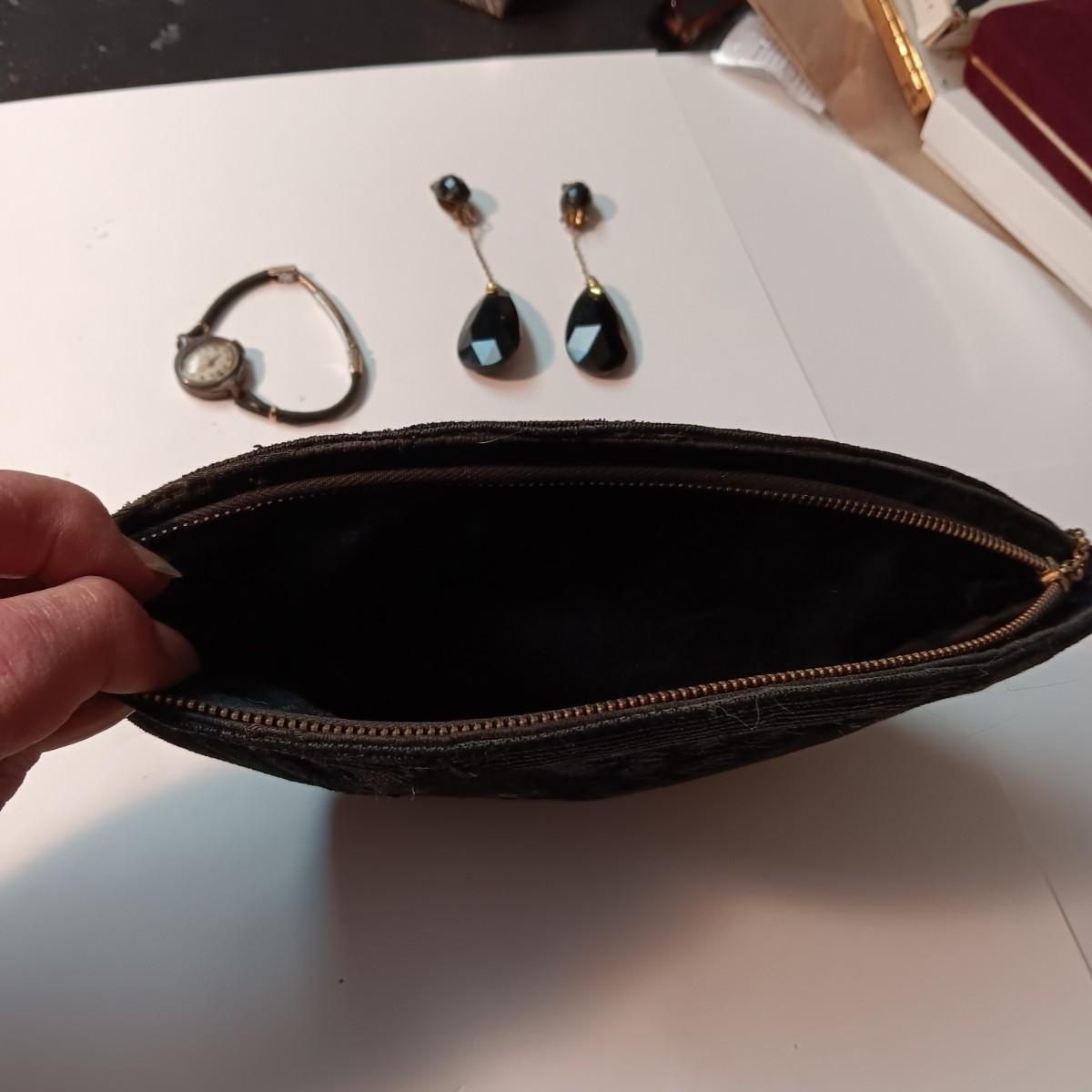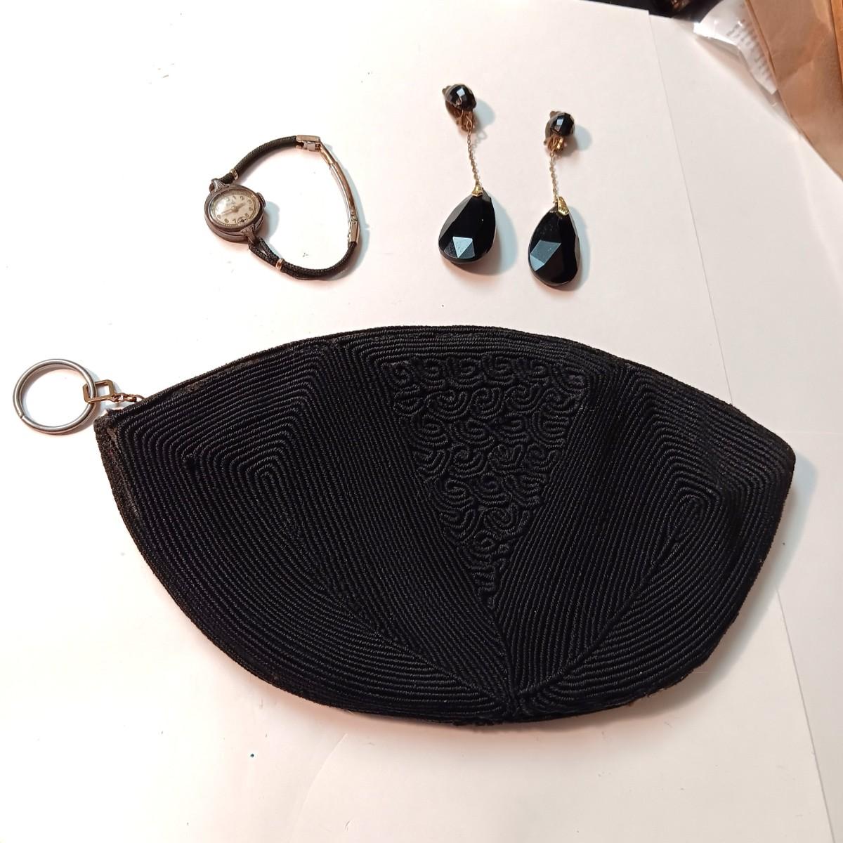 VINTAGE WEAVED CLOTH CLUTCH PURSE, MILOS WATCH AND CRYSTAL EARRINGS