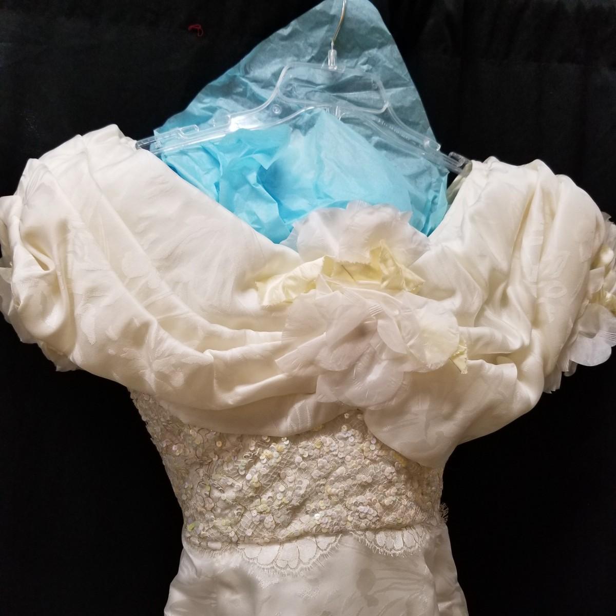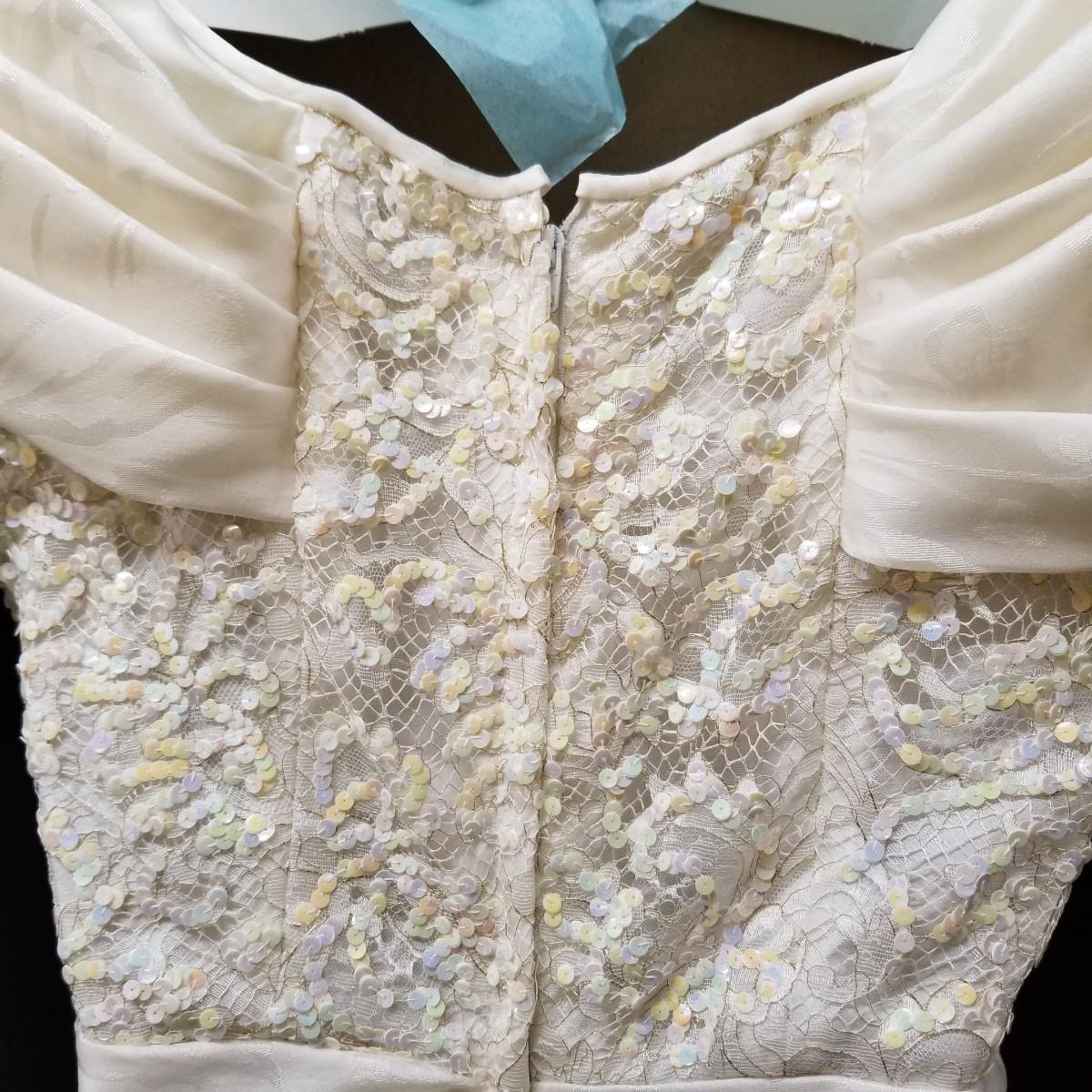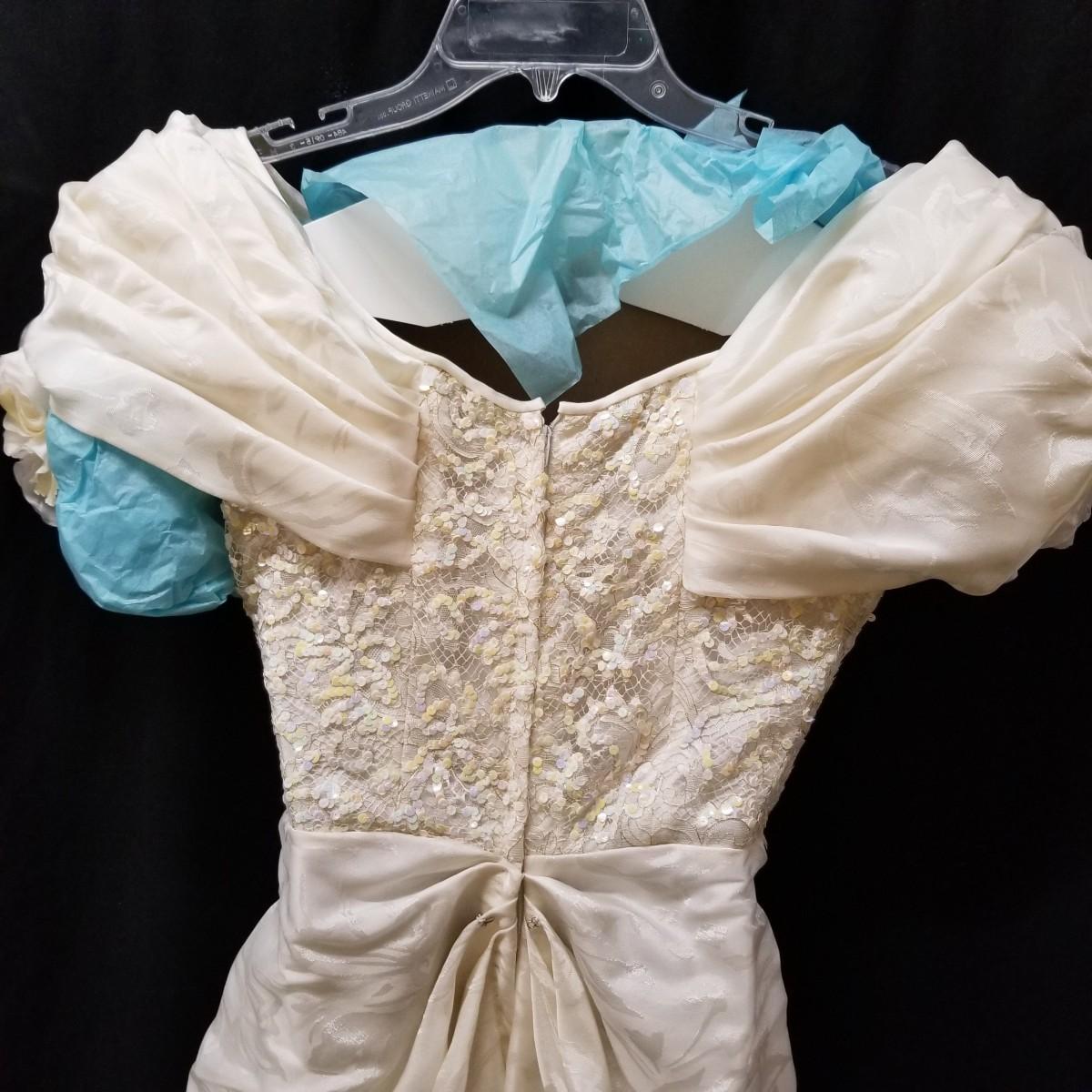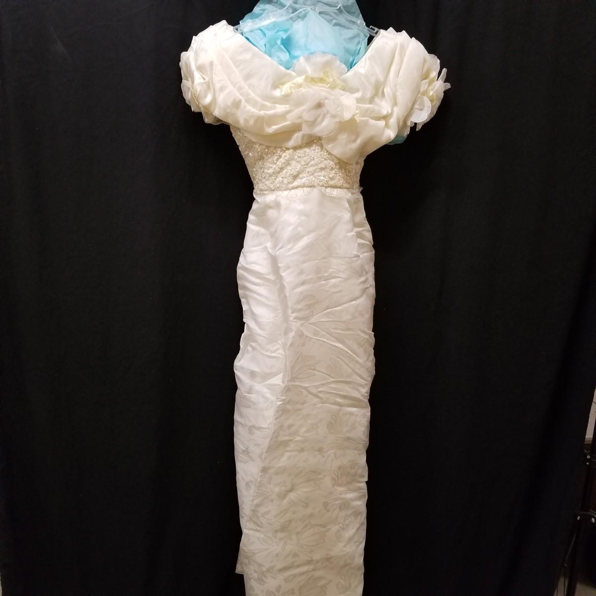 A beautiful vintage dress, this ivory colored piece has cap sleeves and a detachable train. Made in England by D.P. Designs, the dress and train are made of silk, viscose and nylon. The train measures 6' x6'. There is also a hairpiece and detachable waistband. In original storage box. See photos for details. Shipping available.