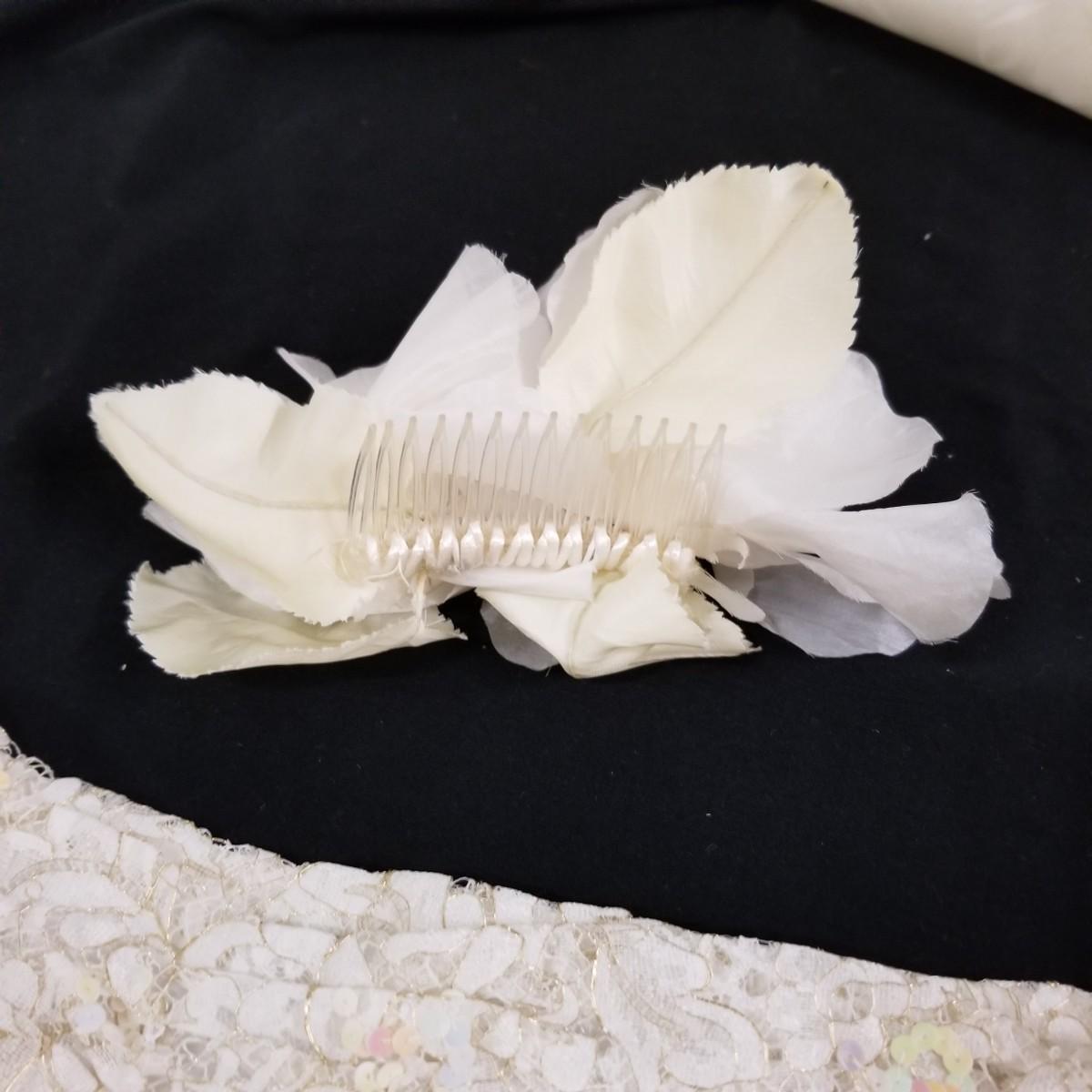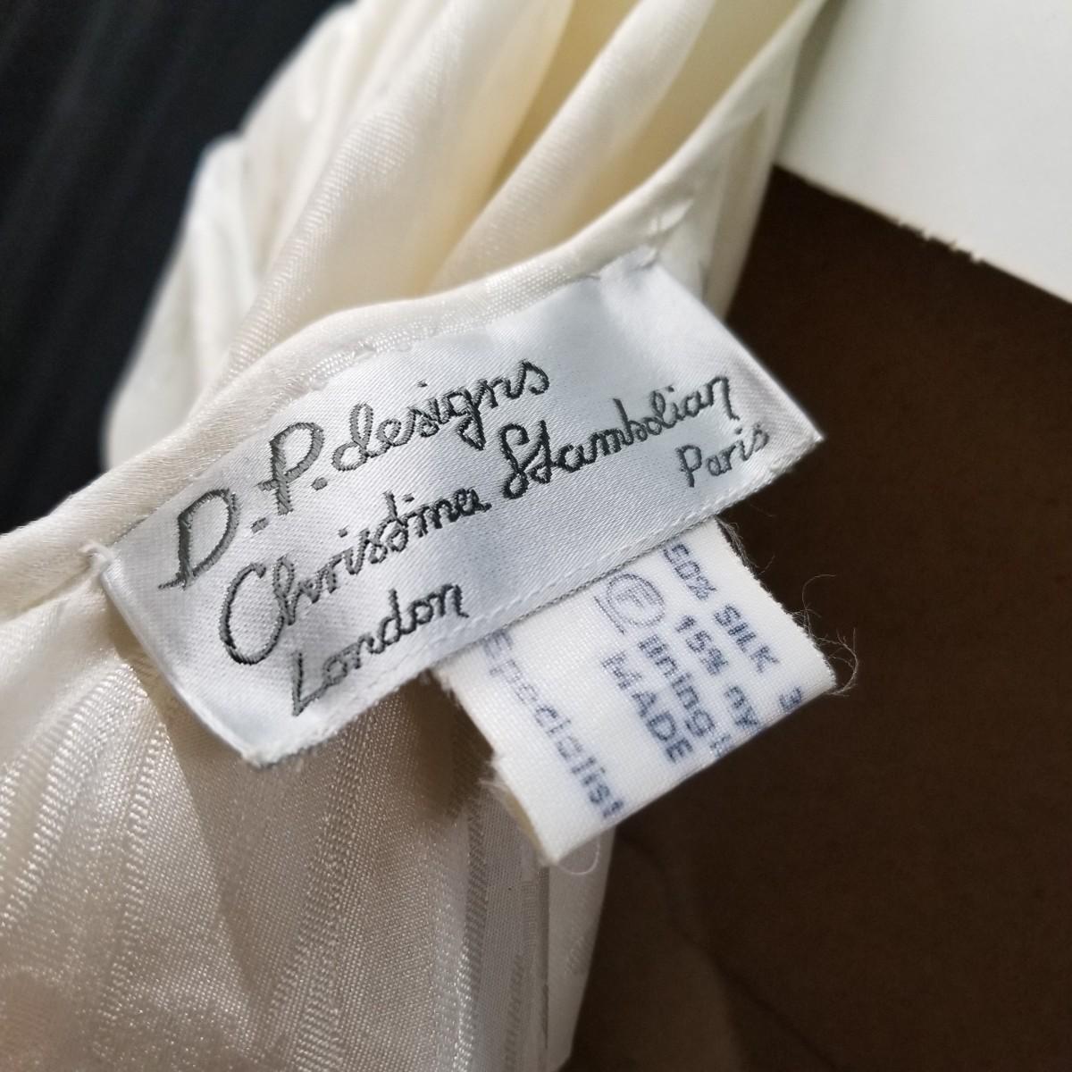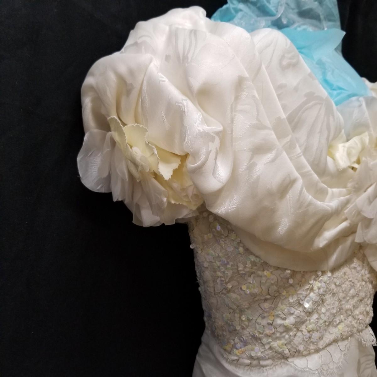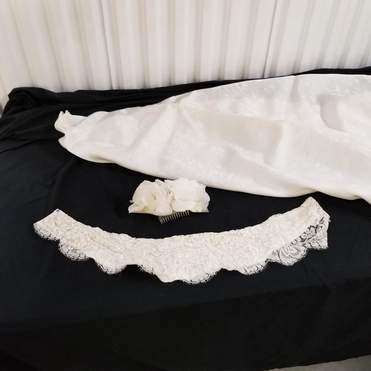 A beautiful vintage dress, this ivory colored piece has cap sleeves and a detachable train. Made in England by D.P. Designs, the dress and train are made of silk, viscose and nylon. The train measures 6' x6'. There is also a hairpiece and detachable waistband. In original storage box. See photos for details. Shipping available.