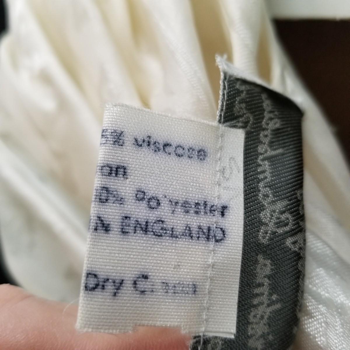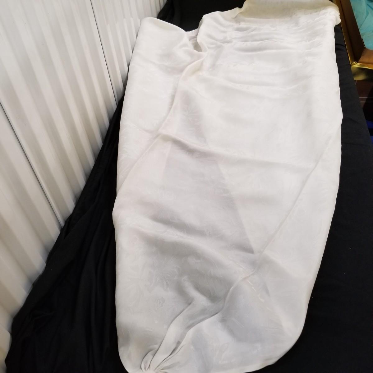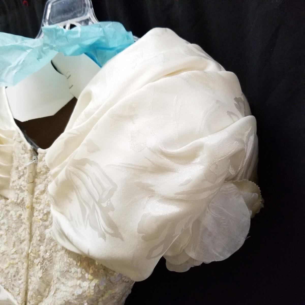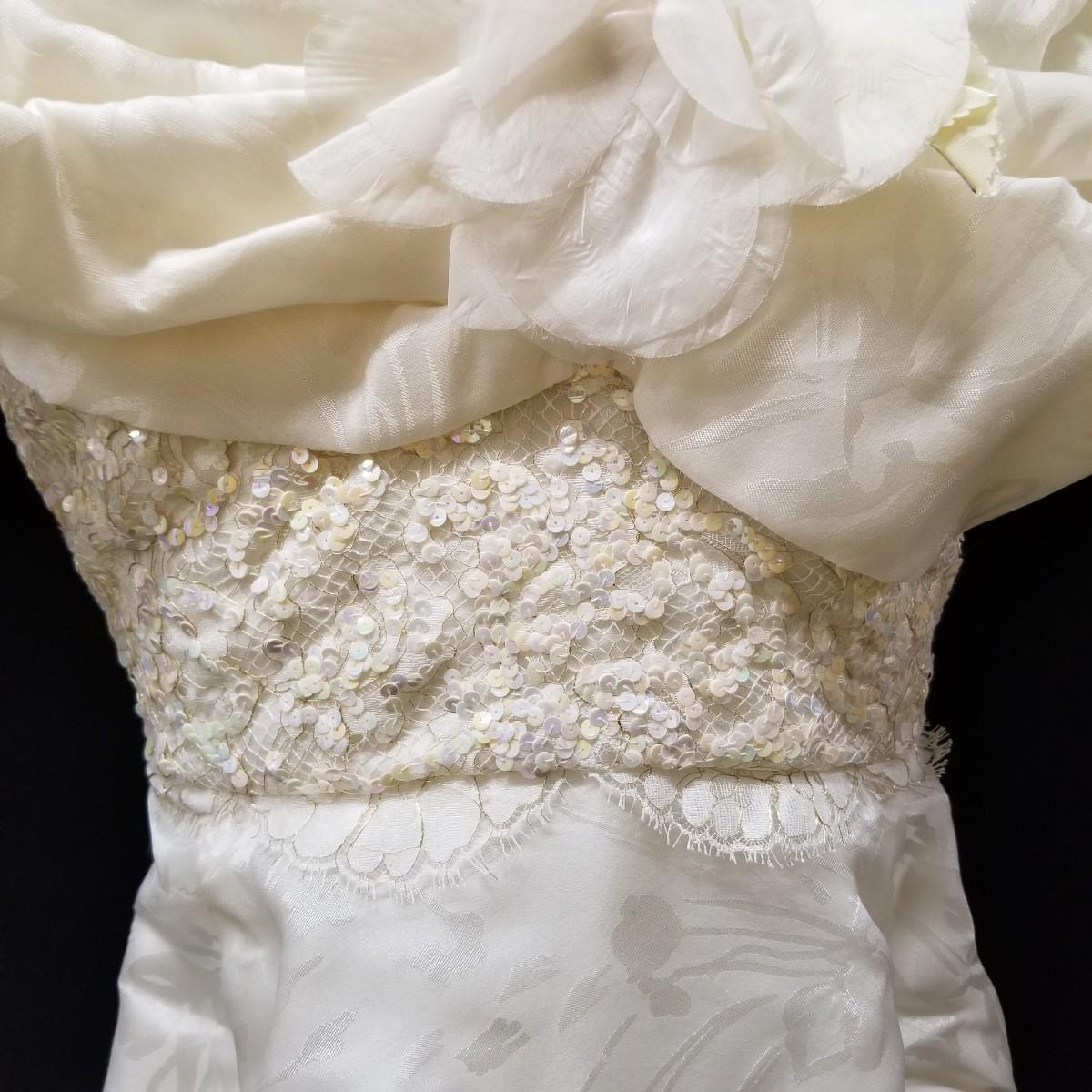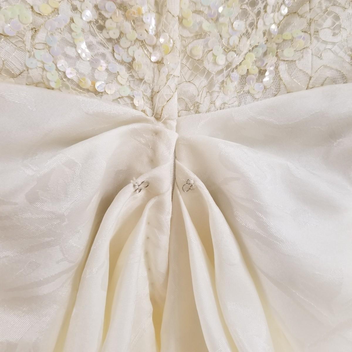 A beautiful vintage dress, this ivory colored piece has cap sleeves and a detachable train. Made in England by D.P. Designs, the dress and train are made of silk, viscose and nylon. The train measures 6' x6'. There is also a hairpiece and detachable waistband. In original storage box. See photos for details. Shipping available.