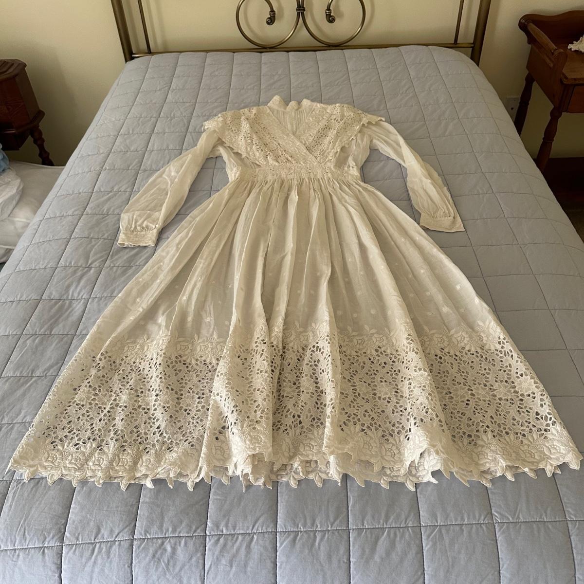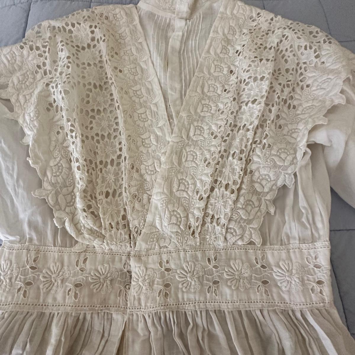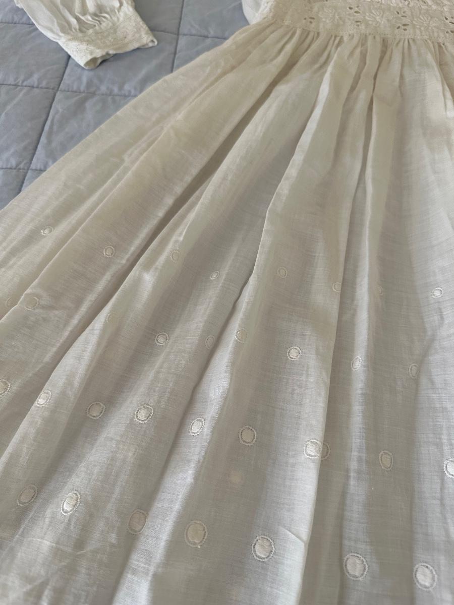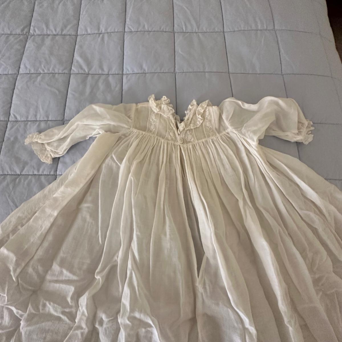Both the wedding dress and christening gown consist of two pieces each which appear to be slips. They have hook and eye and button closures. Wedding dress is 49”L x 17”W across the shoulders and appears to be small. The christening gown is 23”L x 6”W across the shoulders. There are no sizing or fabric content labels but they appear to be cotton. Shipping available.