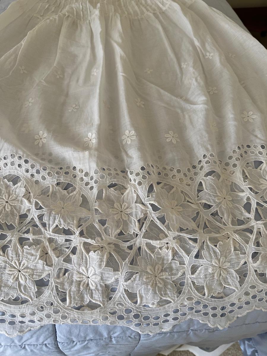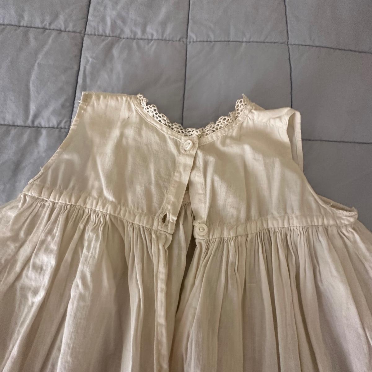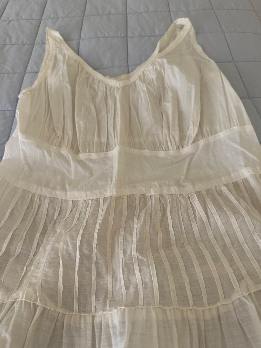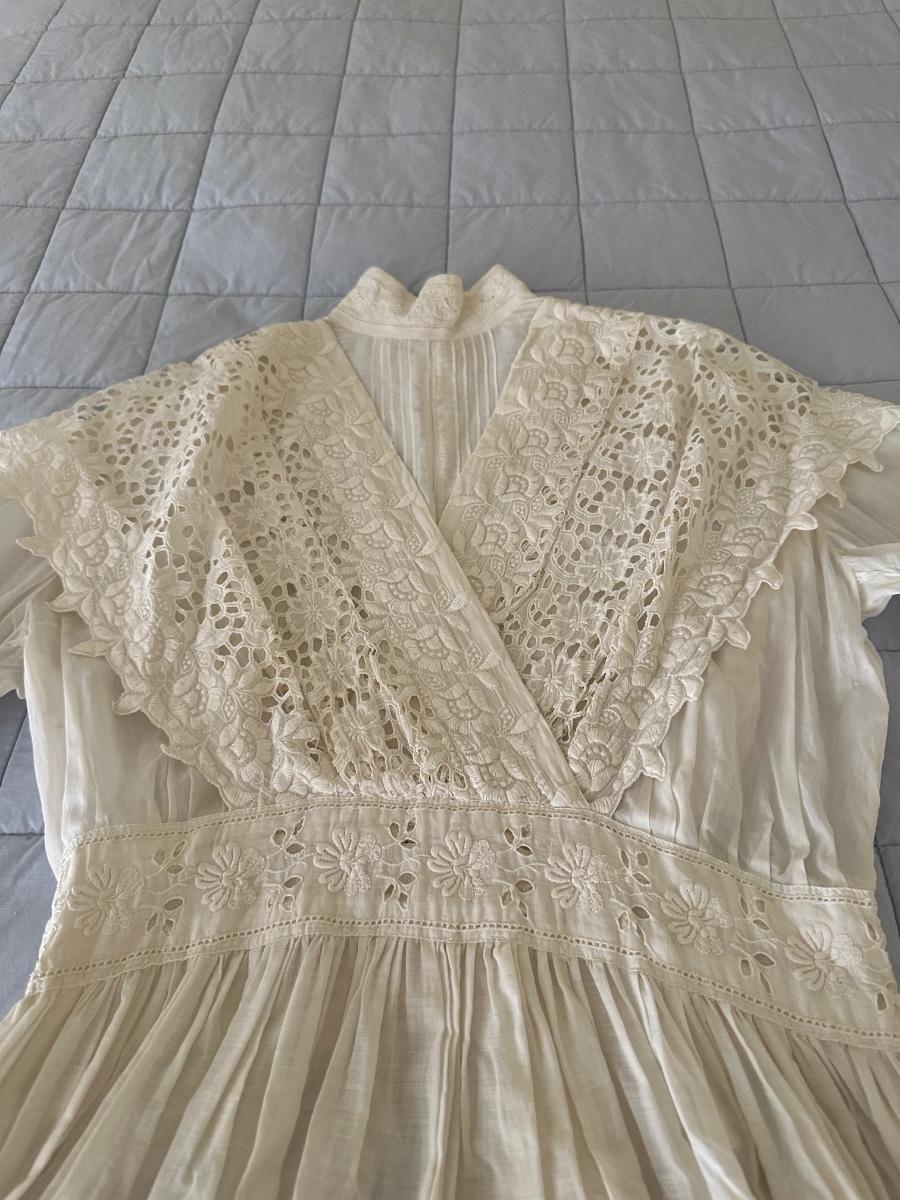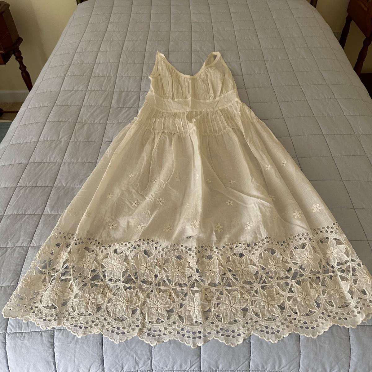 Both the wedding dress and christening gown consist of two pieces each which appear to be slips. They have hook and eye and button closures. Wedding dress is 49”L x 17”W across the shoulders and appears to be small. The christening gown is 23”L x 6”W across the shoulders. There are no sizing or fabric content labels but they appear to be cotton. Shipping available.