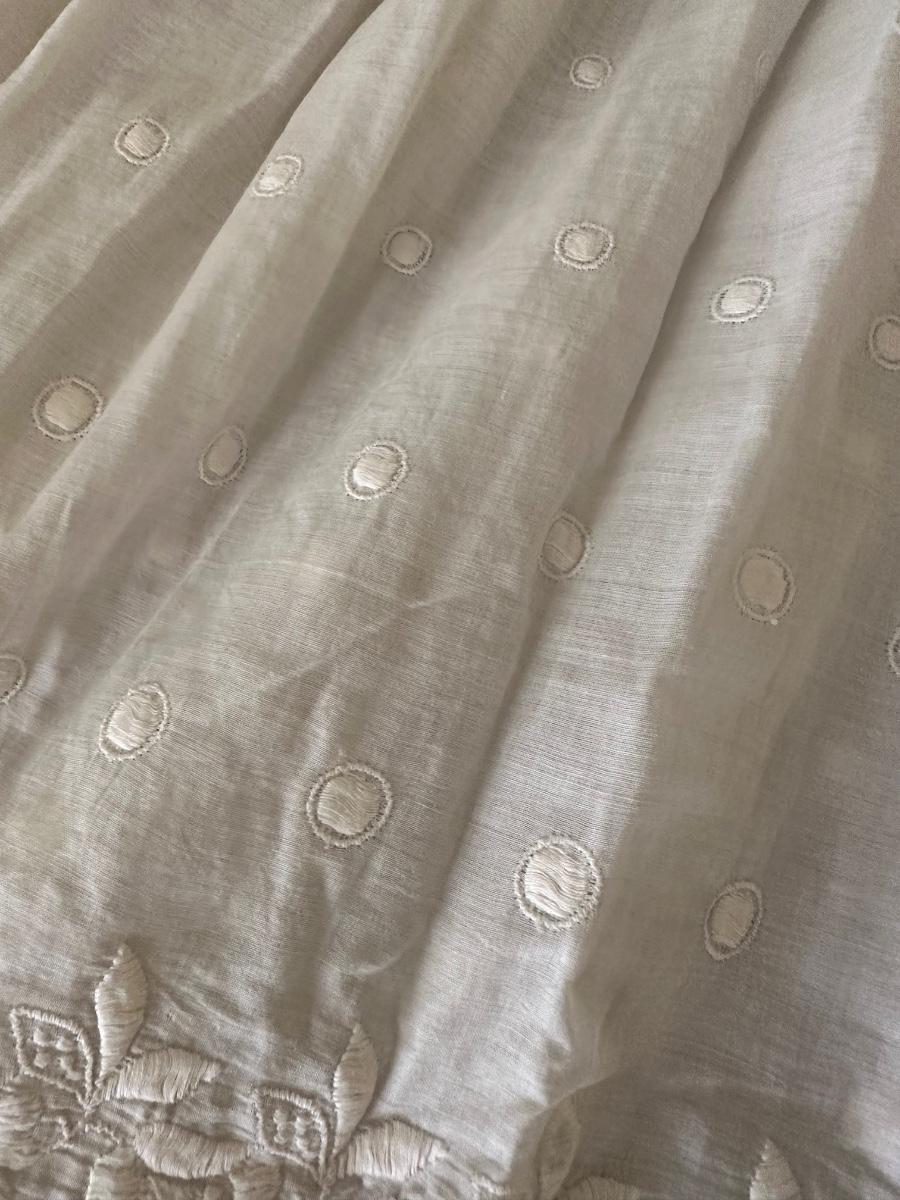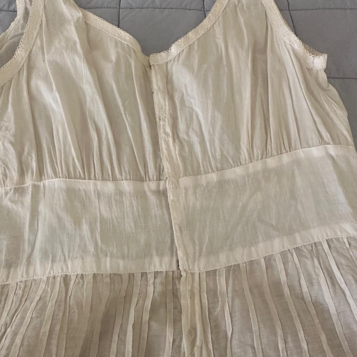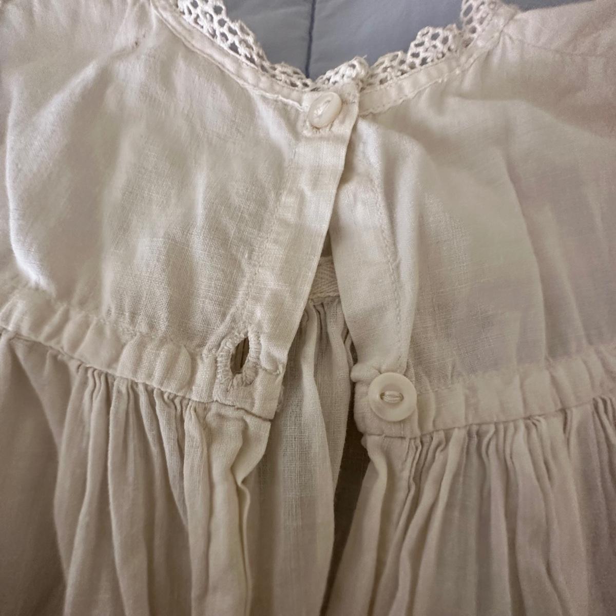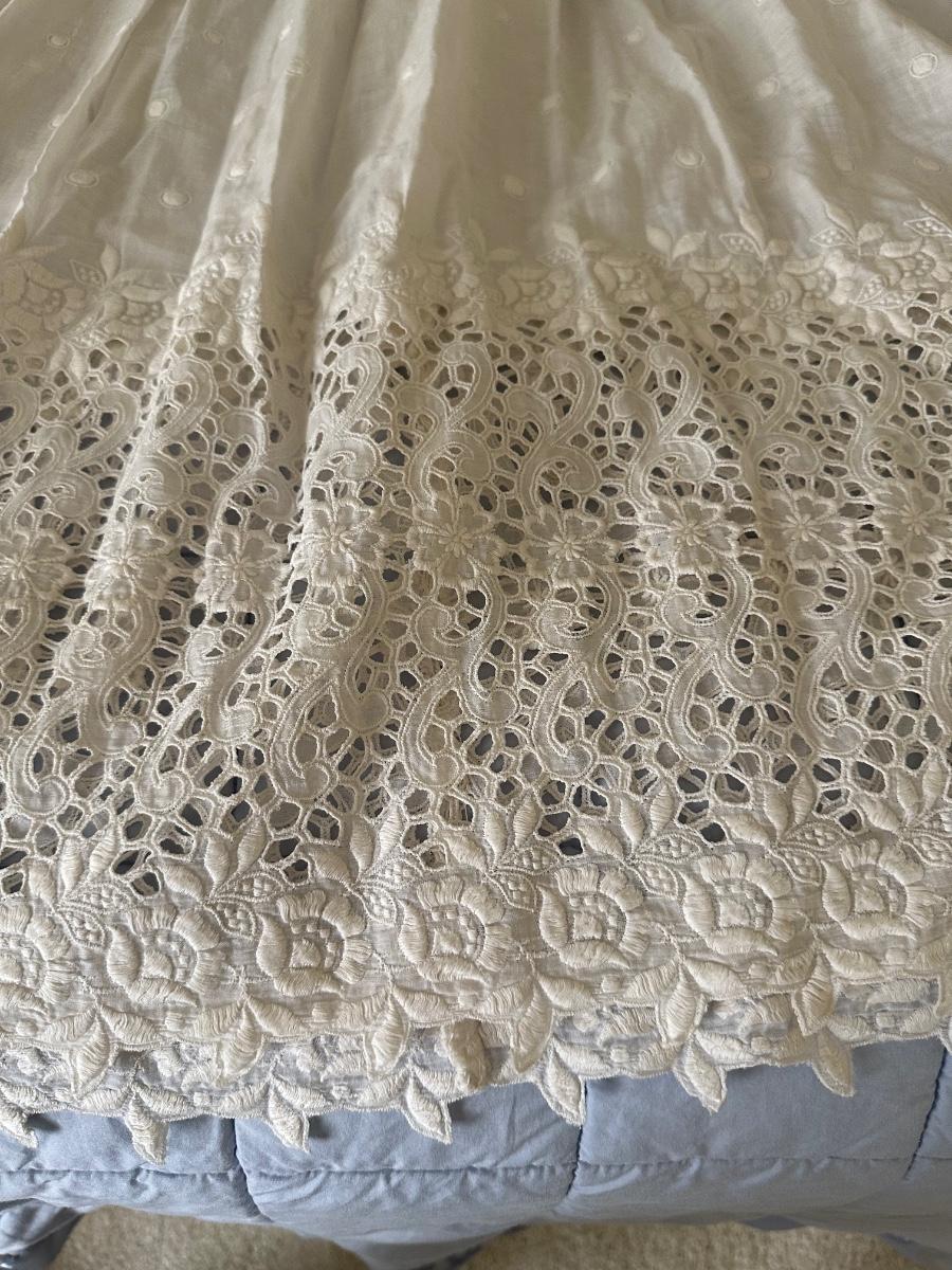 Both the wedding dress and christening gown consist of two pieces each which appear to be slips. They have hook and eye and button closures. Wedding dress is 49”L x 17”W across the shoulders and appears to be small. The christening gown is 23”L x 6”W across the shoulders. There are no sizing or fabric content labels but they appear to be cotton. Shipping available.