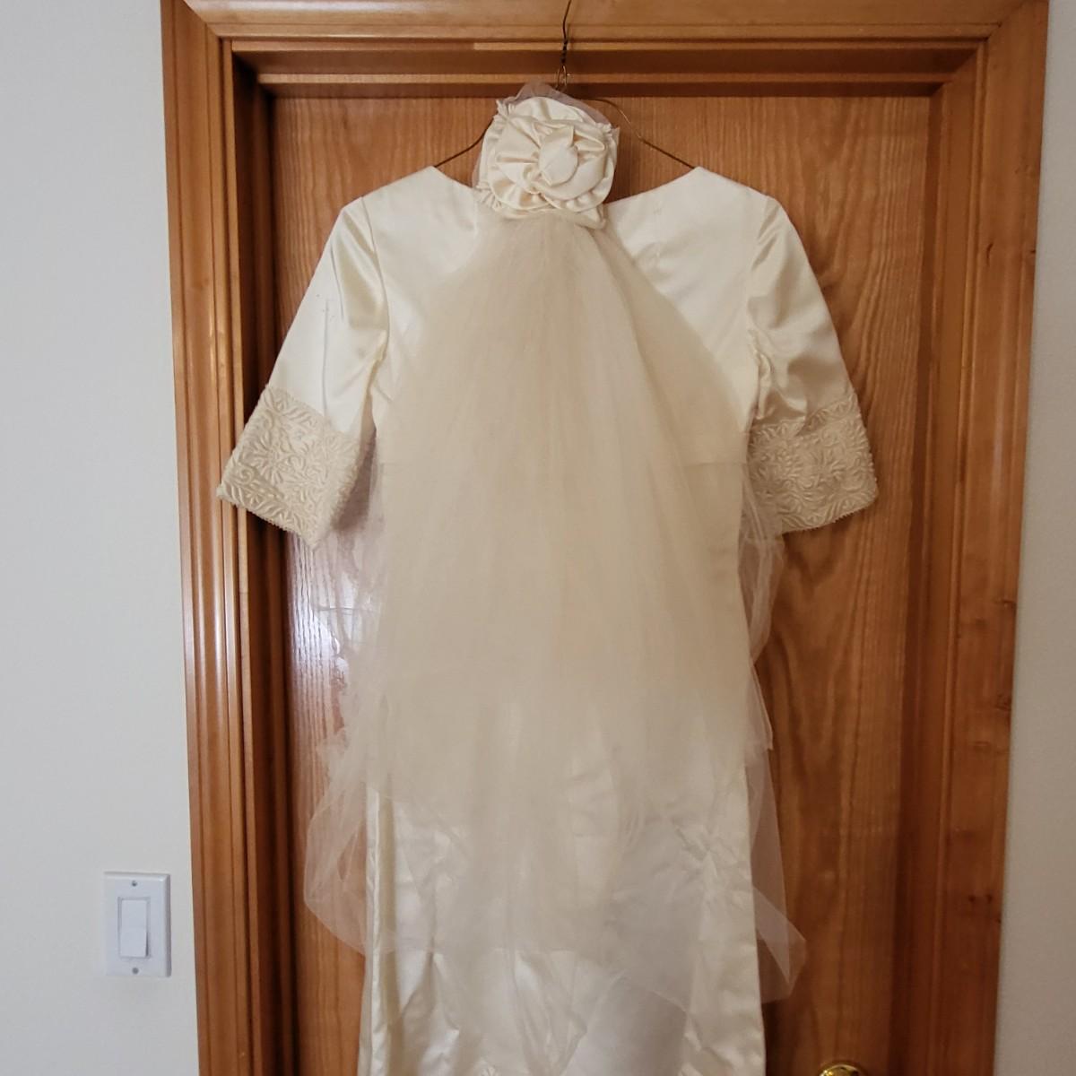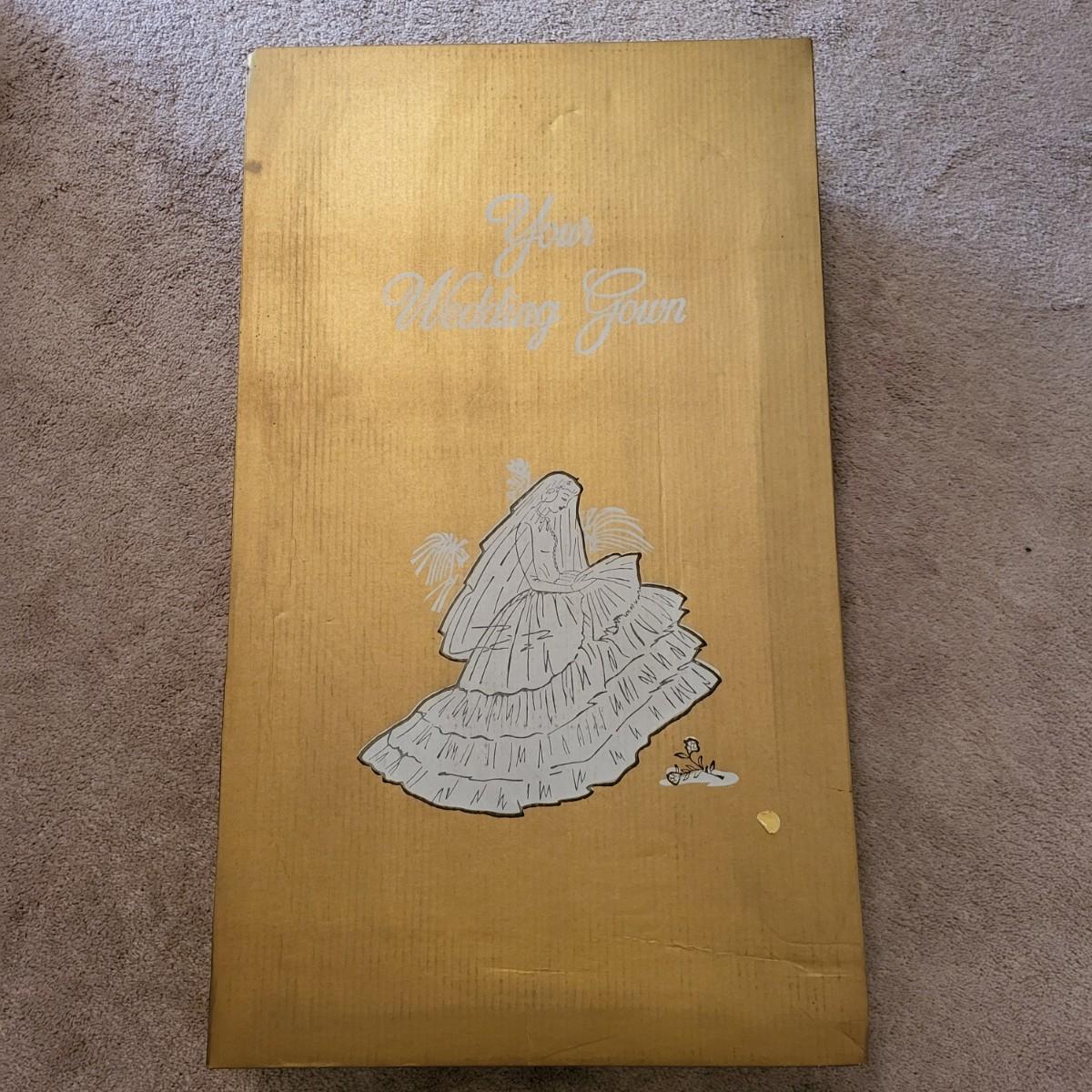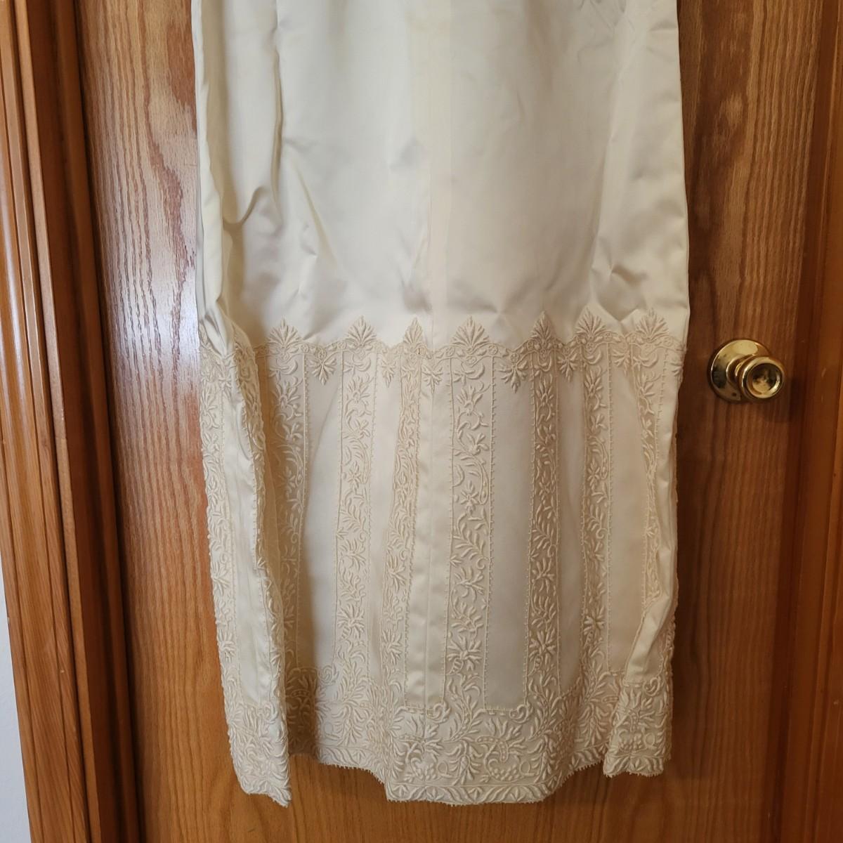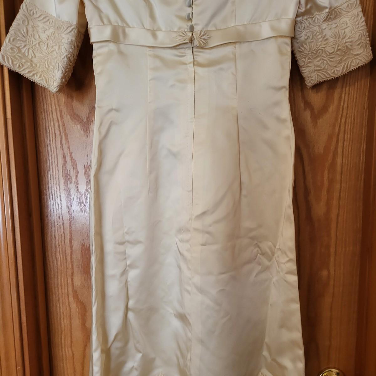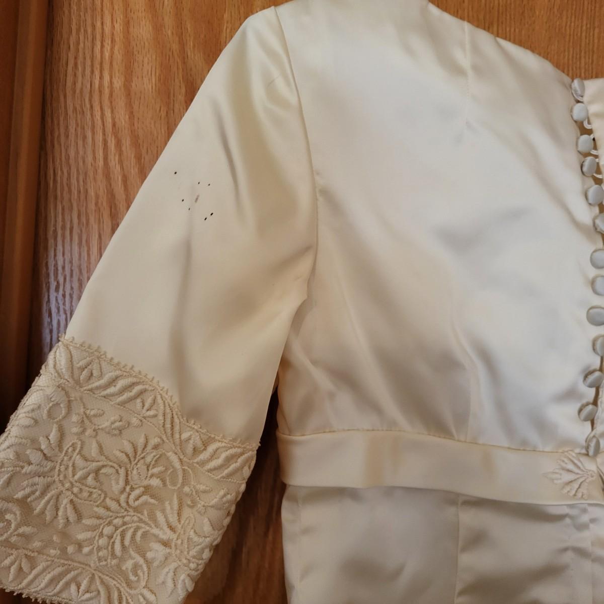 Vintage, boxed, slim satin wedding dress. Ivory color. Gorgeous lace embroidered trim. Dress is about a size 6. It has a 26" waist, 15" shoulder to shoulder and is 55" long. Comes with train and veil. There is a few tiny spots one one of the sleeves.