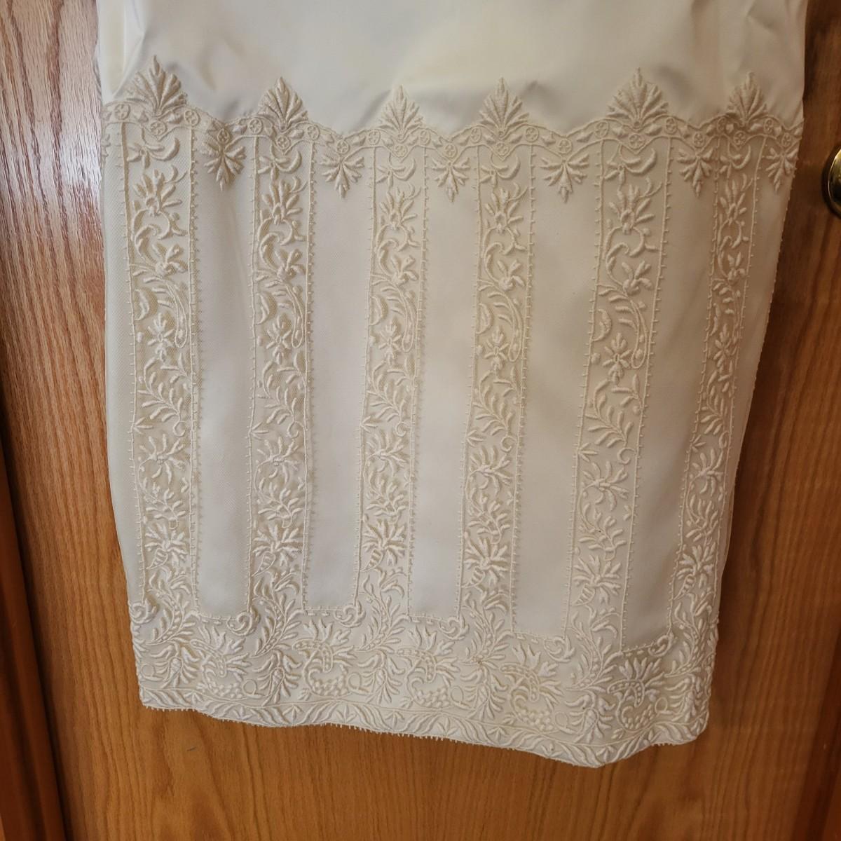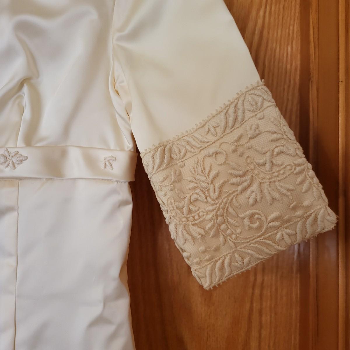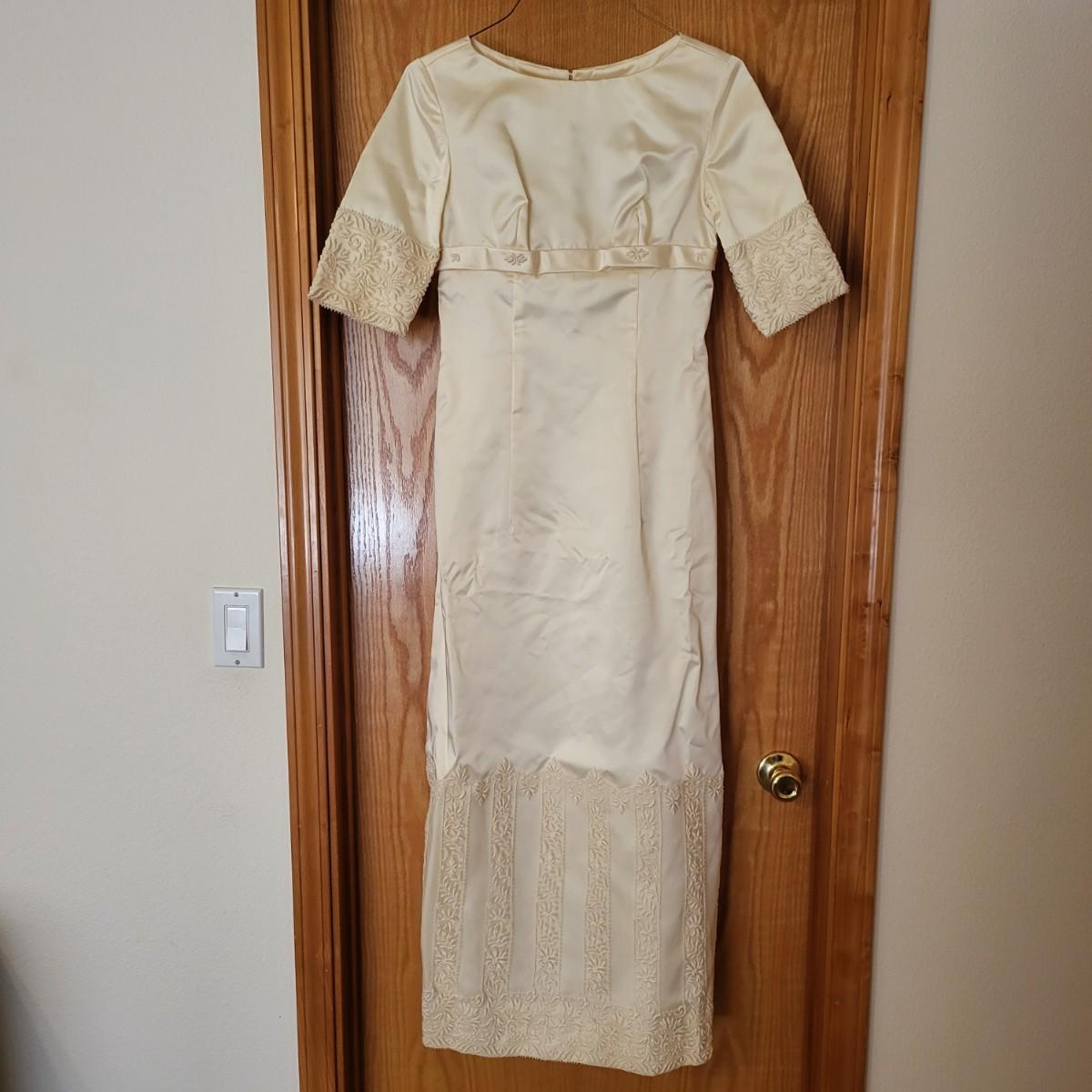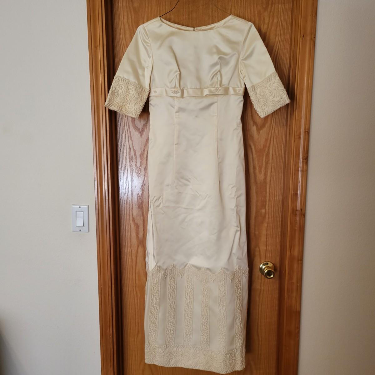 Vintage, boxed, slim satin wedding dress. Ivory color. Gorgeous lace embroidered trim. Dress is about a size 6. It has a 26" waist, 15" shoulder to shoulder and is 55" long. Comes with train and veil. There is a few tiny spots one one of the sleeves.