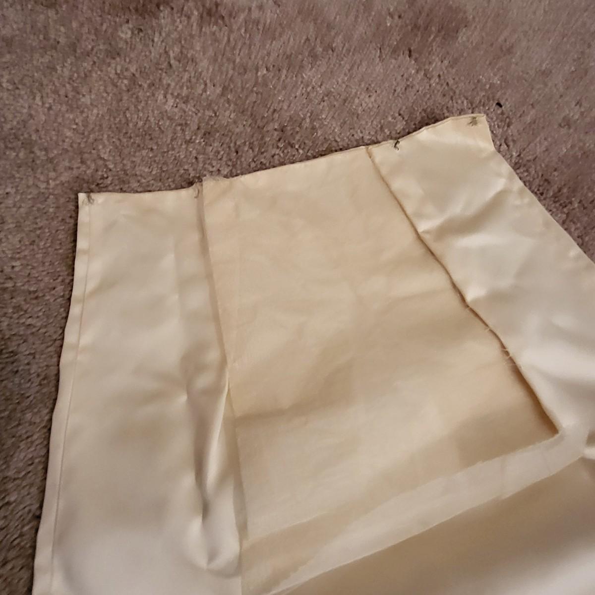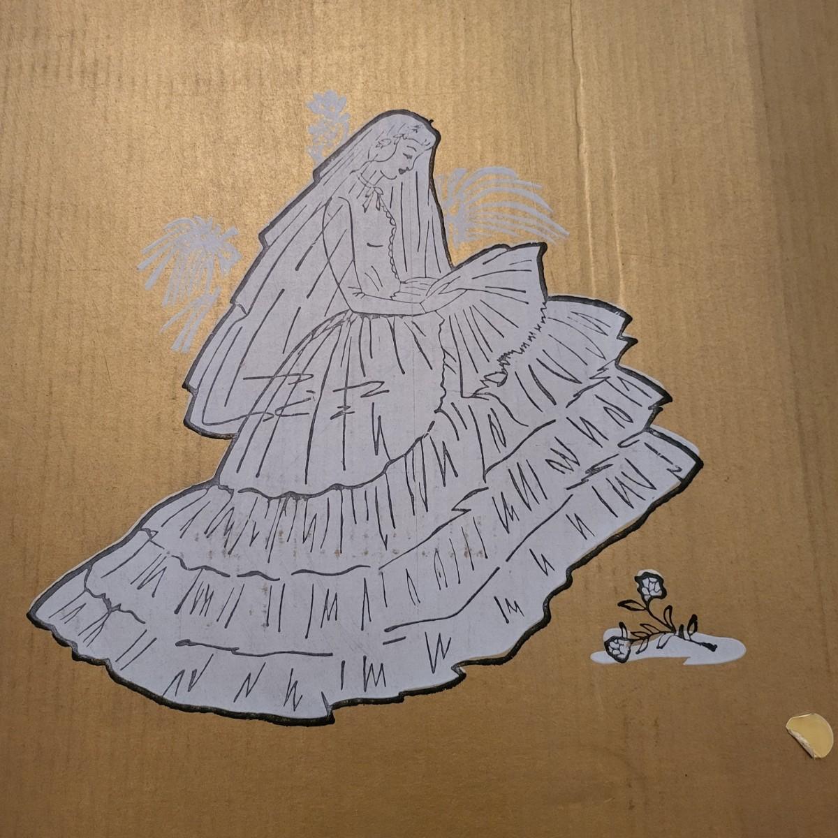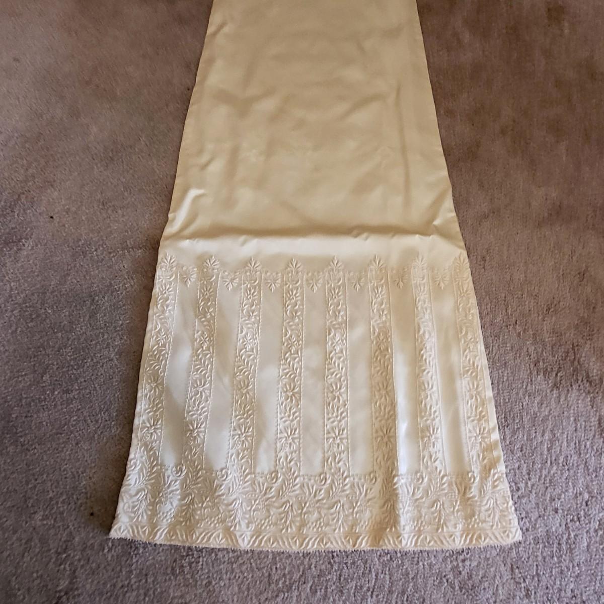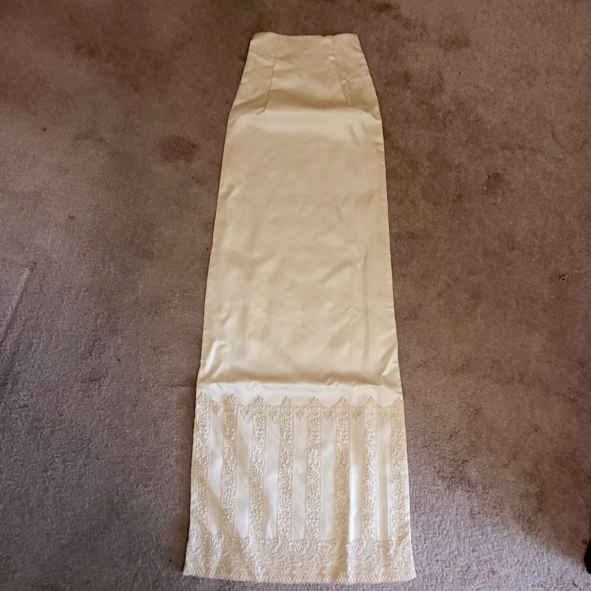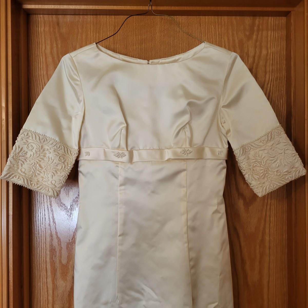 Vintage, boxed, slim satin wedding dress. Ivory color. Gorgeous lace embroidered trim. Dress is about a size 6. It has a 26" waist, 15" shoulder to shoulder and is 55" long. Comes with train and veil. There is a few tiny spots one one of the sleeves.