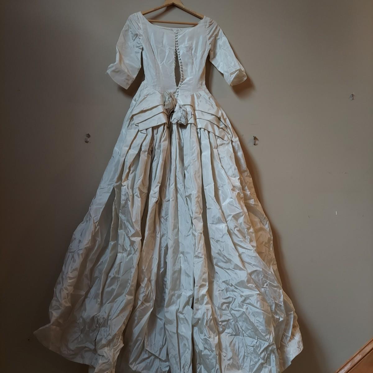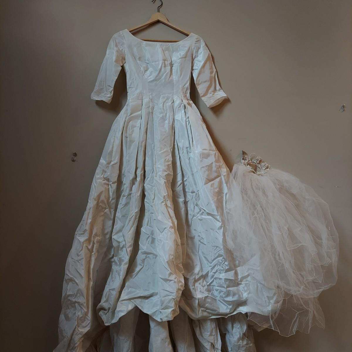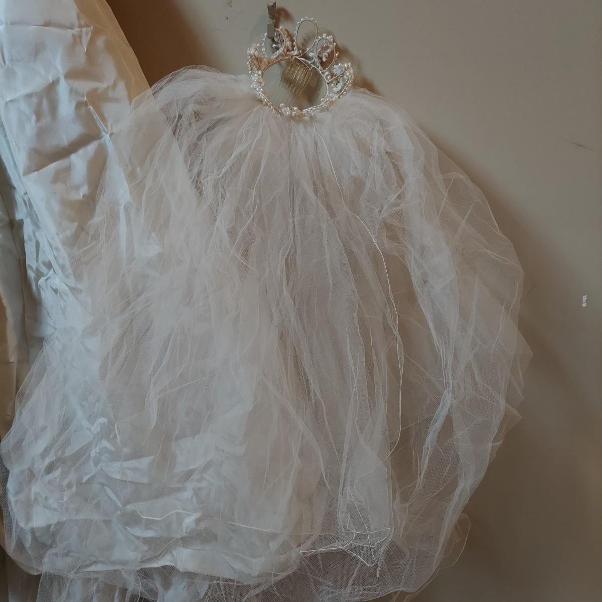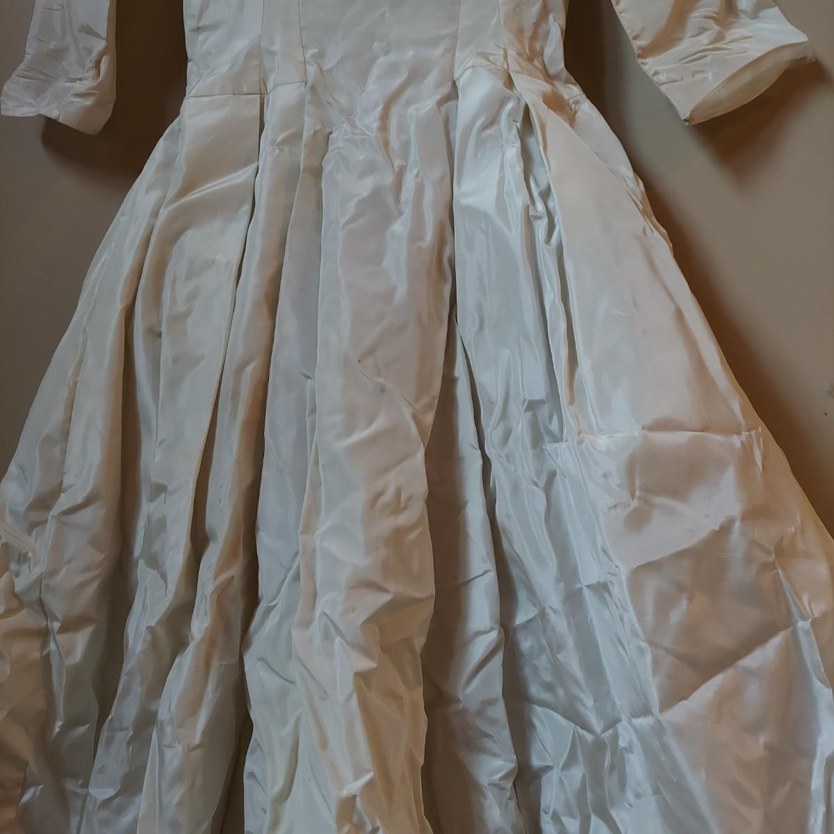 Vintage wedding dress and Veil. From the late 50s or early 60s based on age of client. Off White taffeta with lining. Buttons up the back. From armpit to armpit it measures 15" across which is approximately a 30" bust. The waist measures 12" across which is approximately a 24" waist. Has not been stored in an airtight container. Will need cleaned. Shipping available.