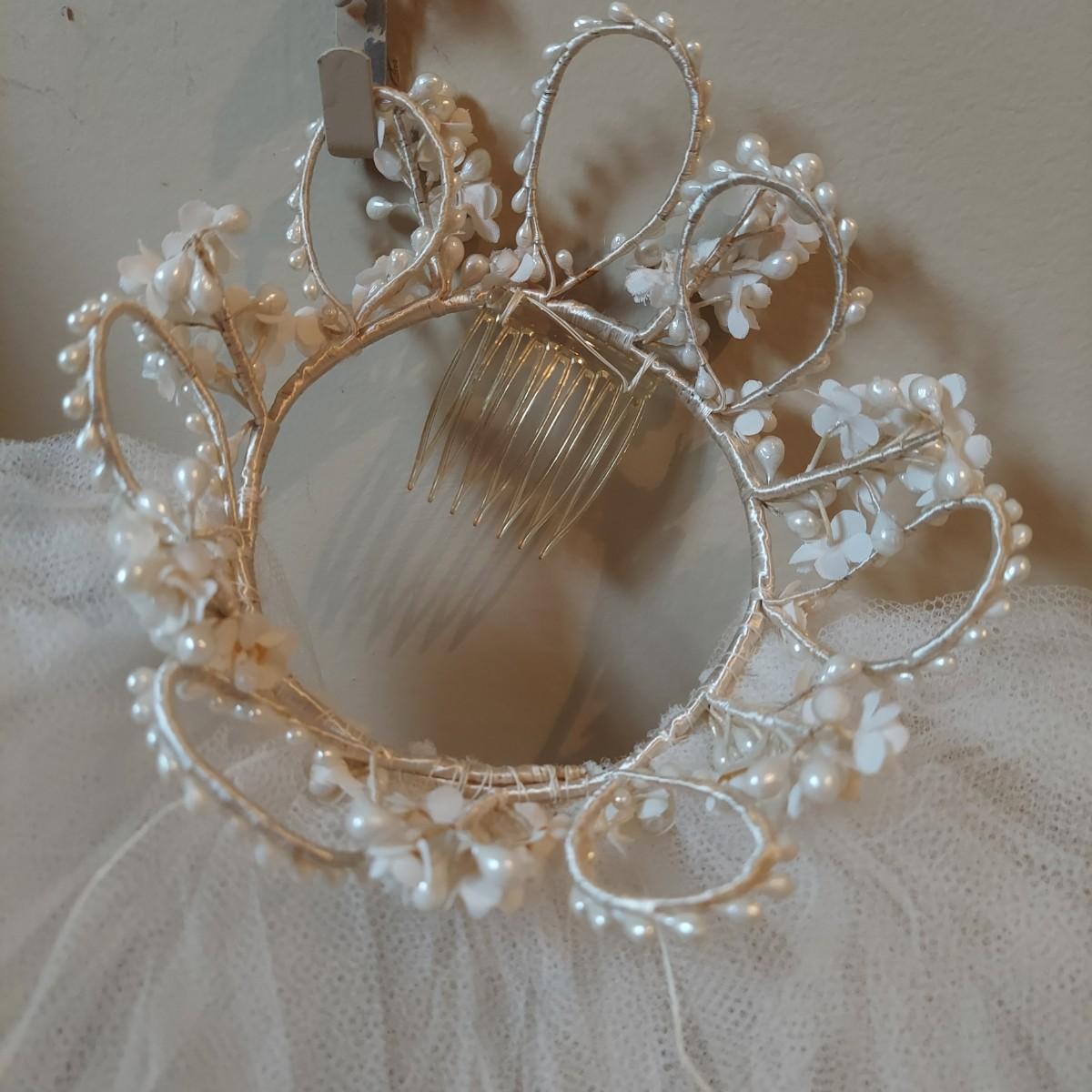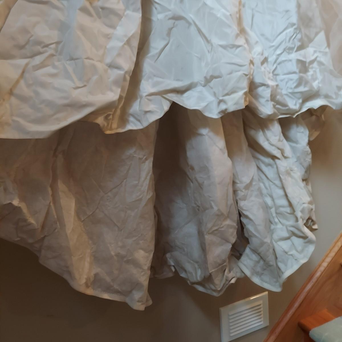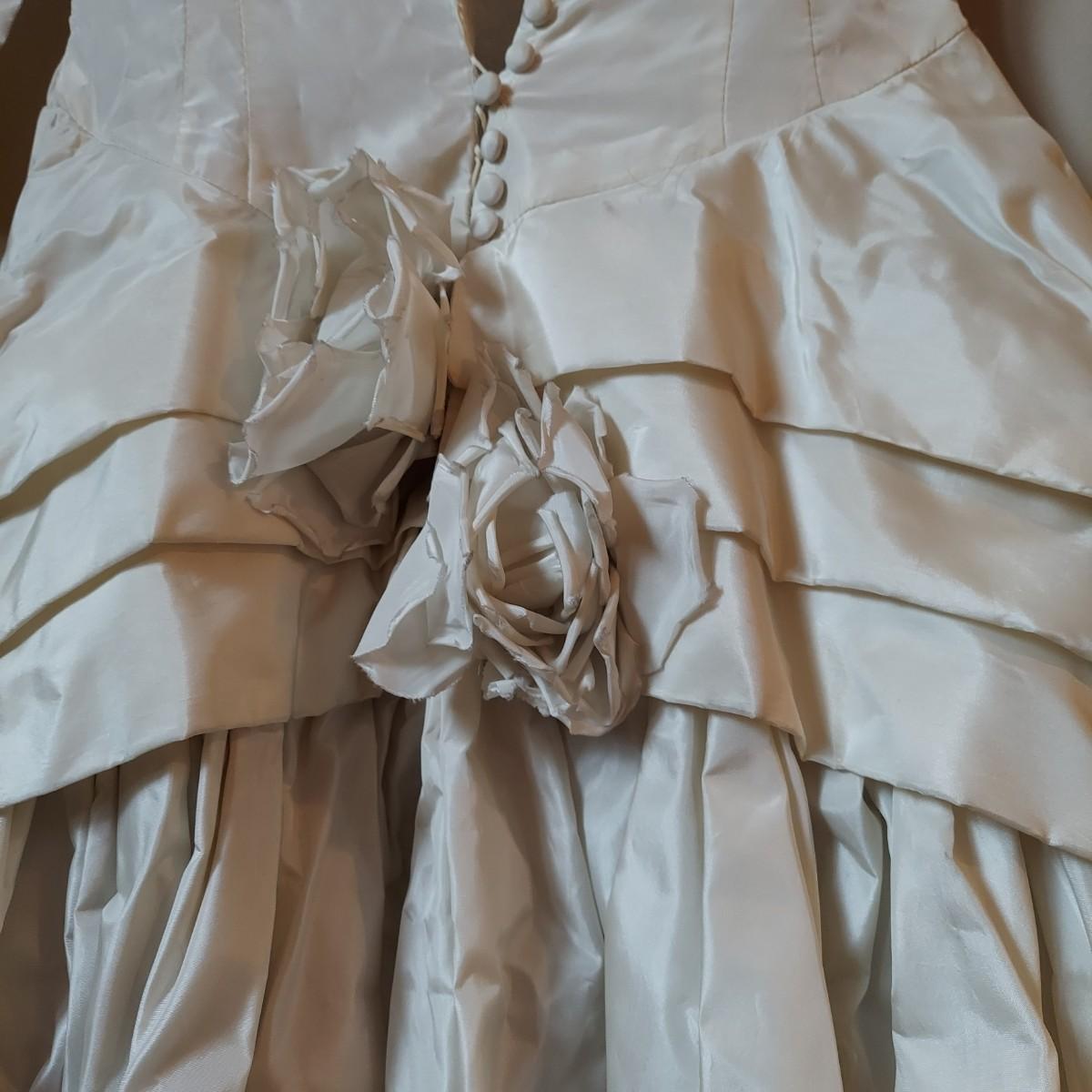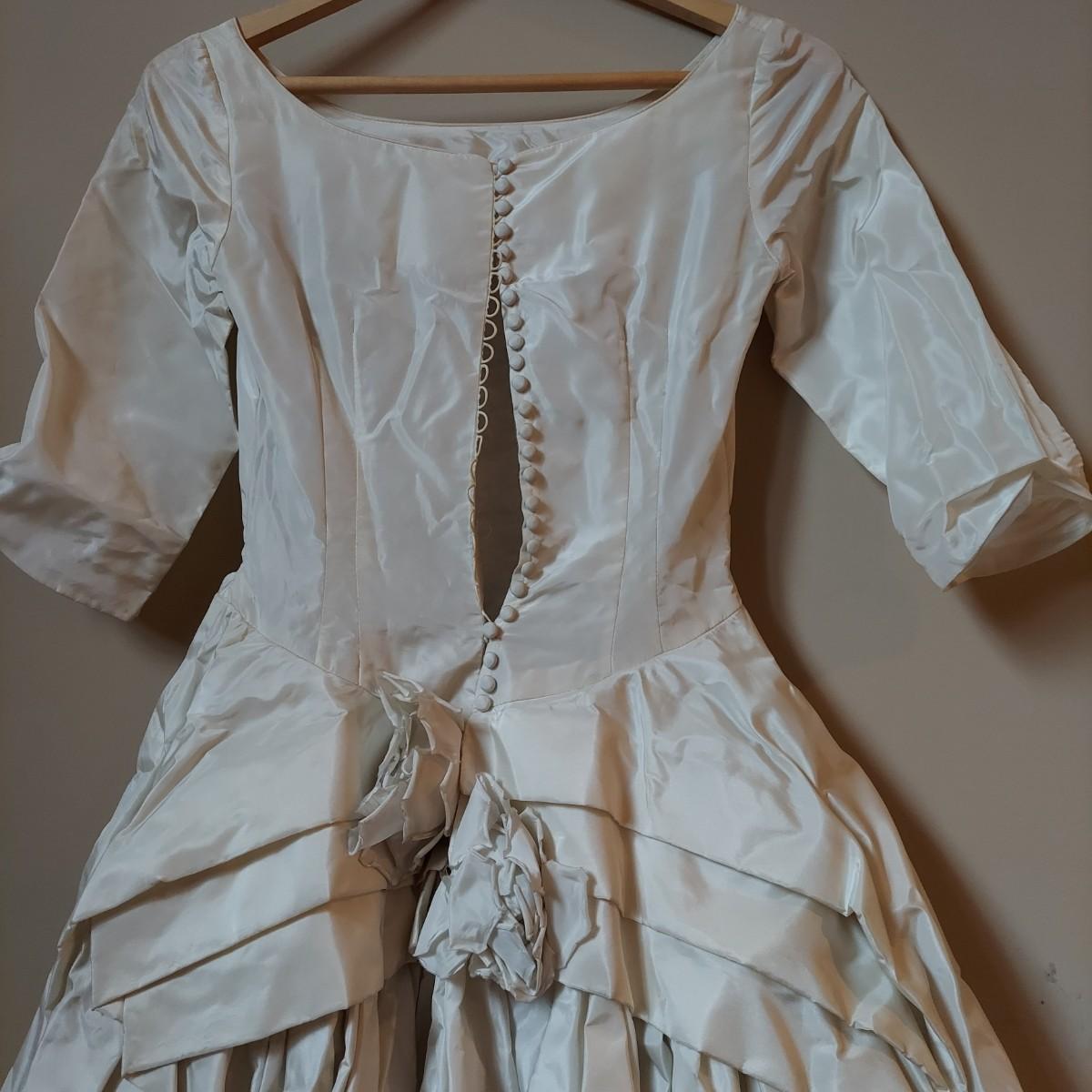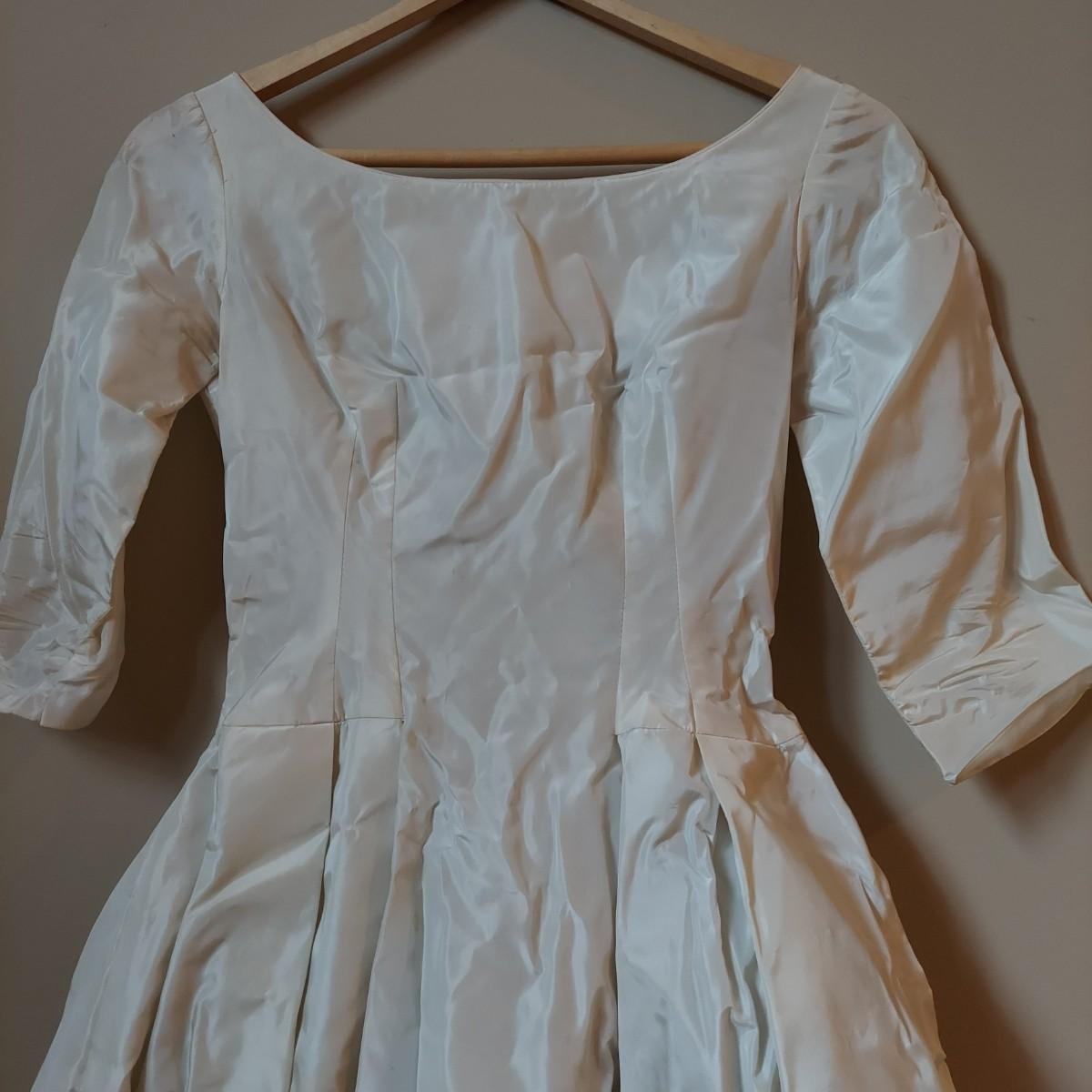 Vintage wedding dress and Veil. From the late 50s or early 60s based on age of client. Off White taffeta with lining. Buttons up the back. From armpit to armpit it measures 15" across which is approximately a 30" bust. The waist measures 12" across which is approximately a 24" waist. Has not been stored in an airtight container. Will need cleaned. Shipping available.