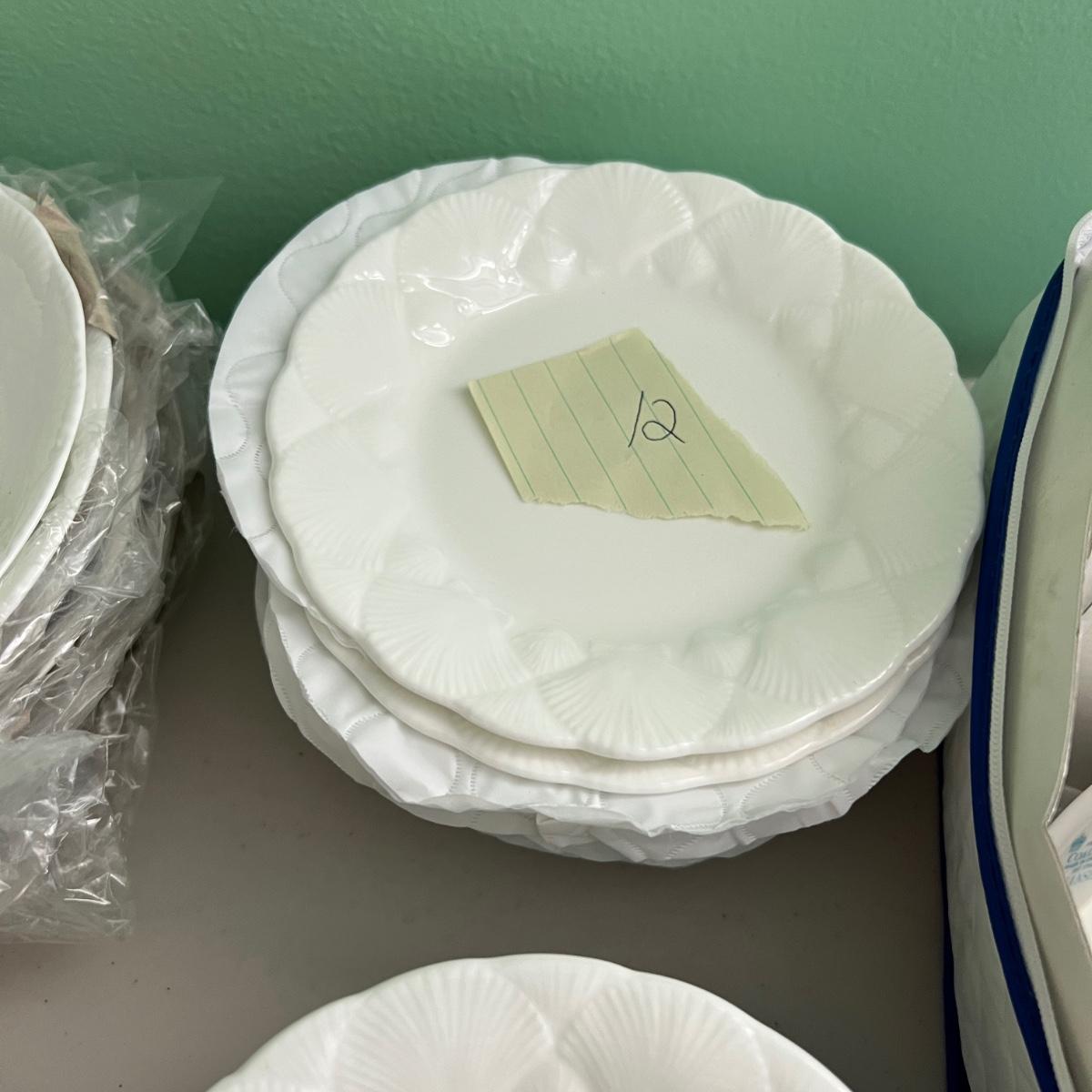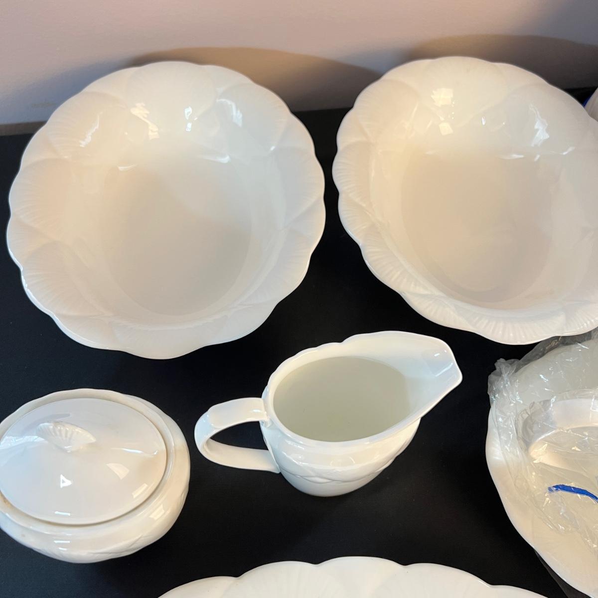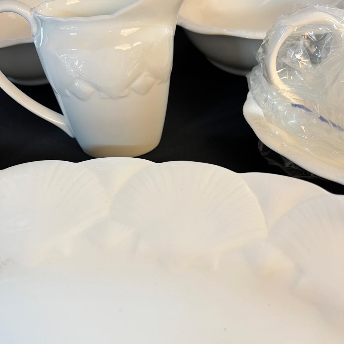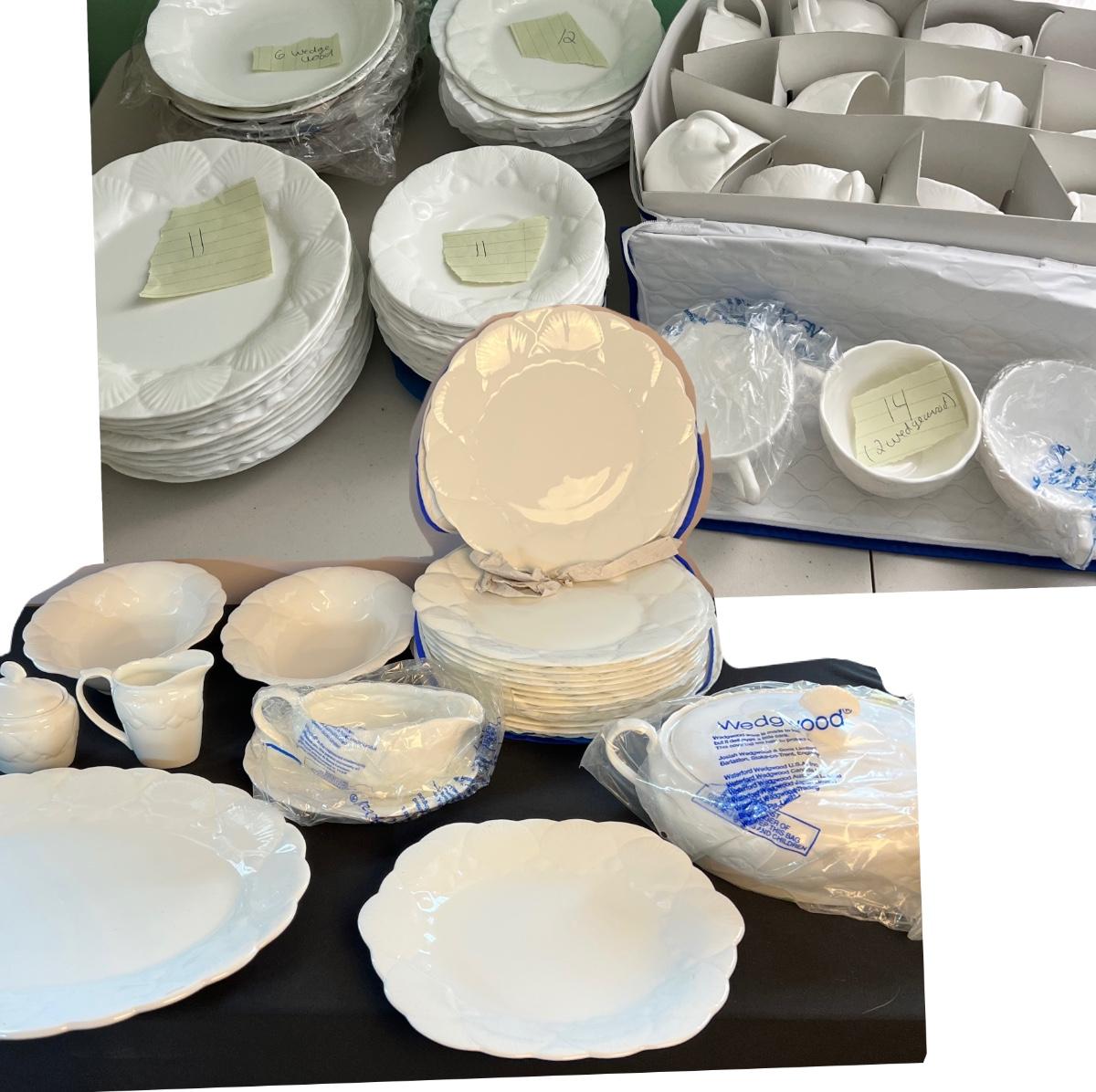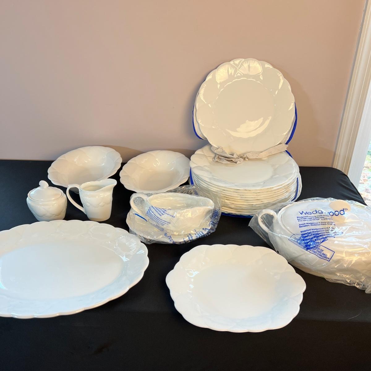 Pristine Wedgewood "Oceanside" white seashell dinnerware set including 12 dinner plates, 1 covered bowl with seashell handle, 1 gravy boat, 1 gravy plate, 1 platter, 1 cream, 1 sugar, 2 serving bowls, 1 serving plate, 14 tea cups, 11 tea cup plates, 6 bowls, 11 dinner plates, 12 bread plates totaling 75 pieces. NOTE: PICK UP ONLY IN DUNKIRK MD.