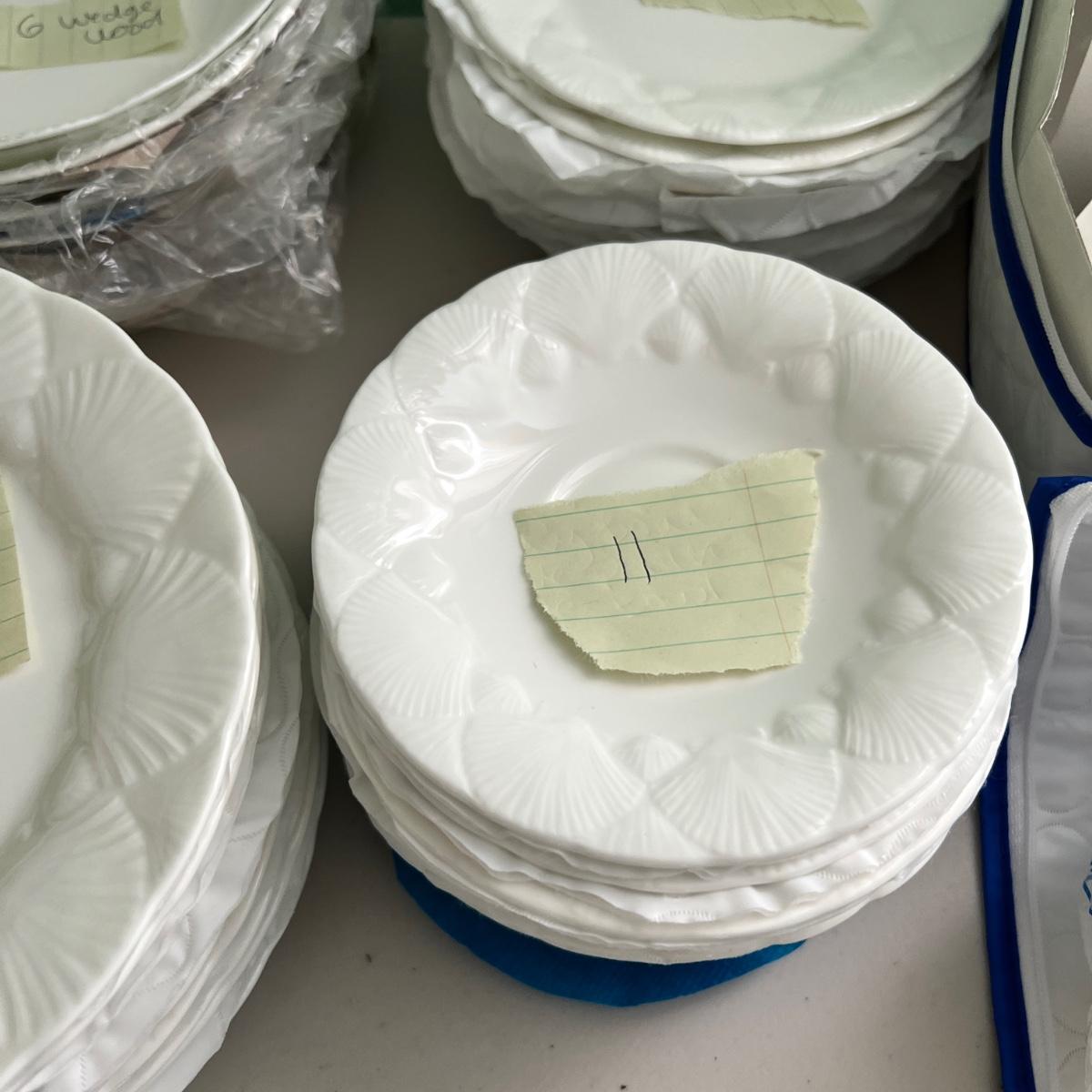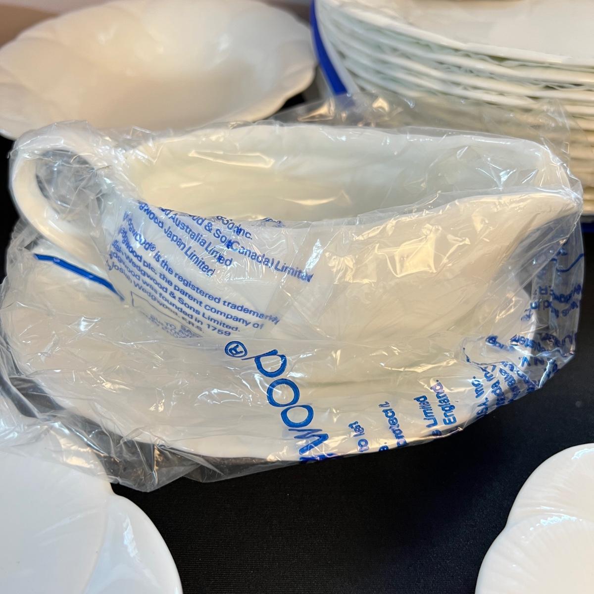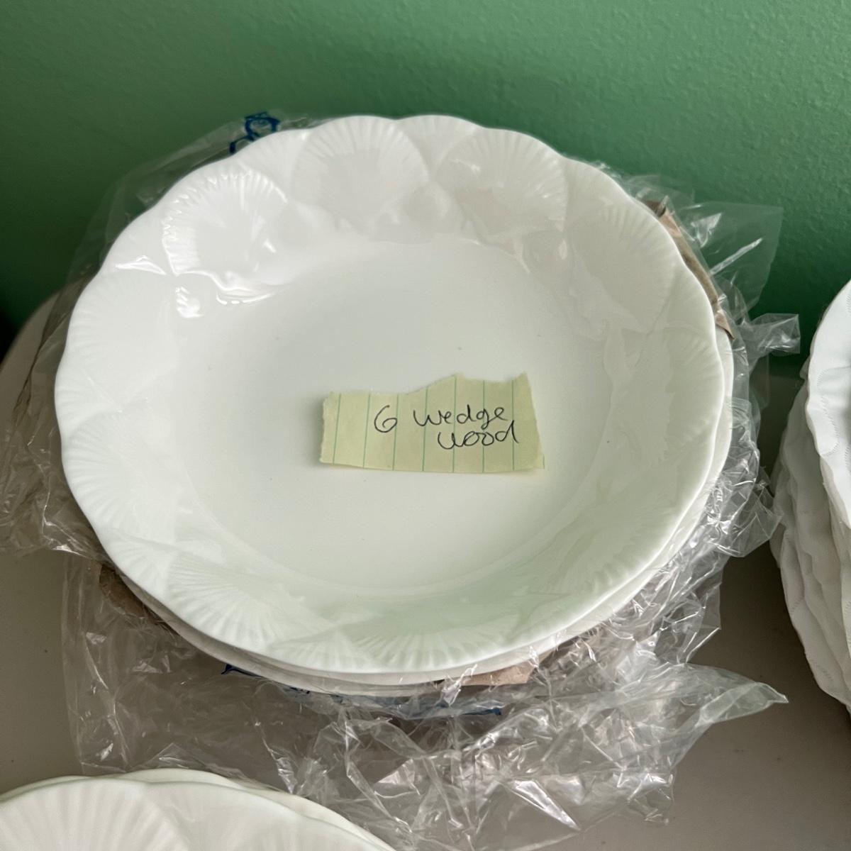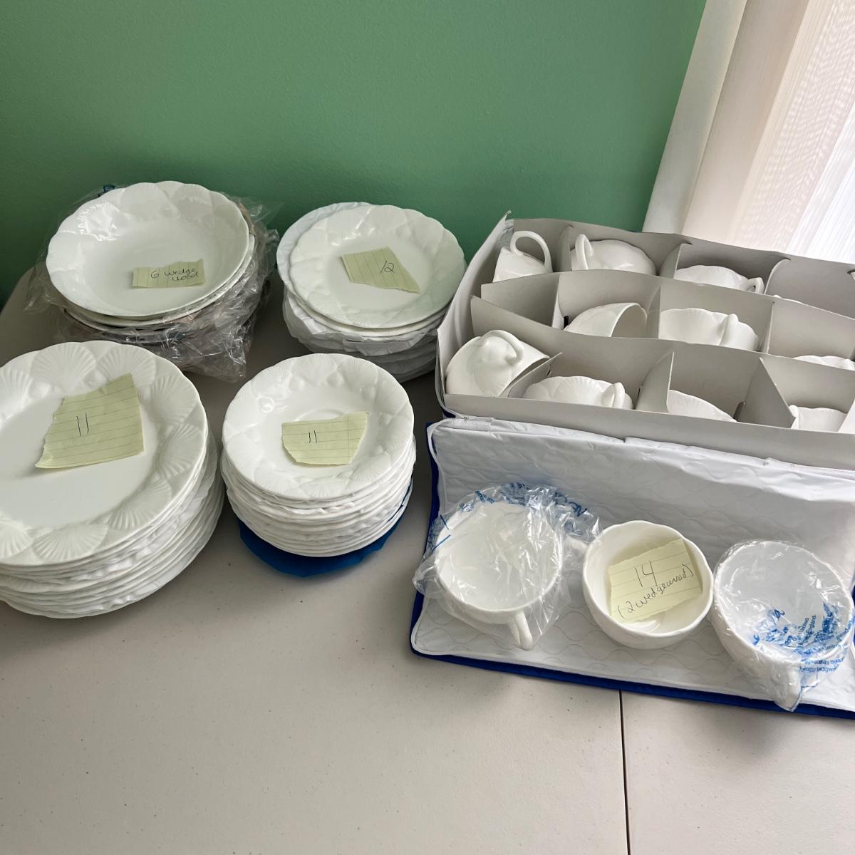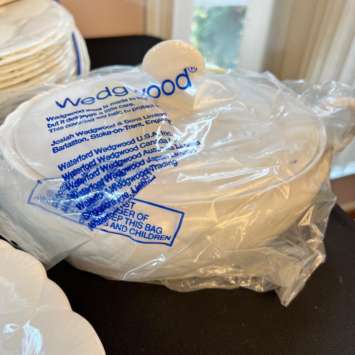 Pristine Wedgewood "Oceanside" white seashell dinnerware set including 12 dinner plates, 1 covered bowl with seashell handle, 1 gravy boat, 1 gravy plate, 1 platter, 1 cream, 1 sugar, 2 serving bowls, 1 serving plate, 14 tea cups, 11 tea cup plates, 6 bowls, 11 dinner plates, 12 bread plates totaling 75 pieces. NOTE: PICK UP ONLY IN DUNKIRK MD.