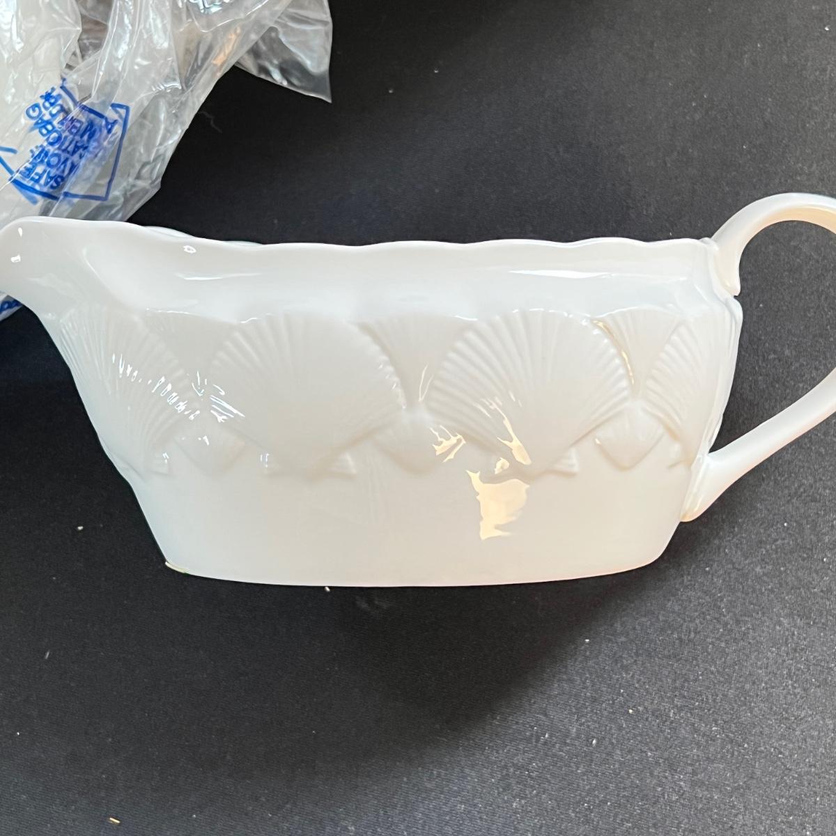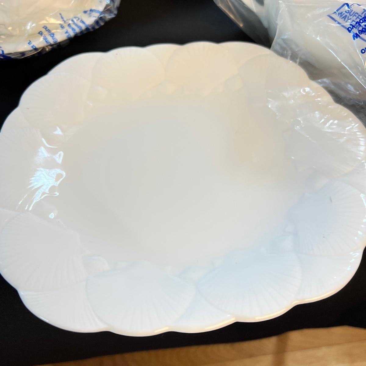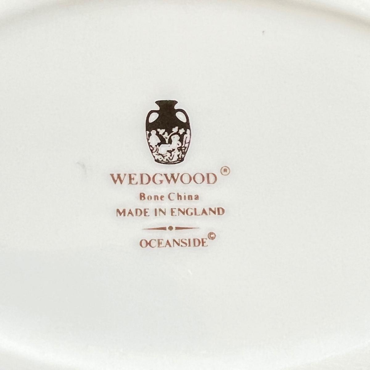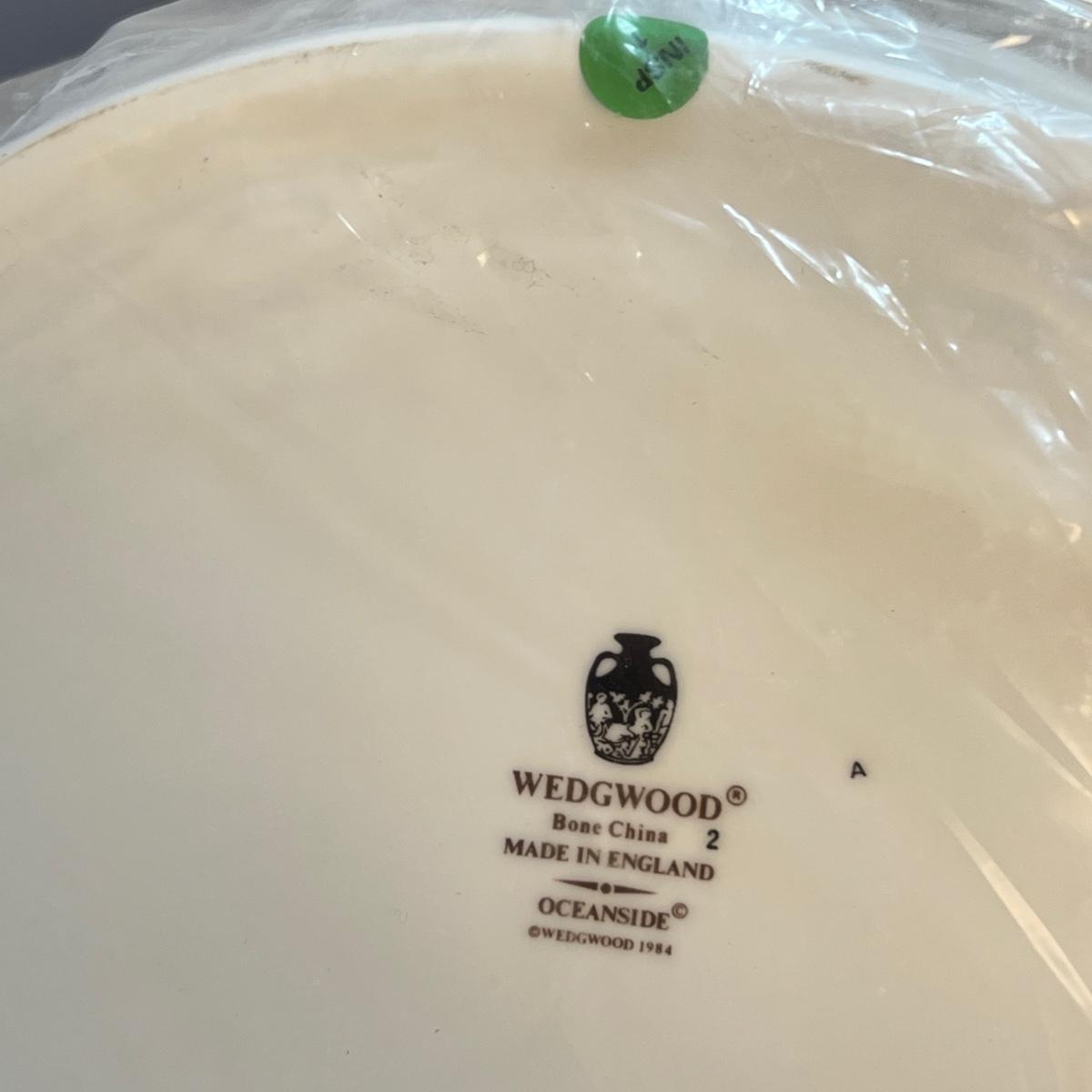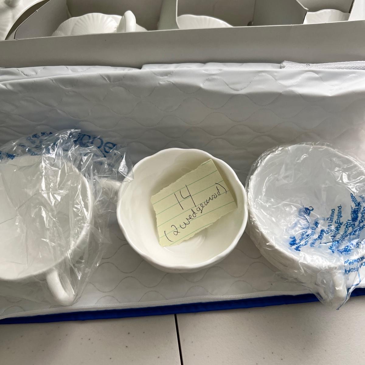 Pristine Wedgewood "Oceanside" white seashell dinnerware set including 12 dinner plates, 1 covered bowl with seashell handle, 1 gravy boat, 1 gravy plate, 1 platter, 1 cream, 1 sugar, 2 serving bowls, 1 serving plate, 14 tea cups, 11 tea cup plates, 6 bowls, 11 dinner plates, 12 bread plates totaling 75 pieces. NOTE: PICK UP ONLY IN DUNKIRK MD.