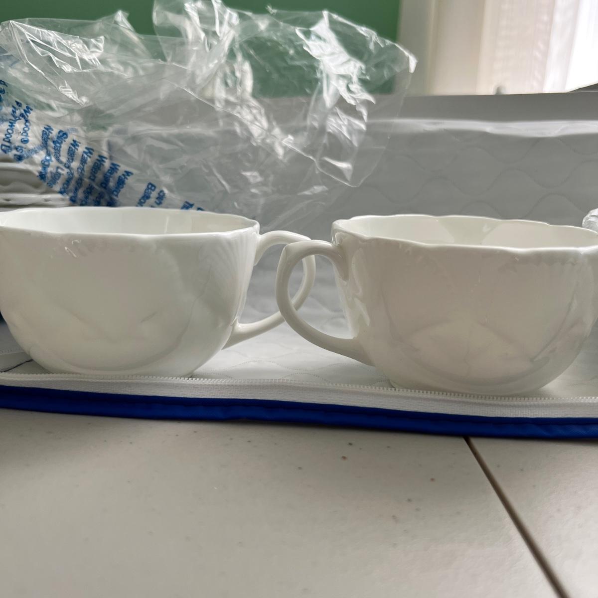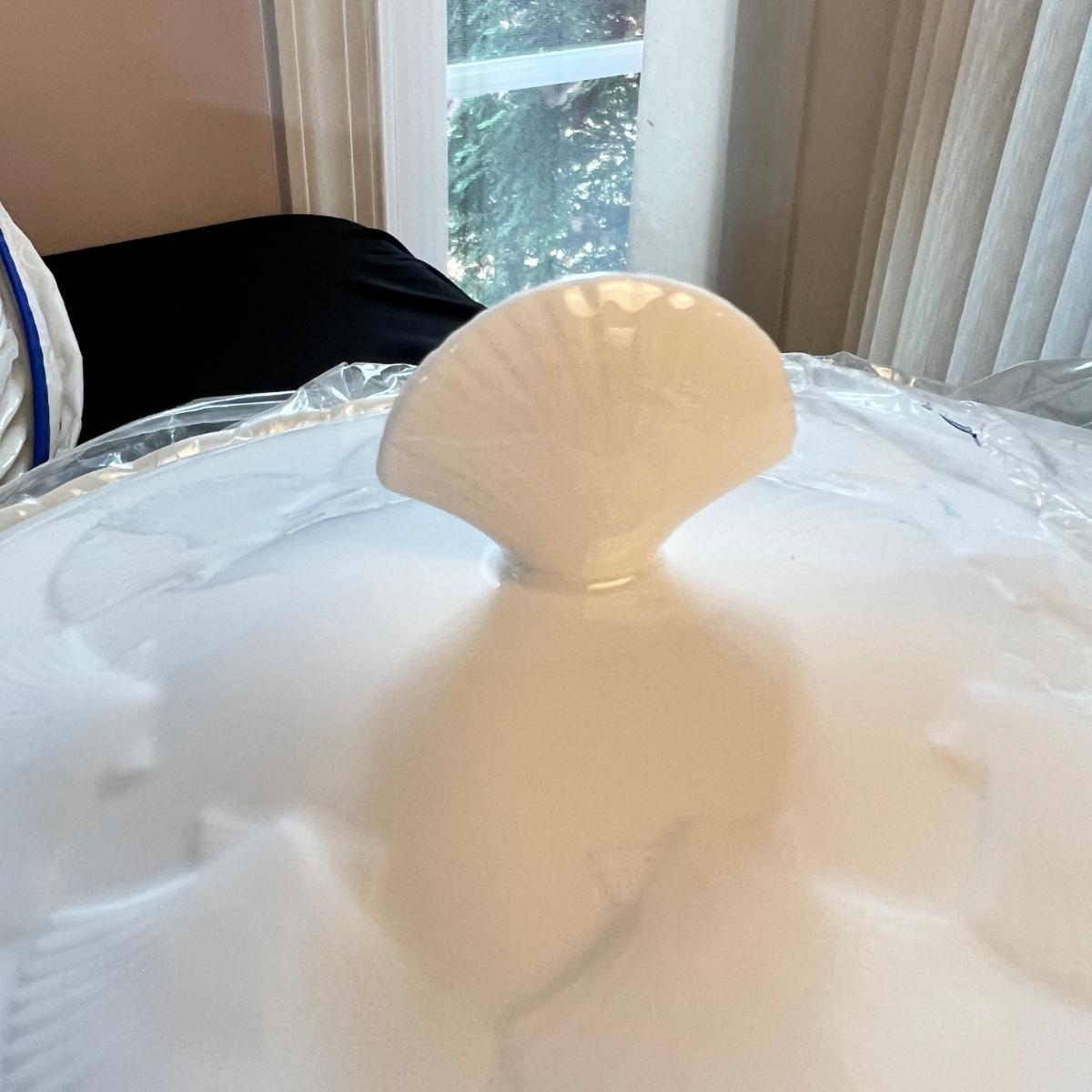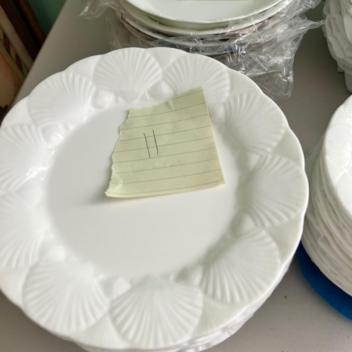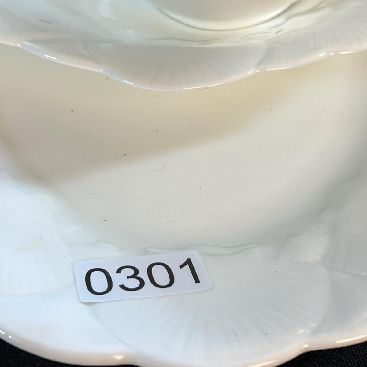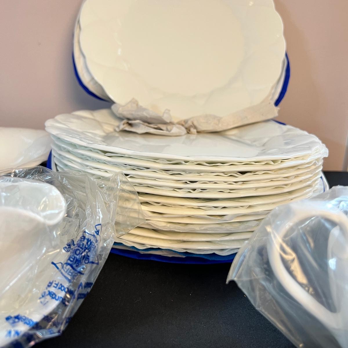 Pristine Wedgewood "Oceanside" white seashell dinnerware set including 12 dinner plates, 1 covered bowl with seashell handle, 1 gravy boat, 1 gravy plate, 1 platter, 1 cream, 1 sugar, 2 serving bowls, 1 serving plate, 14 tea cups, 11 tea cup plates, 6 bowls, 11 dinner plates, 12 bread plates totaling 75 pieces. NOTE: PICK UP ONLY IN DUNKIRK MD.