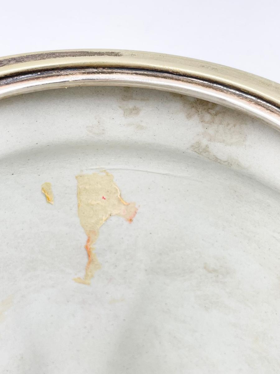 Beautiful piece! Does have some discoloration on the white relief, and wear plus some sticker residue on inside. Measures approx 5” tall (not including handle).