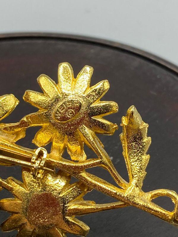 Vintage daisy enamel pin from Weiss. White petals with yellow cabochon centers. Very good vintage condition. Signed on the back. About 3" size.
