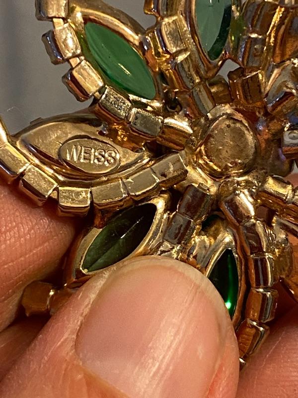 Beautiful vintage Weiss brooch. Blue green starburst flower shape. Small AB rhinestone with faceted and smooth glass stones. About 2" size. Signed on the back.