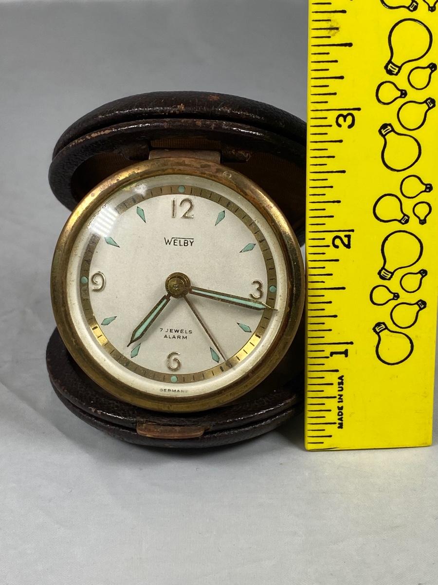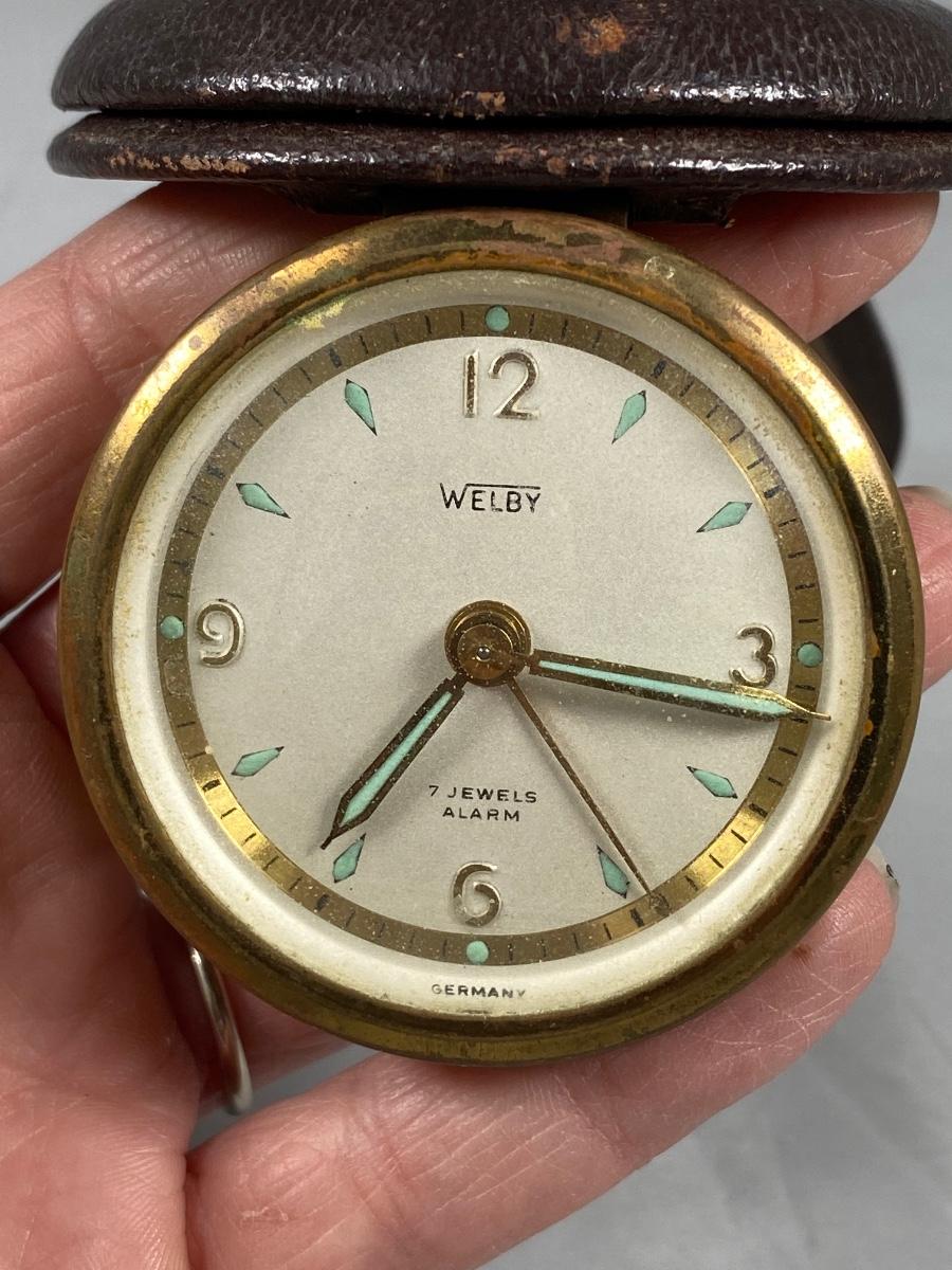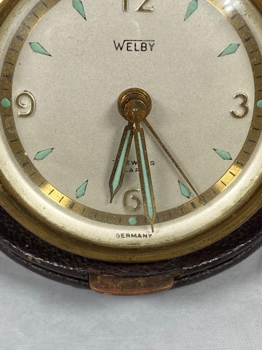 Vintage Welby travel alarm clock. Made in Germany. 7 jewels. Clock does work when you wind it, but there is an issue with the alarm working properly, it will good off if moved around even when it is not supposed to, but alarm does work. Face is in good vintage condition, there is wear to the case.