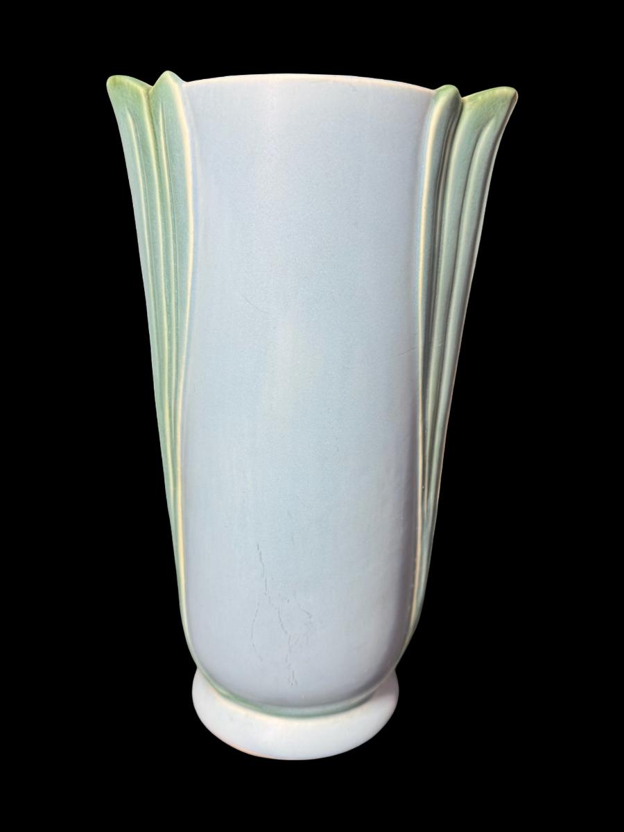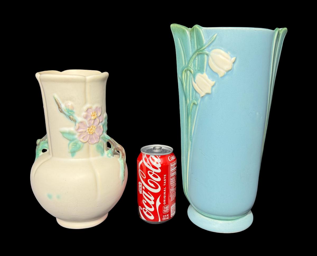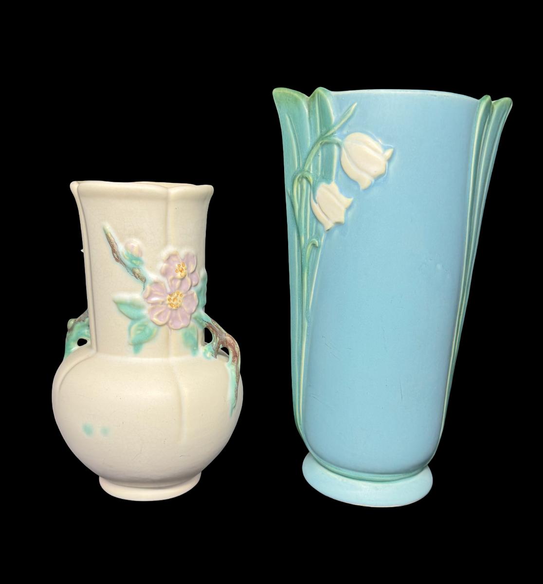 Includes a “Lily of the Valley” vase, and a “Wild Rose” vase. 1930s design. Age related wear, including some crazing. Measurement of tallest: 12”H. Pre-auction estimate: $100-$200. [LD]