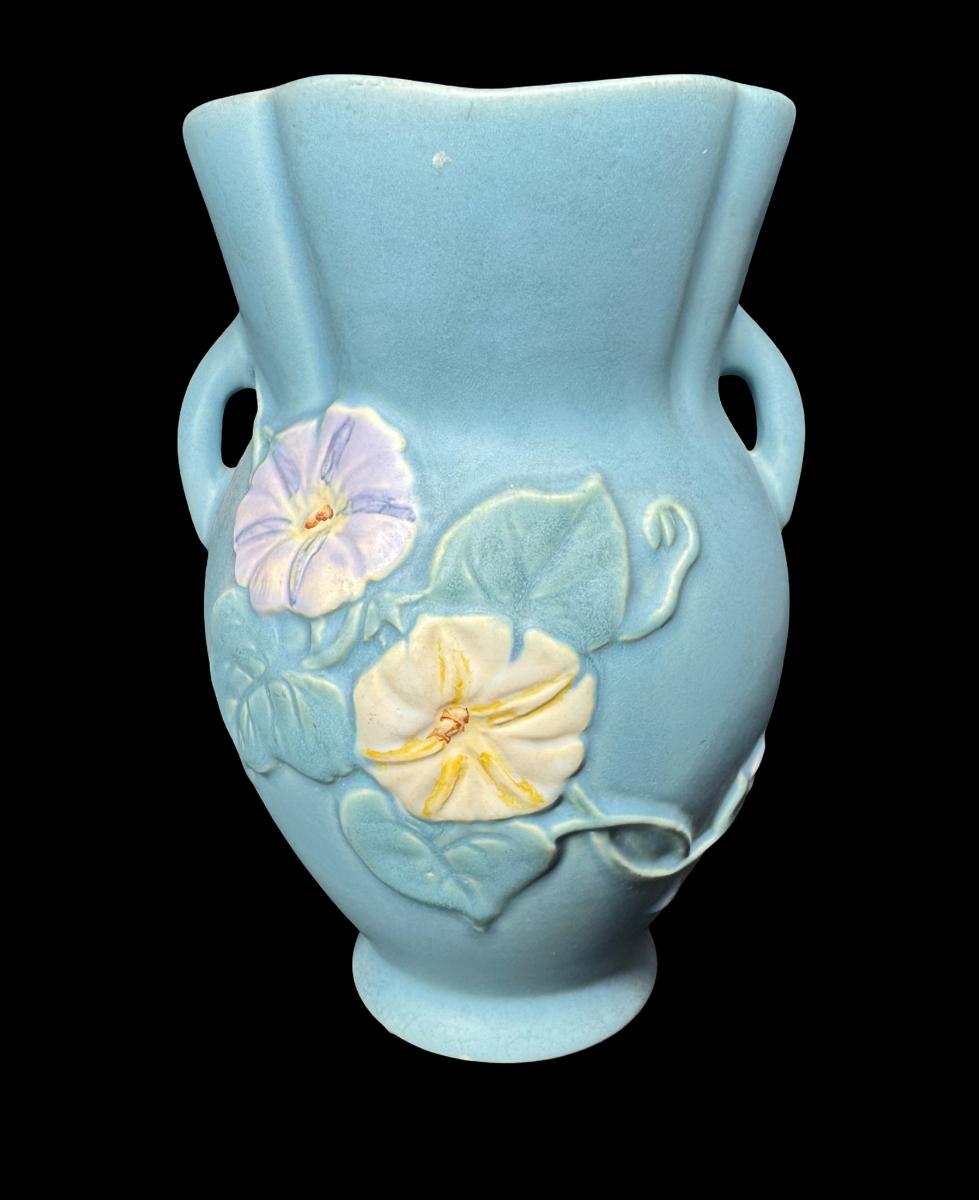 Most likely from the 1930s. Matte blue glaze with hand painted morning glory blossoms. Age related wear. Measurement: 9”H x 6”W. Pre-auction estimate: $50-$100. [LD]